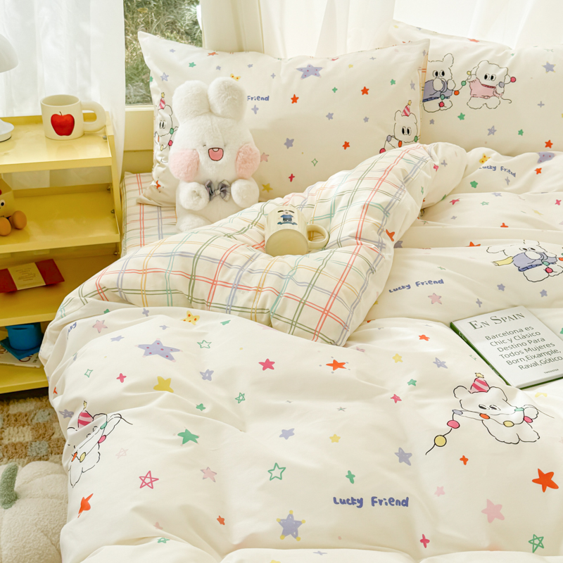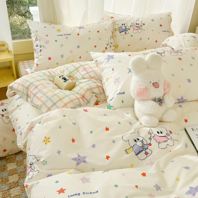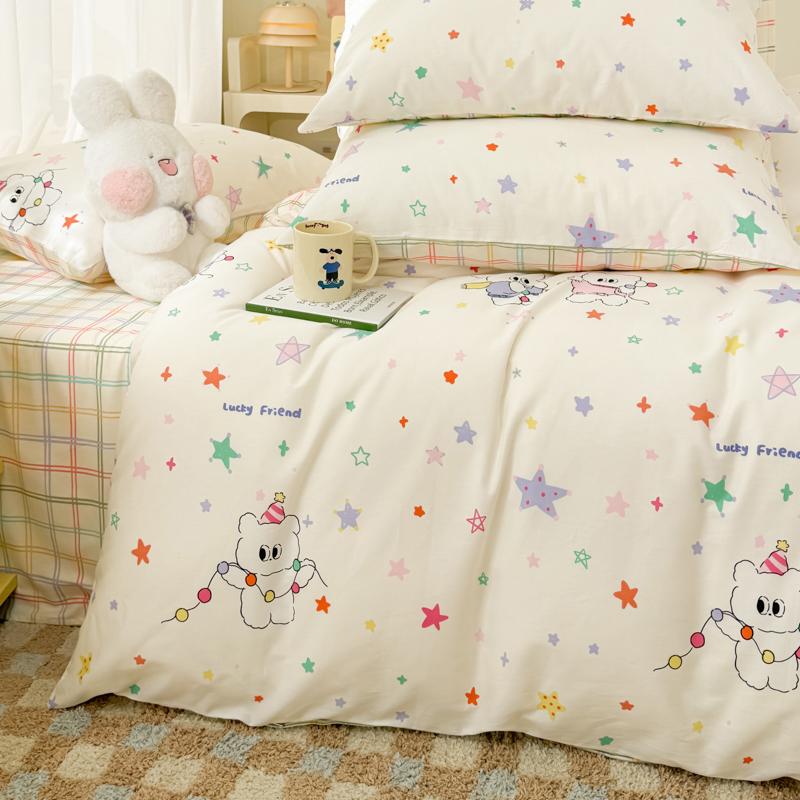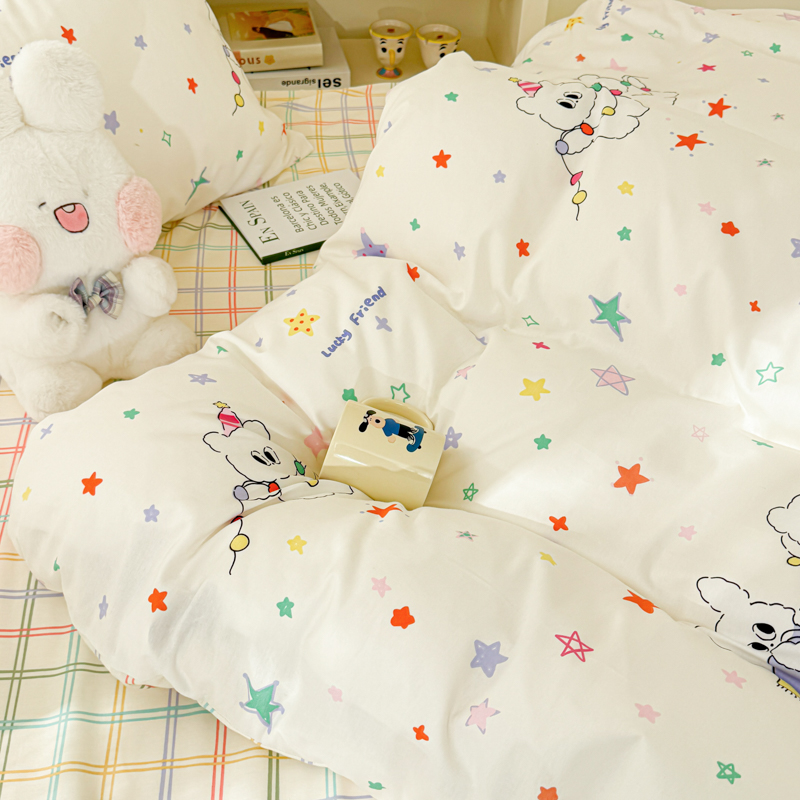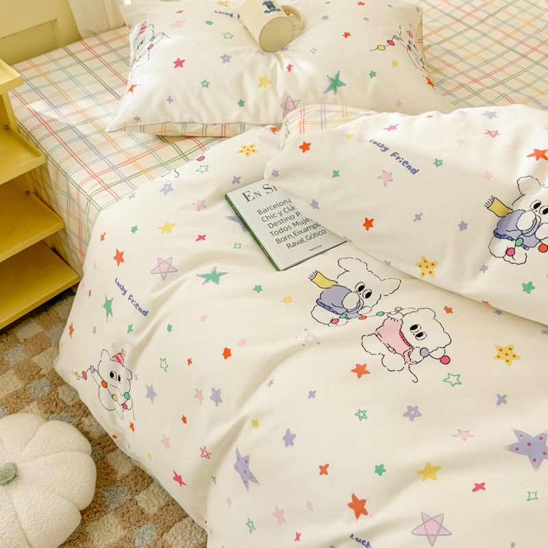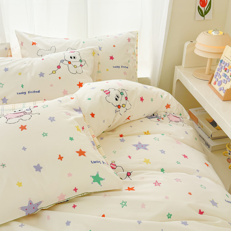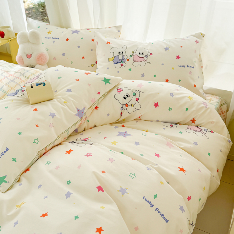 (总)呗旺鹿 2026新款全棉纯棉40支13070卡通印花四件套-场景二,萌星,鼻涕狗,果子象,机灵猫,可爱星人,幸福小熊