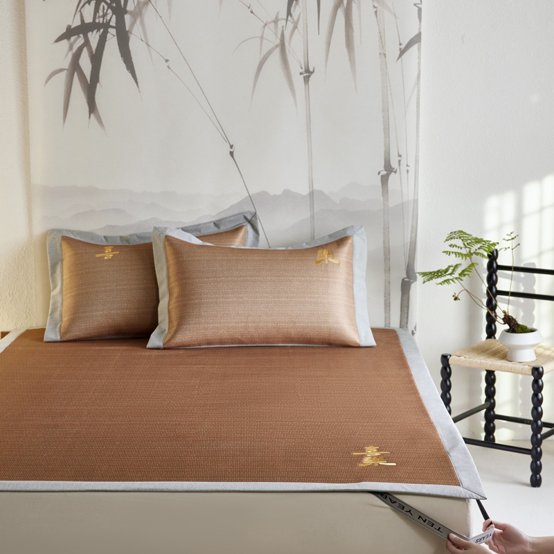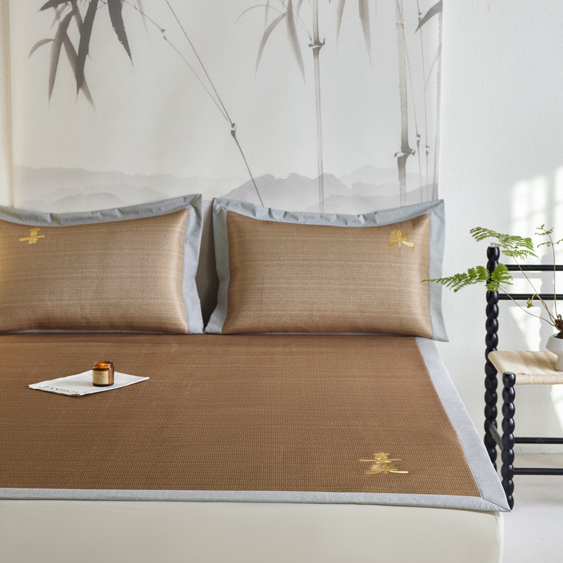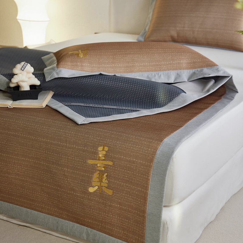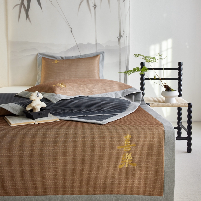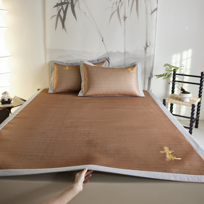 时年家纺 2024新款喜乐刺绣冰藤席 喜乐咖