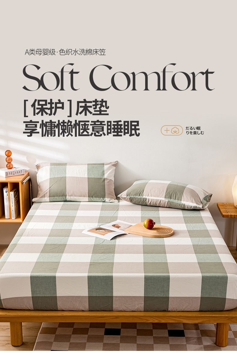 萌飞 2024新款A类色织水洗棉床笠 绿大格