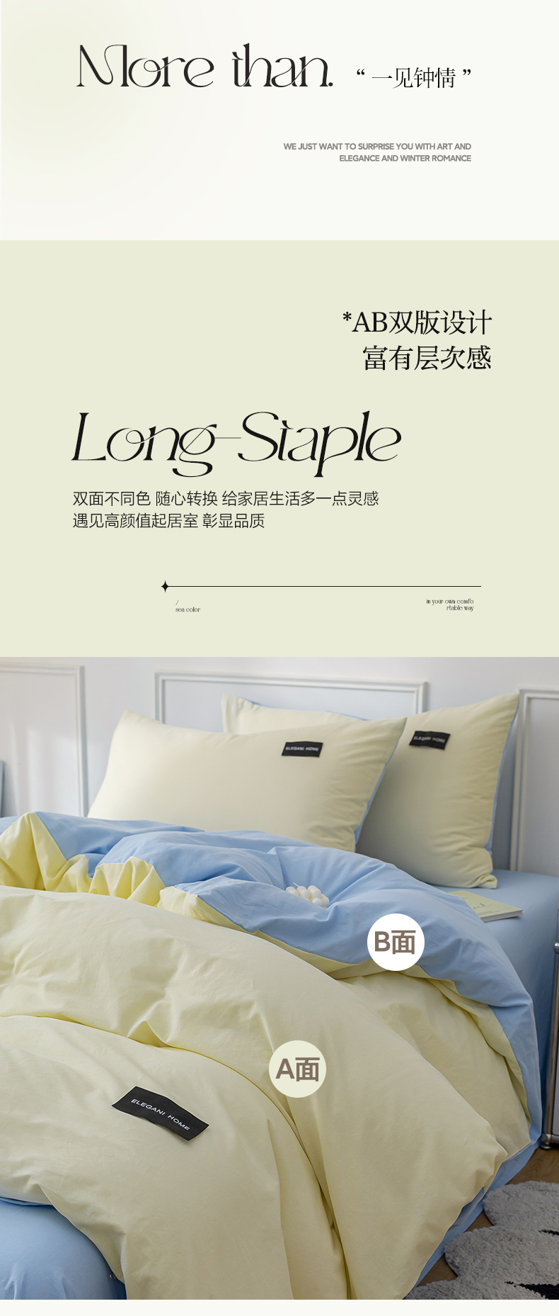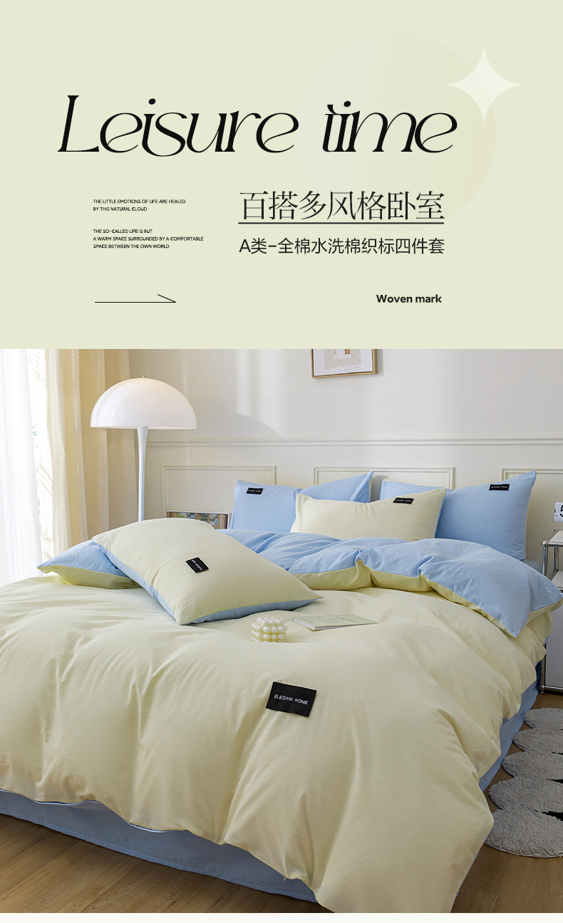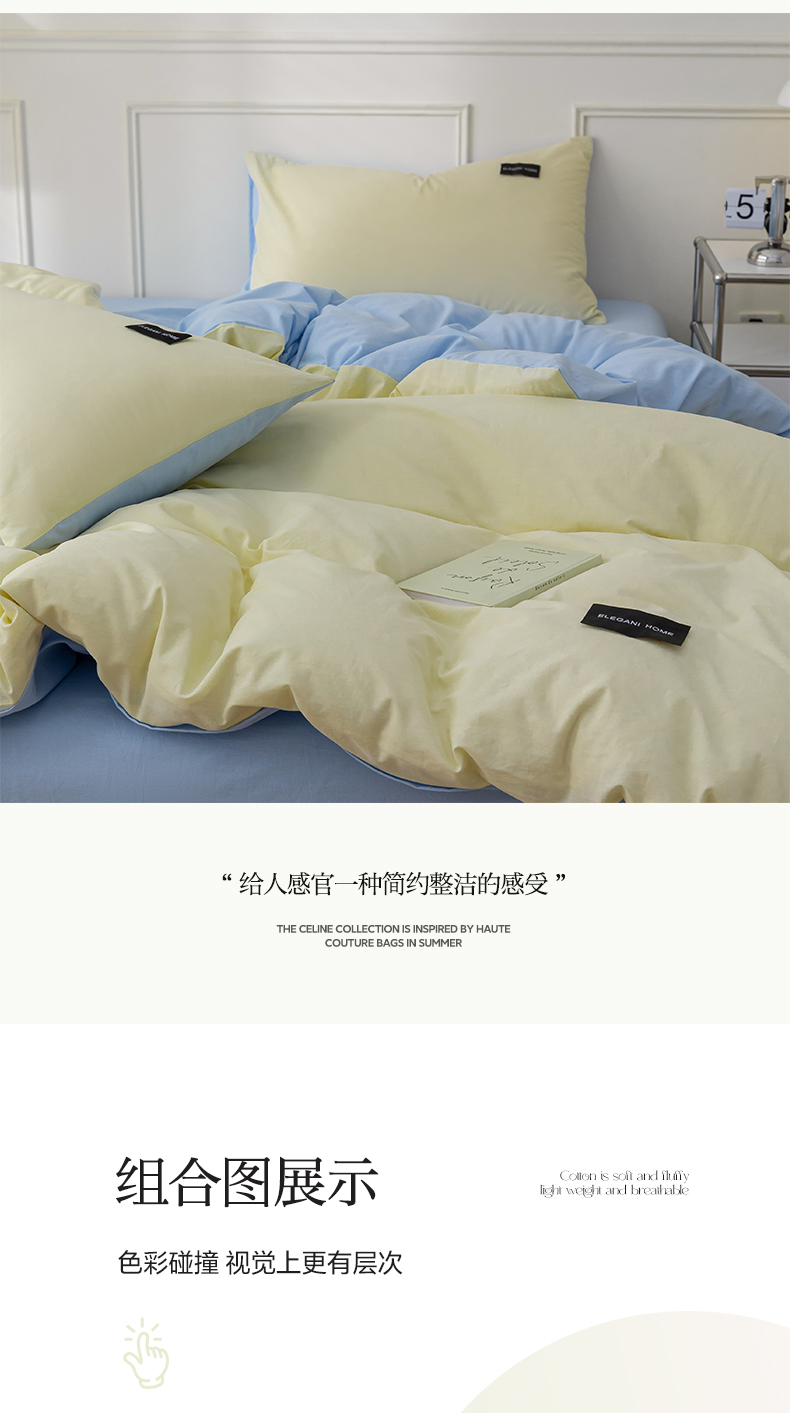 商品名称:九沐良品 新款纯色双拼四件套 简悠-暖光黄-蓝