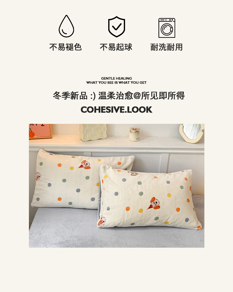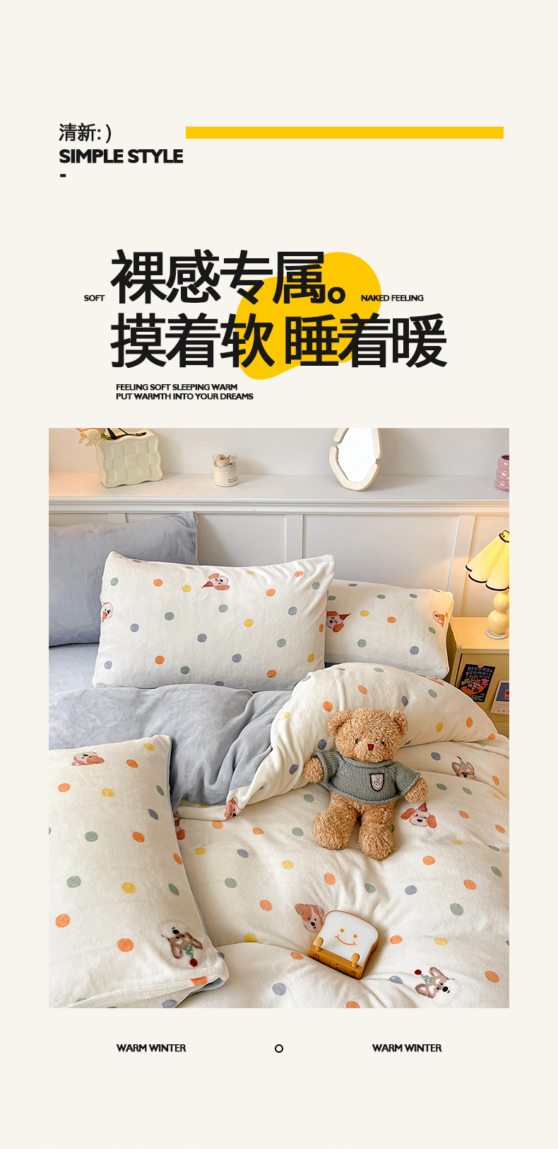 商品名称:桃子家居 2024新款小清新卡通加厚牛奶绒全工艺200克印花牛奶绒系列四件套 绒-泡泡狗