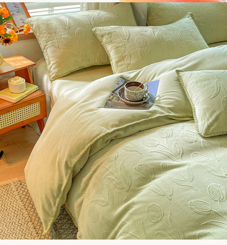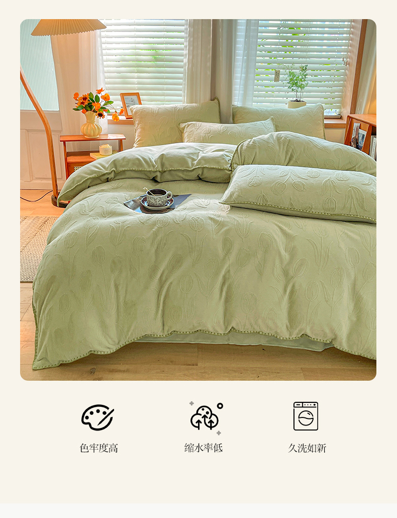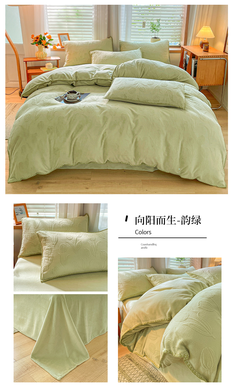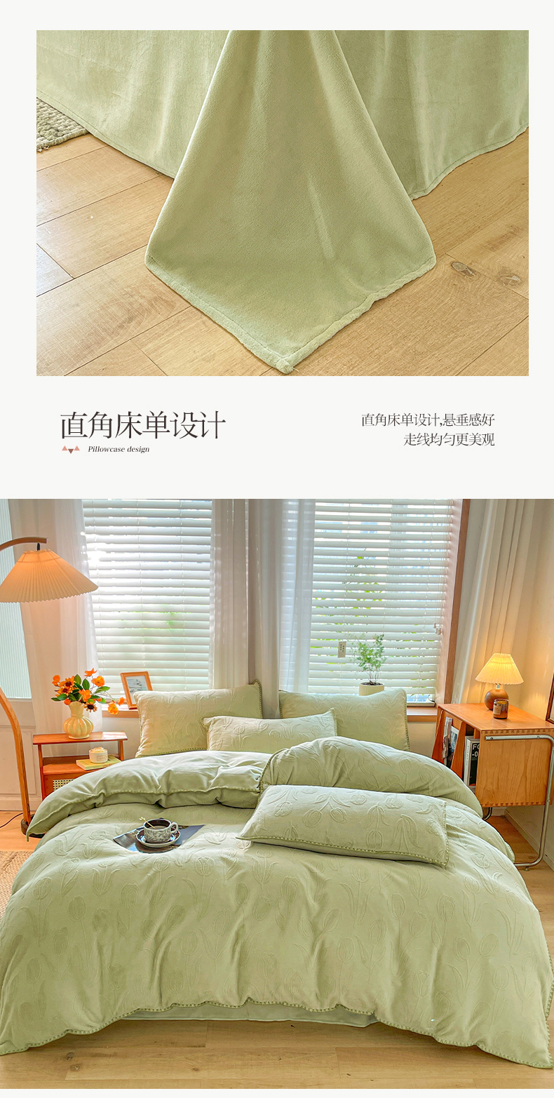 商品名称:2025新款A类烂花雕花高克重加厚牛奶绒四件套三角贝壳边(有买家秀提供)向阳而生-韵绿