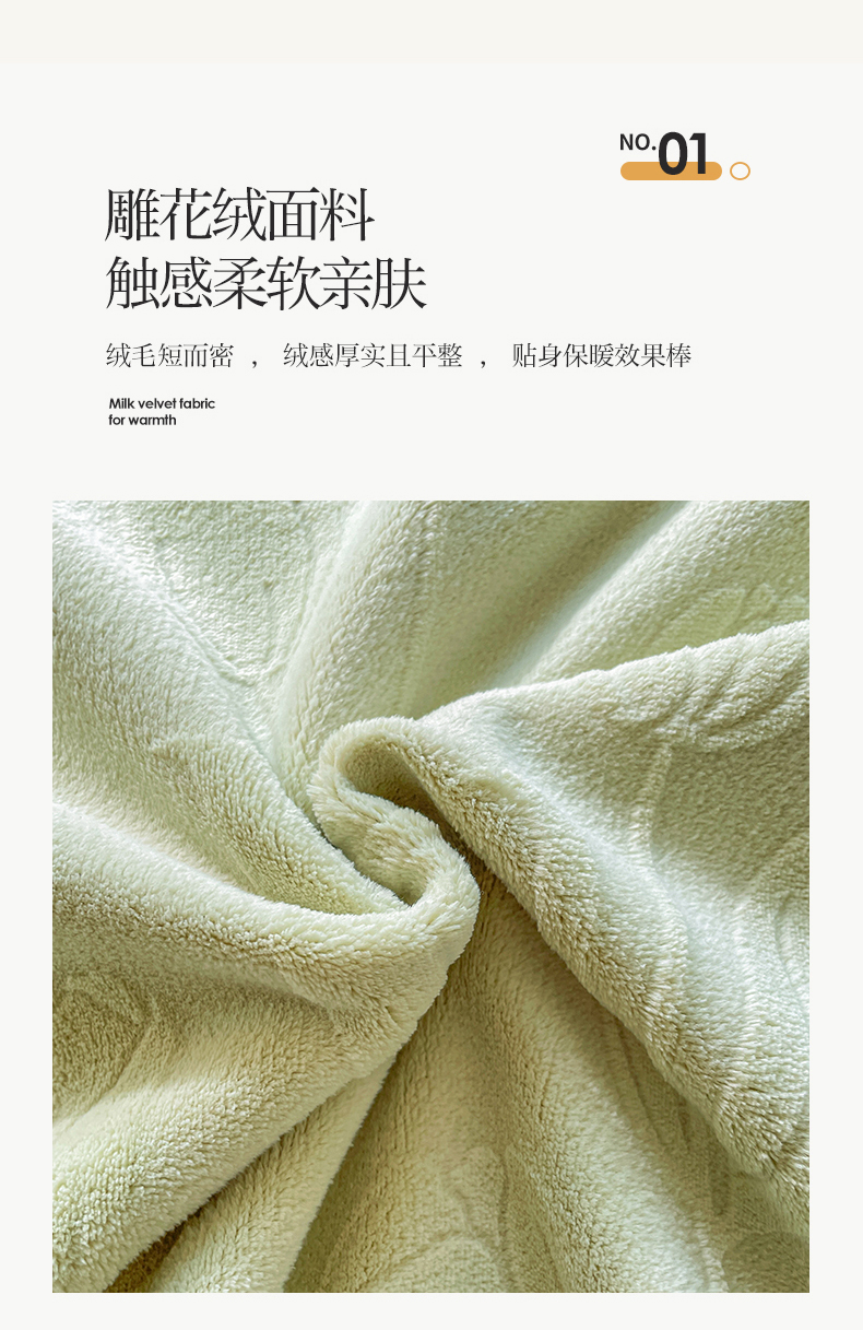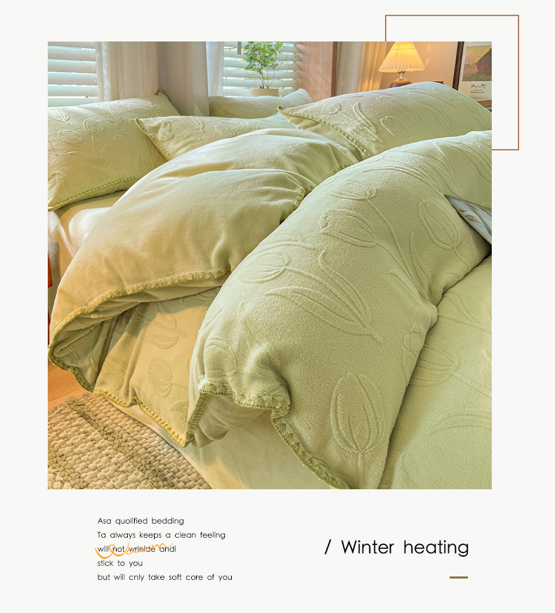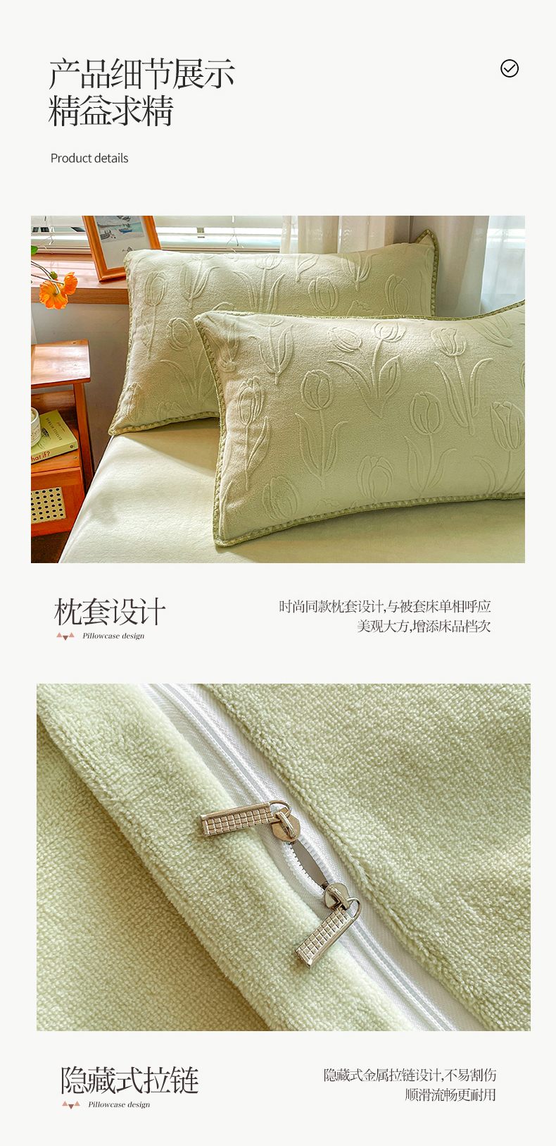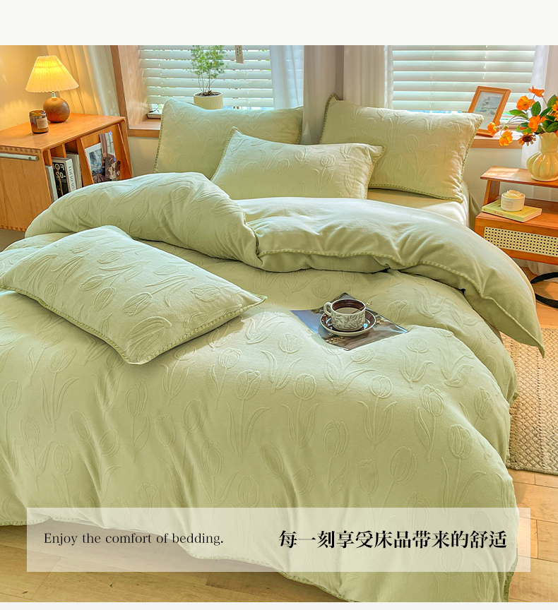 商品名称:2025新款A类烂花雕花高克重加厚牛奶绒四件套三角贝壳边(有买家秀提供)向阳而生-韵绿