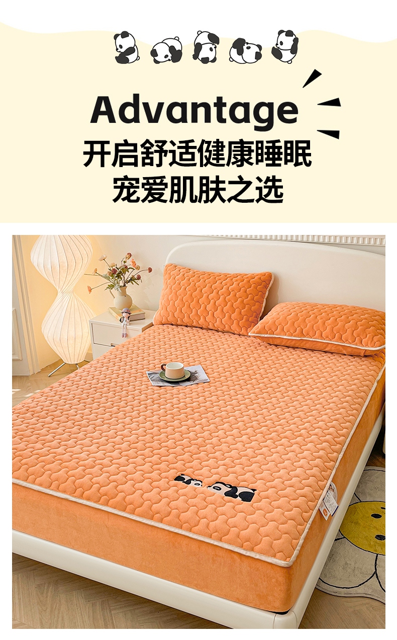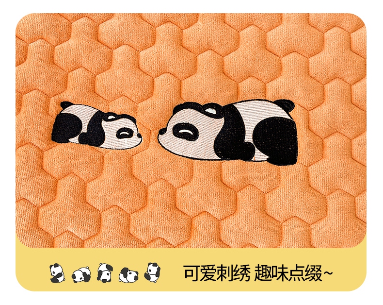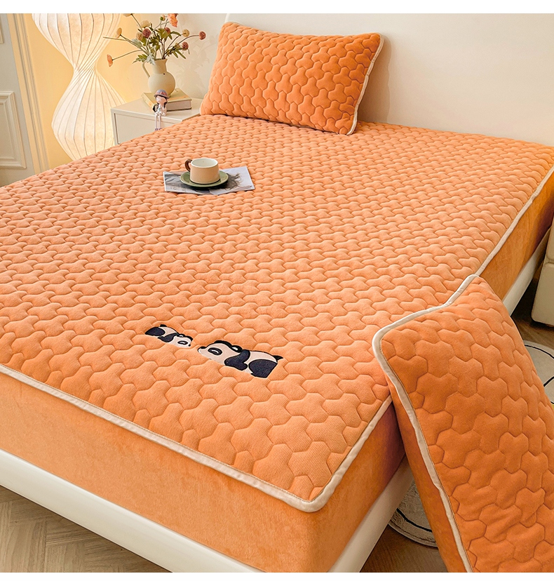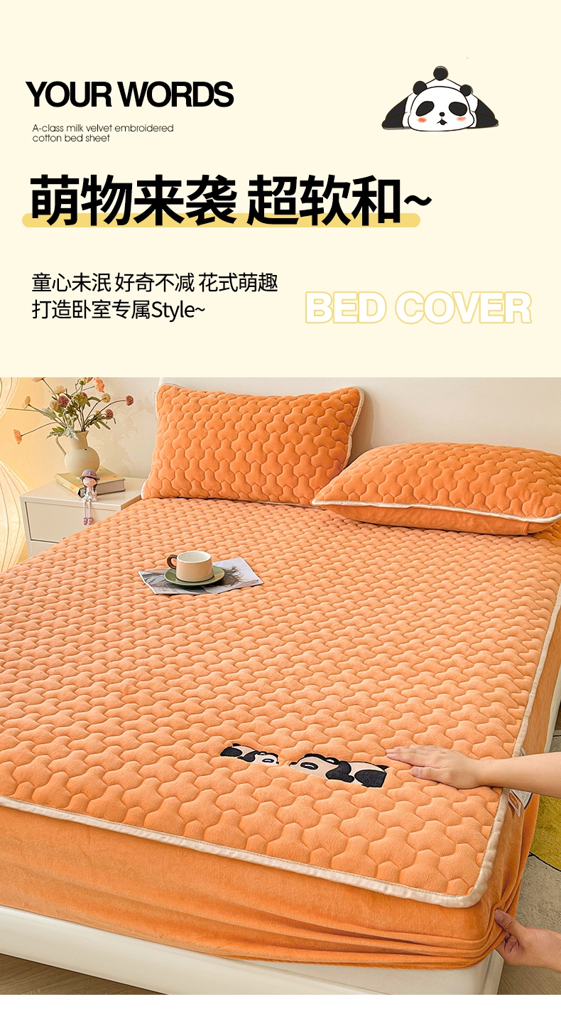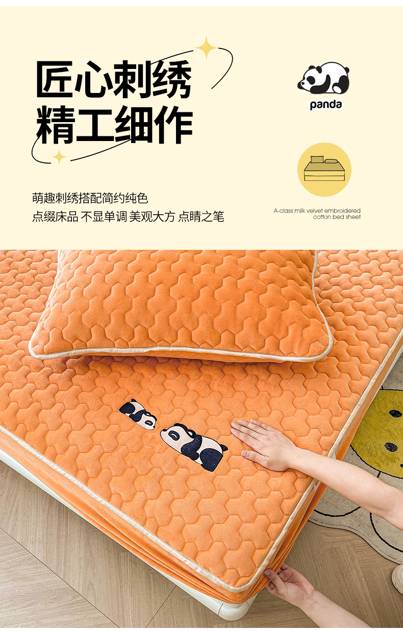 2024新款A类牛奶绒刺绣夹棉床笠-小熊猫 小熊猫-阳光橘