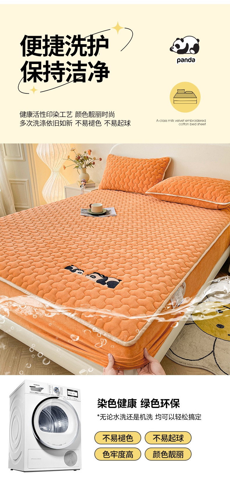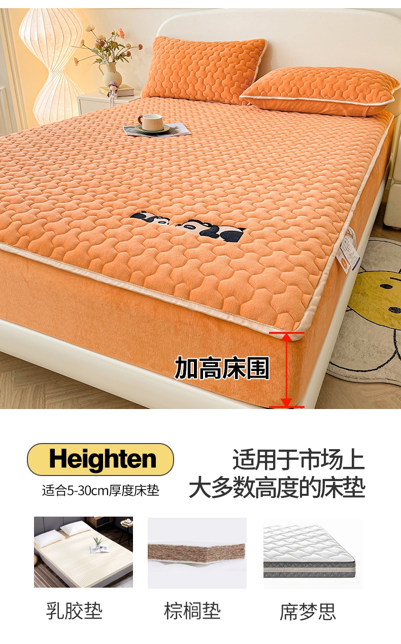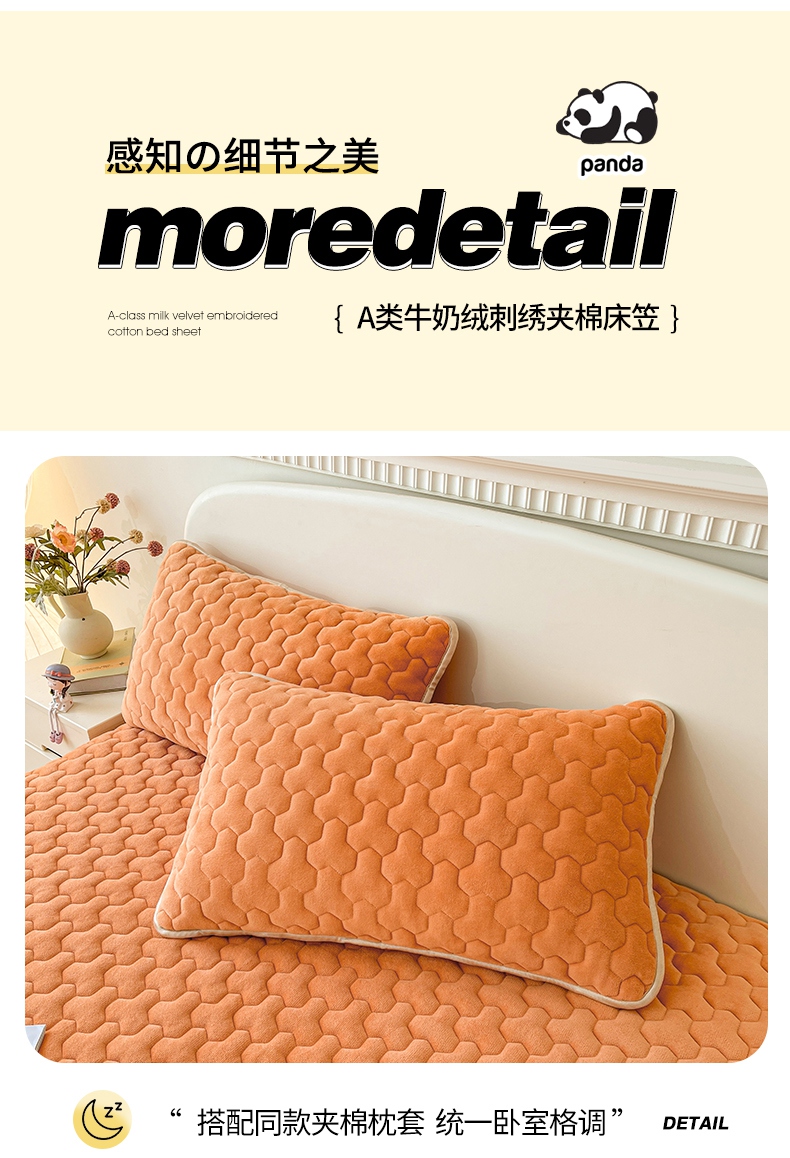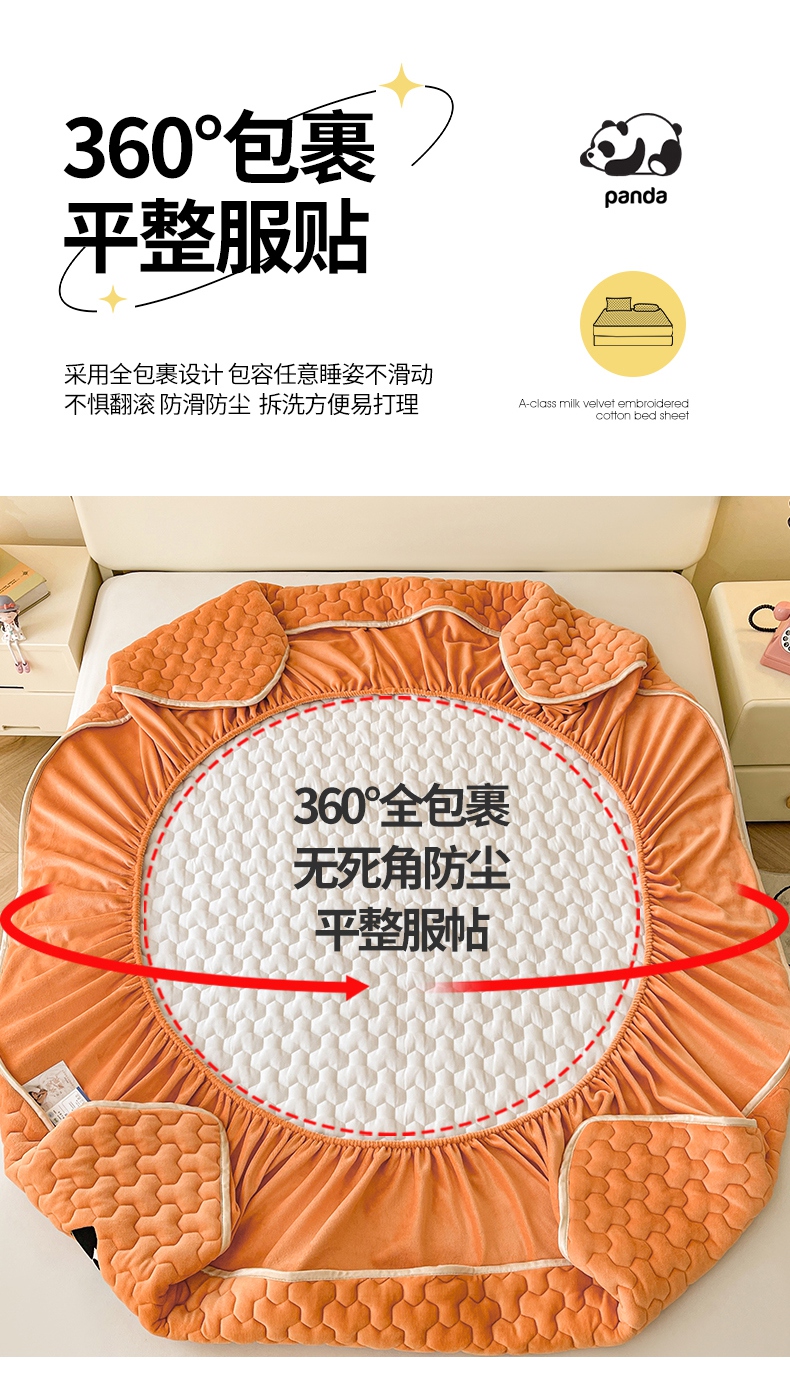 2024新款A类牛奶绒刺绣夹棉床笠-小熊猫 小熊猫-阳光橘
