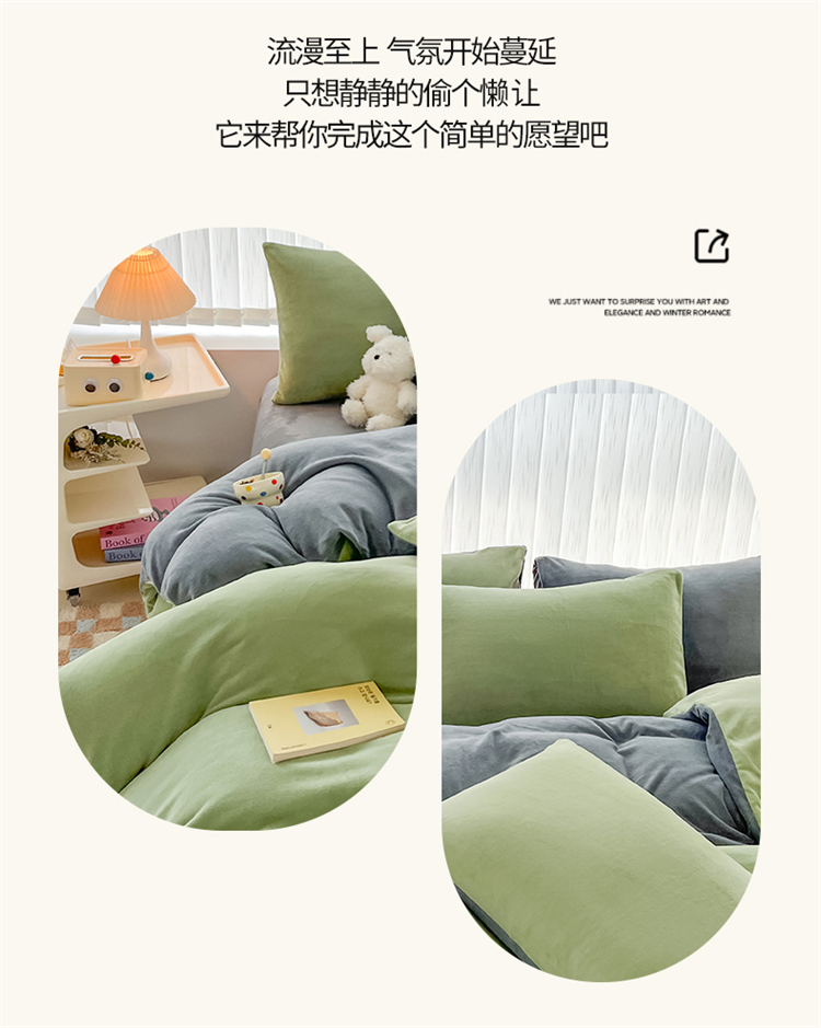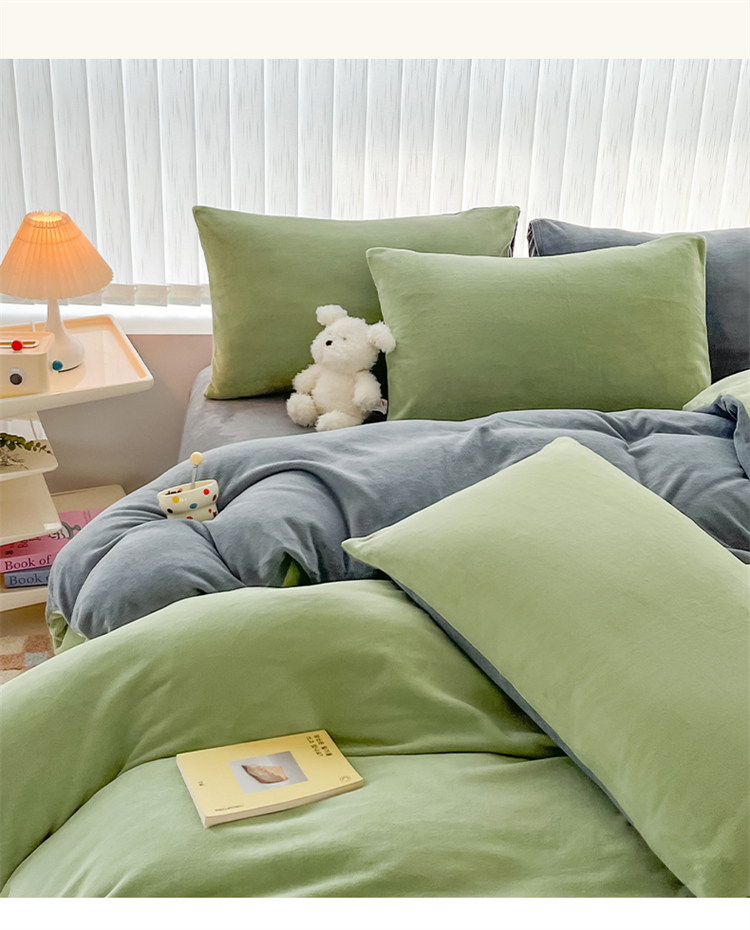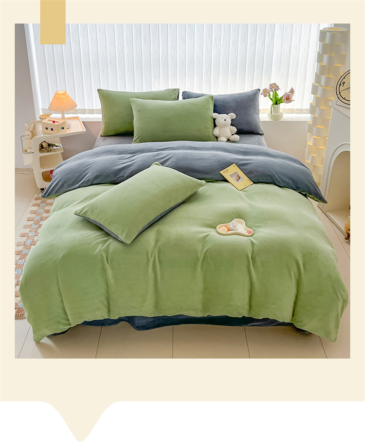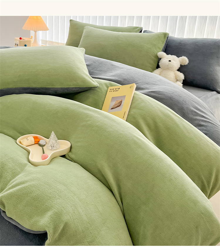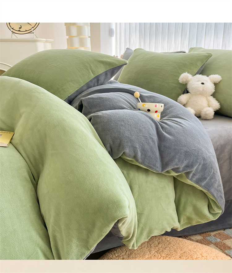 言熙居 2024新款纯色双拼30克8一9斤牛奶绒四件套 深绿拼浅灰