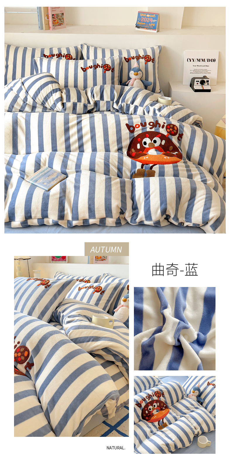 商品名称:丝羽坊 2024新款A类牛奶绒毛巾绣四件套-曲奇 曲奇-蓝