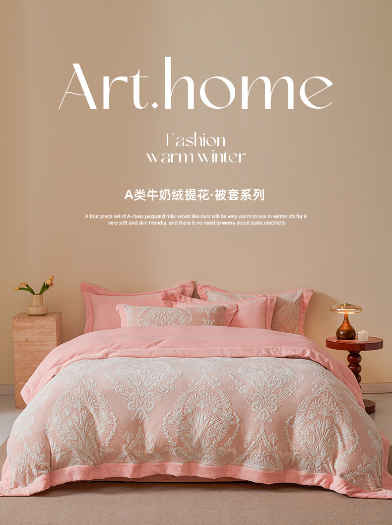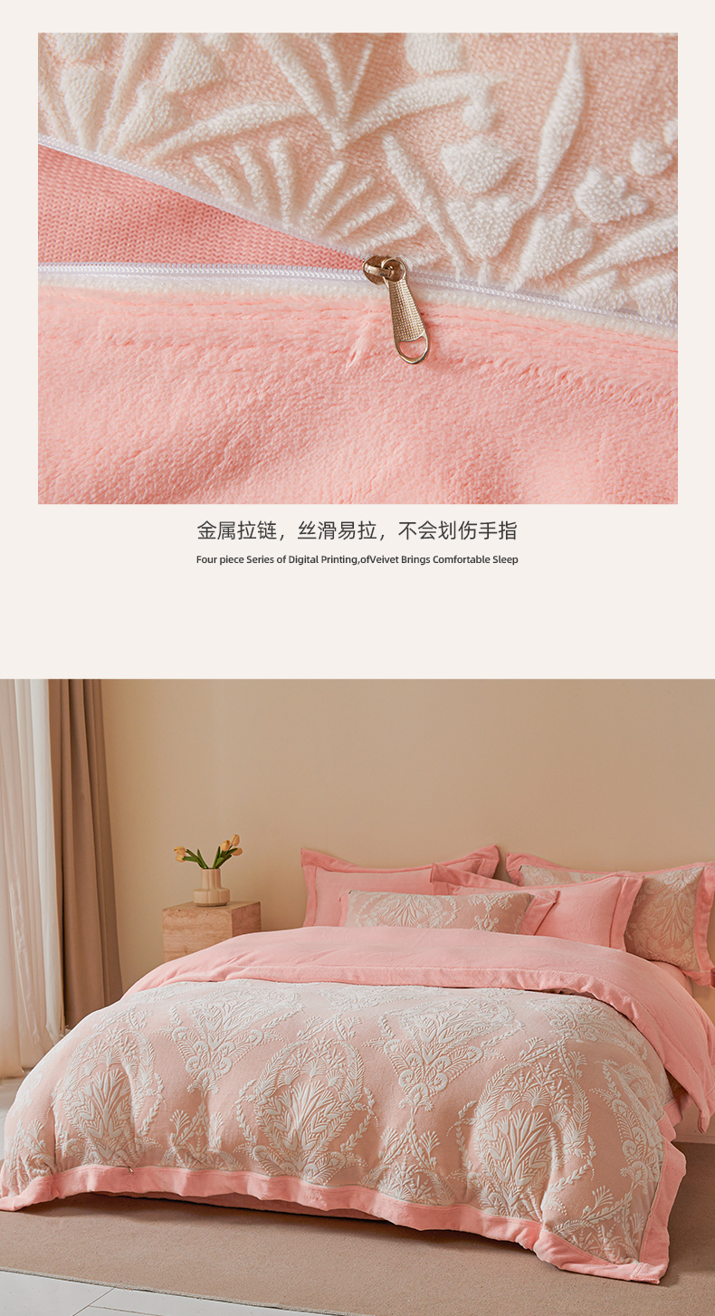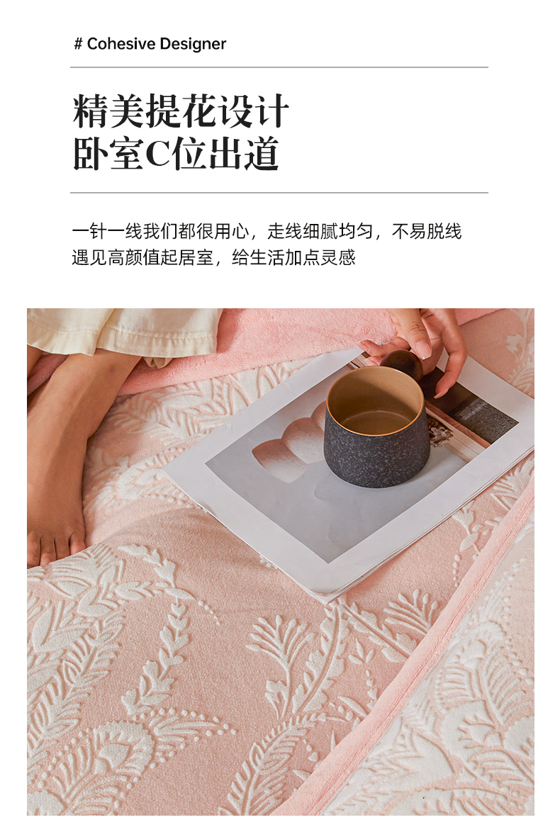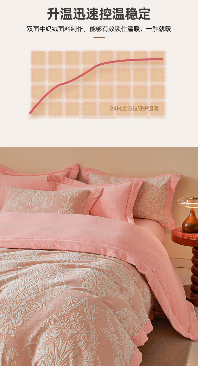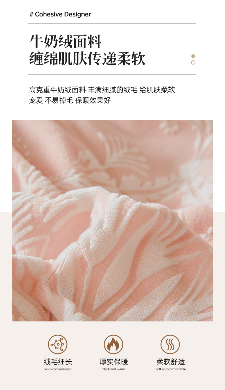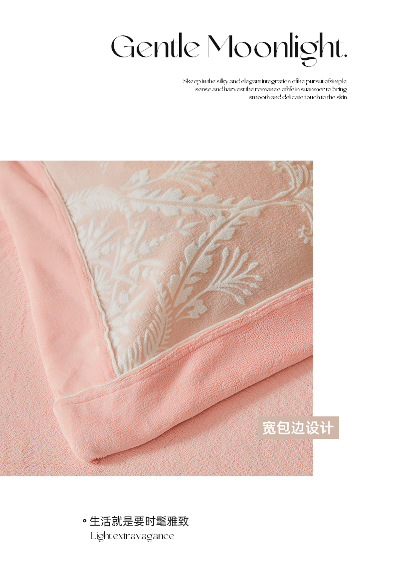 商品名称:全季家居 2024新款A类高克重5D立体浮雕宽边牛奶绒加厚保暖被套单件 芳草-粉