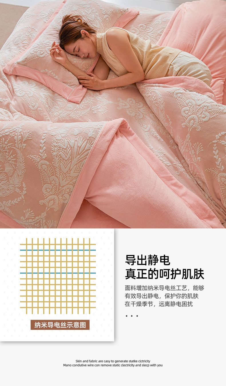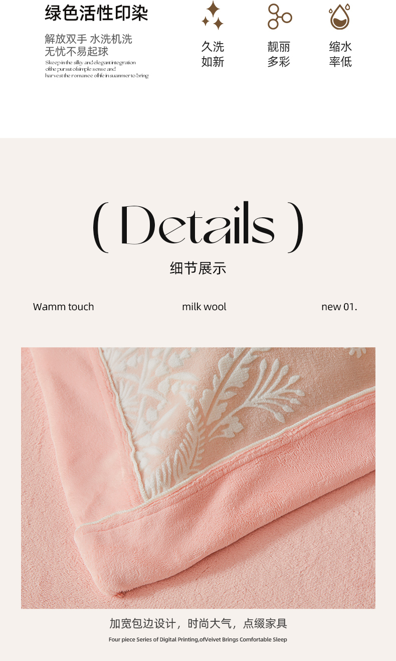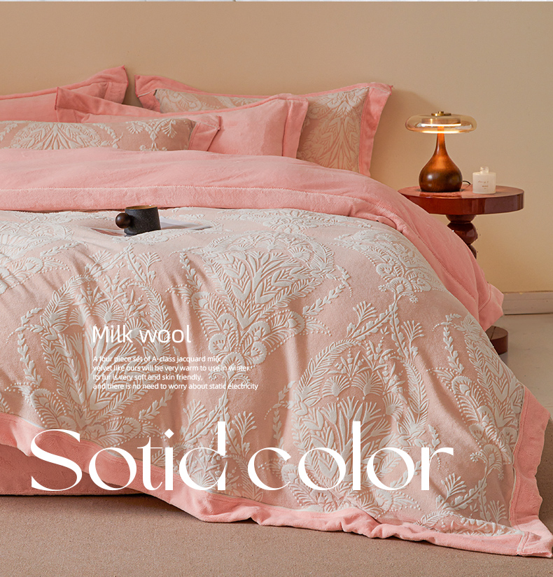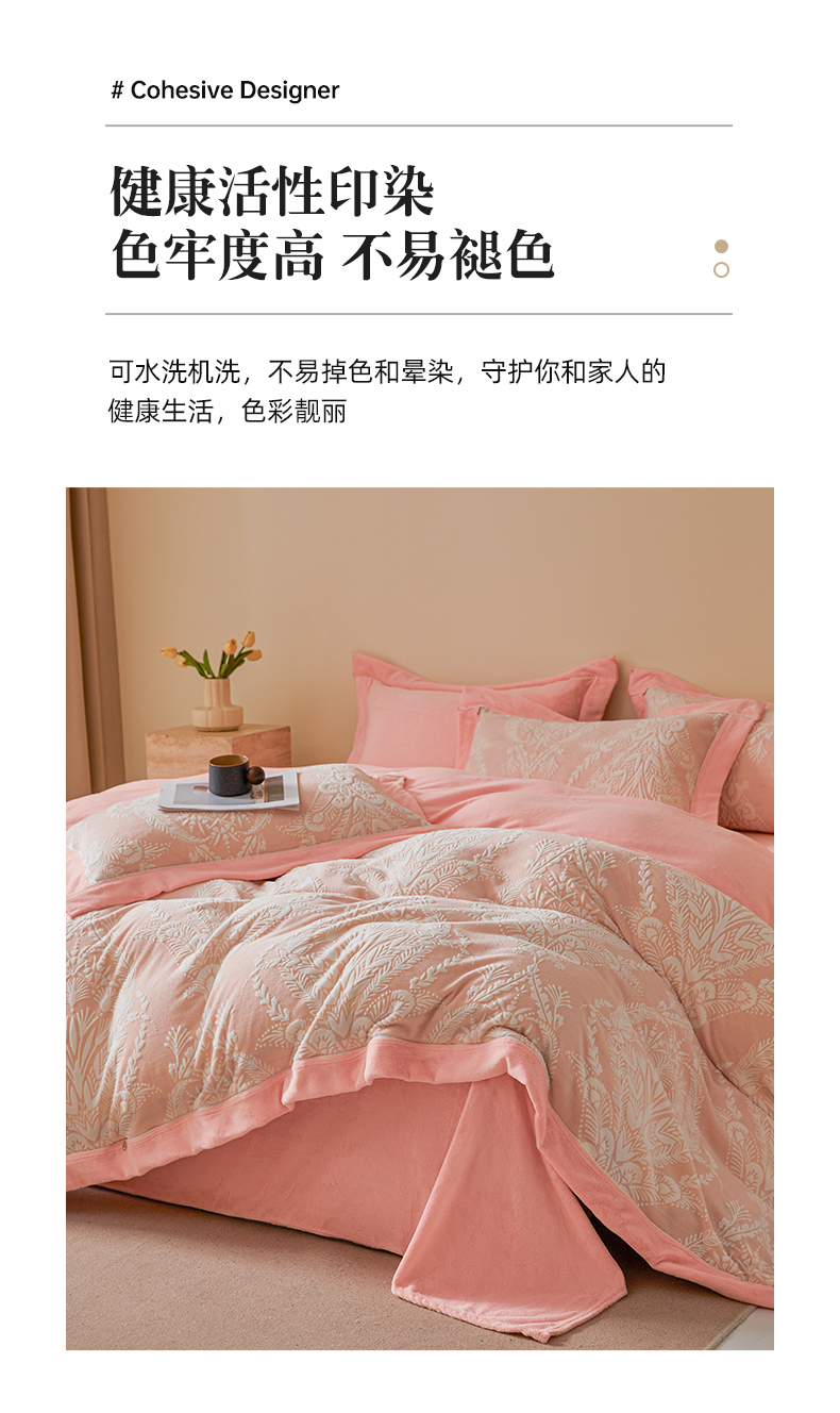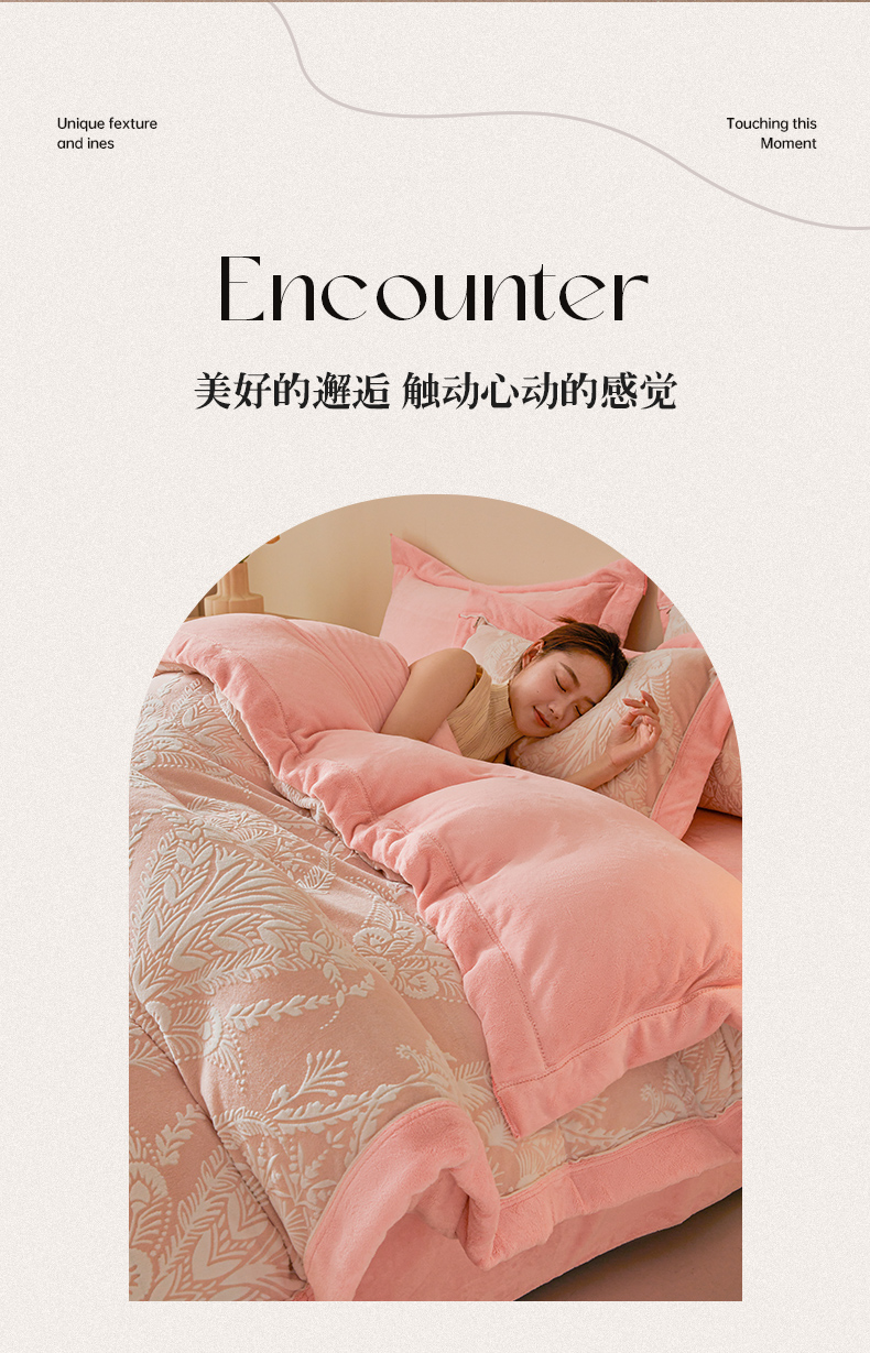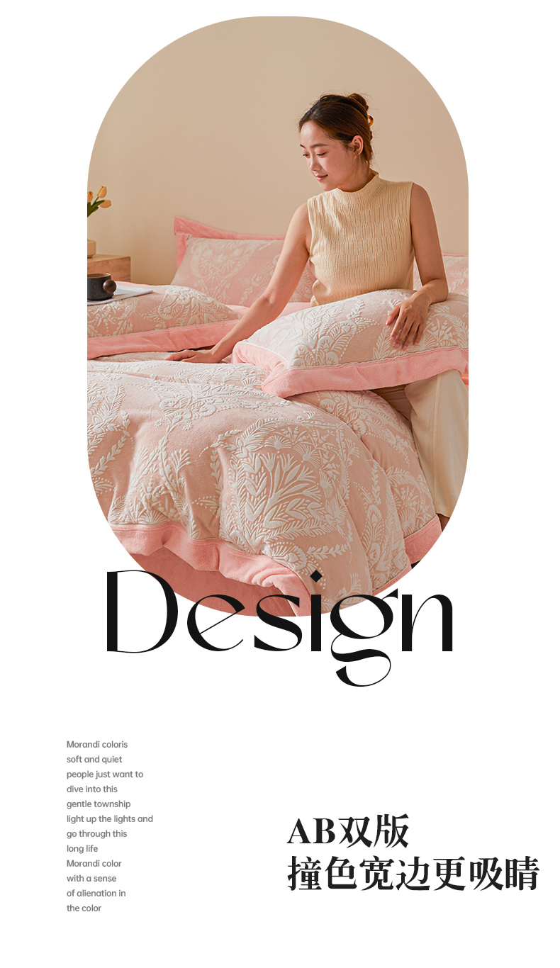 商品名称:全季家居 2024新款A类高克重5D立体浮雕宽边牛奶绒加厚保暖被套单件 芳草-粉