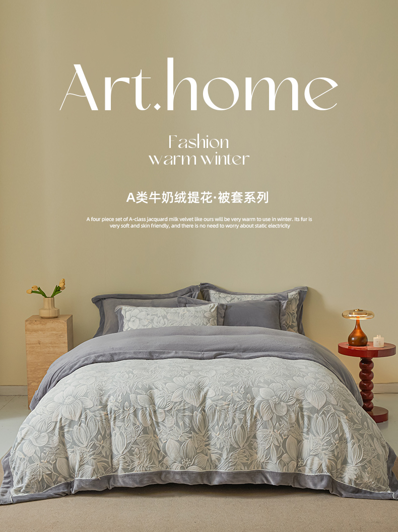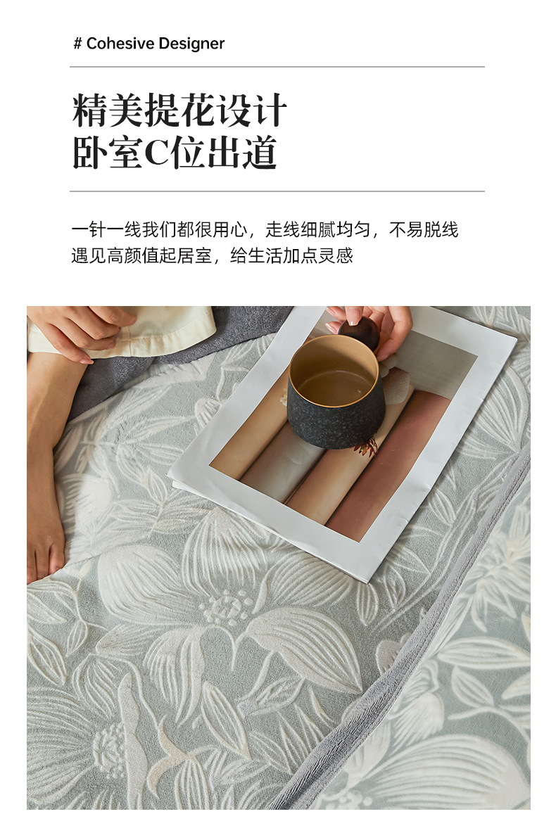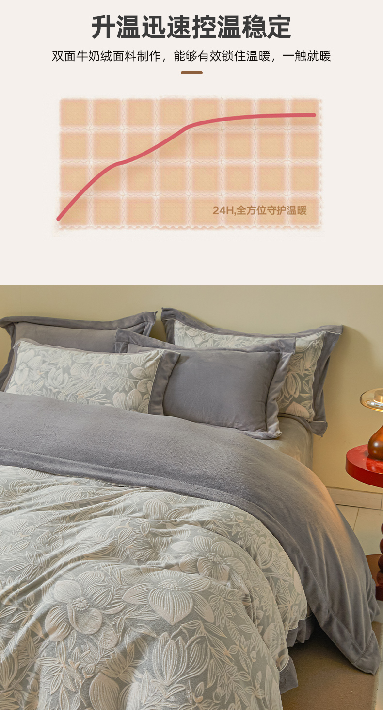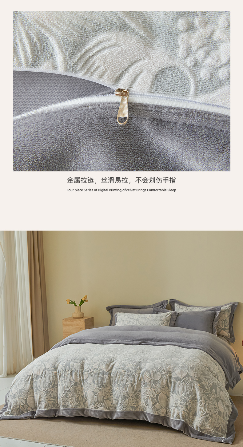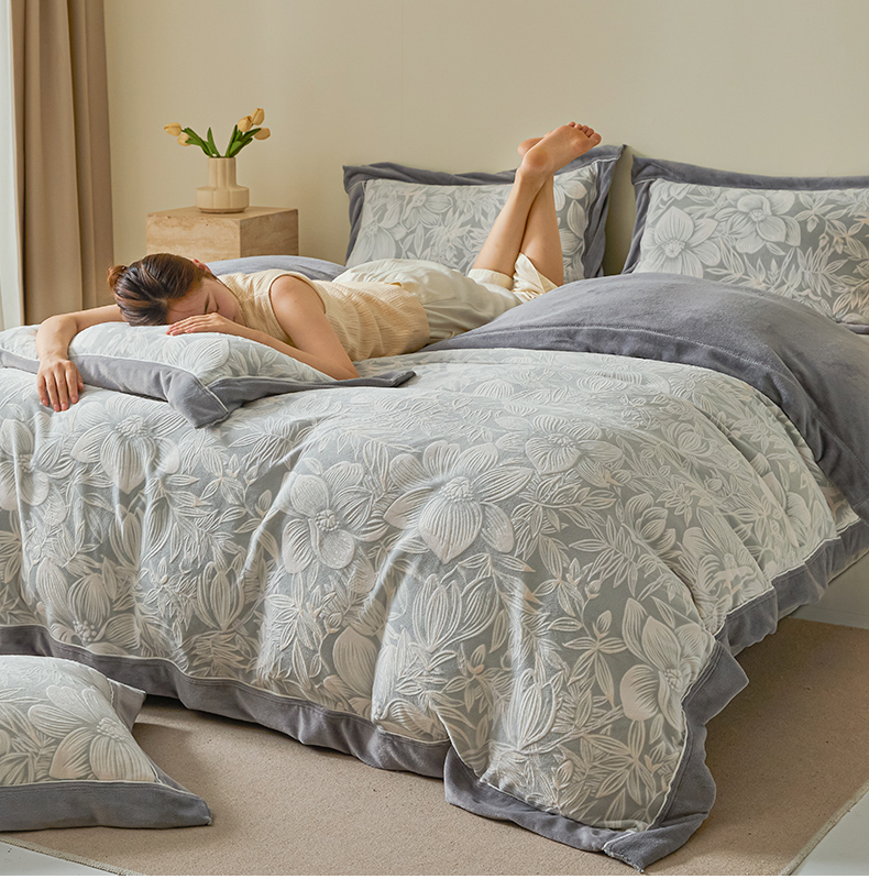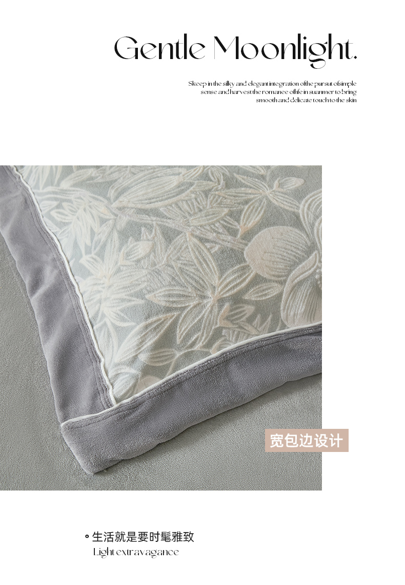 商品名称:全季家居 2024新款A类高克重5D立体浮雕宽边牛奶绒加厚保暖被套单件 玉兰花-灰