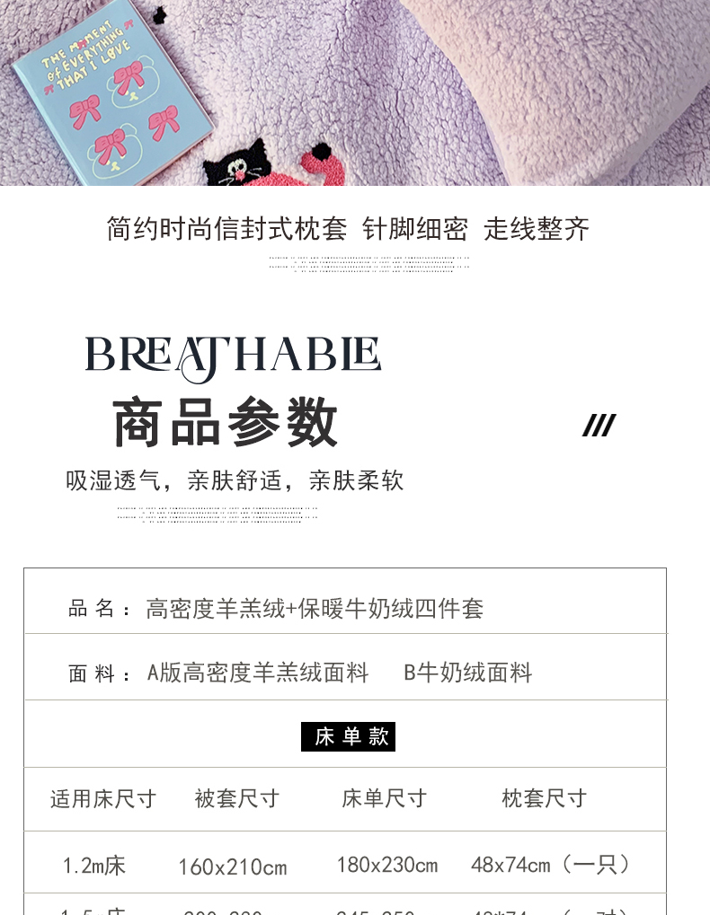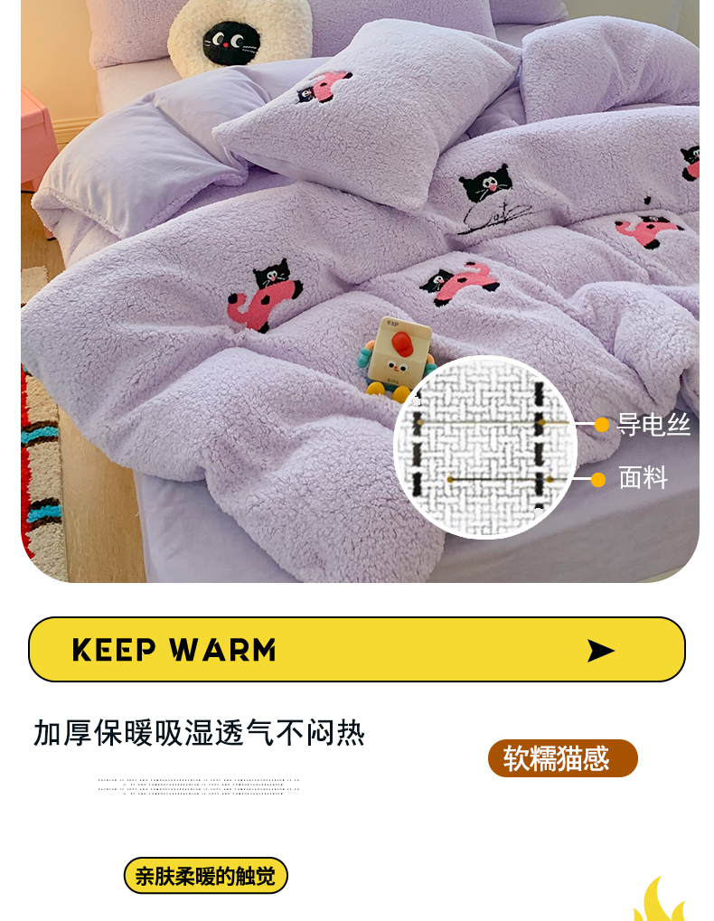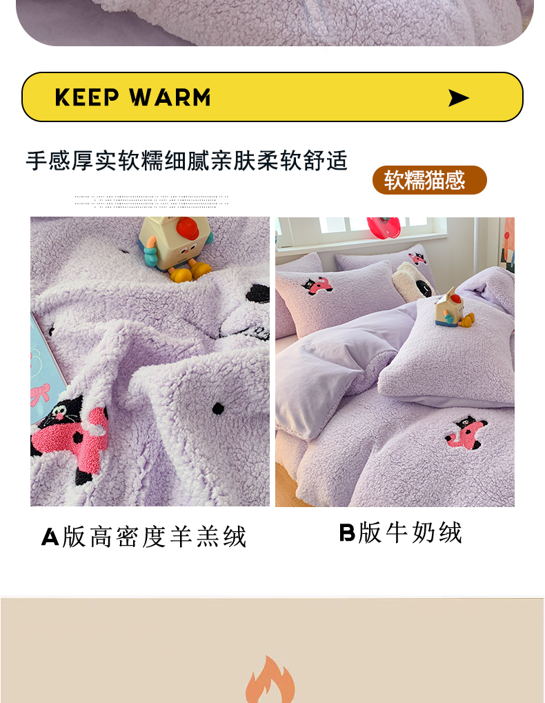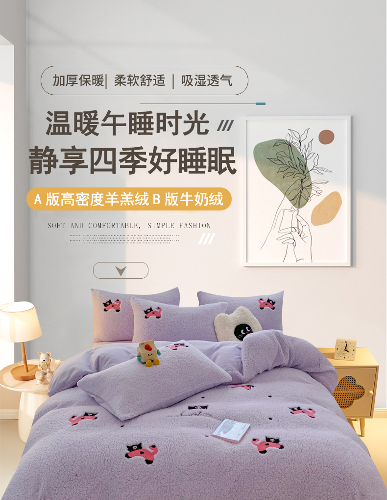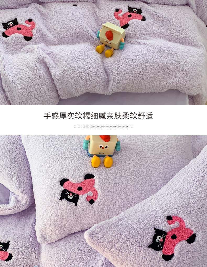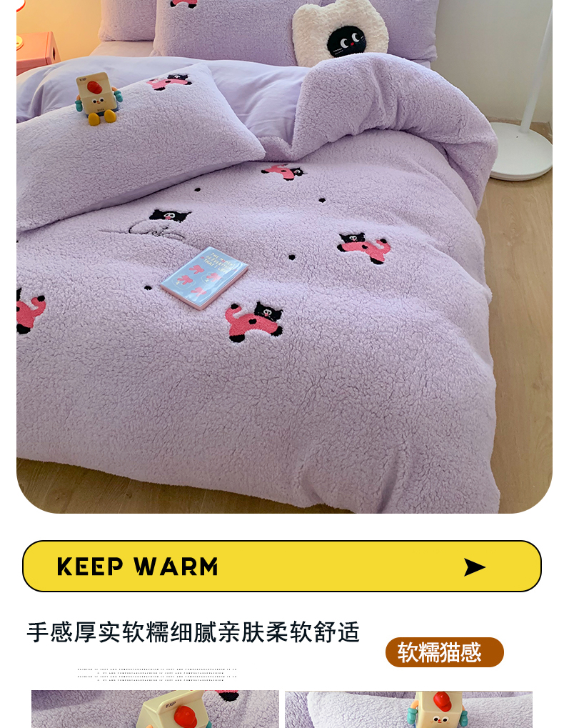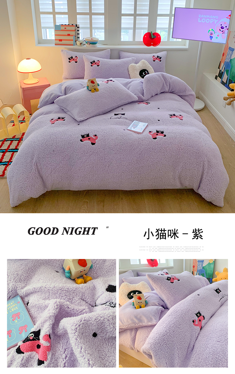 商品名称:2025新款高克重加厚羊羔绒牛奶绒四件套 小猫紫