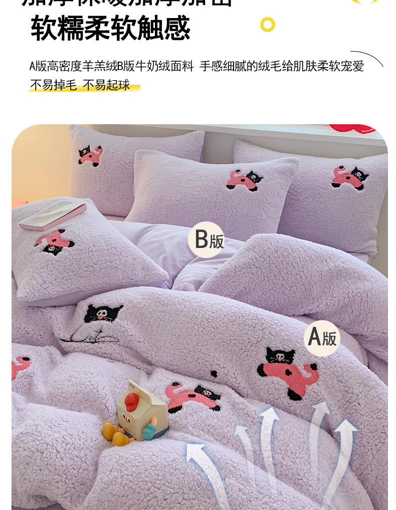 2025新款高克重加厚羊羔绒牛奶绒四件套 小猫紫