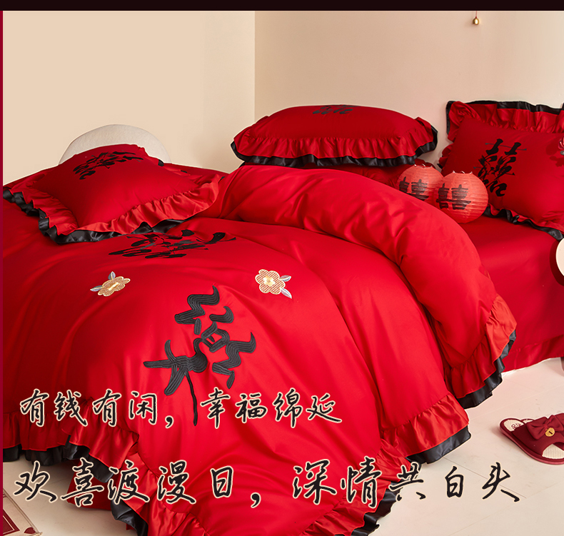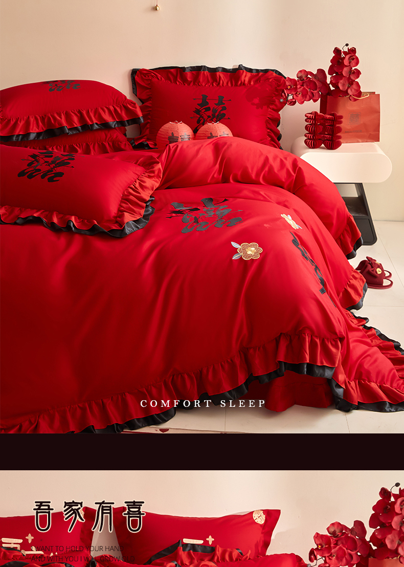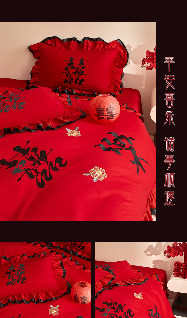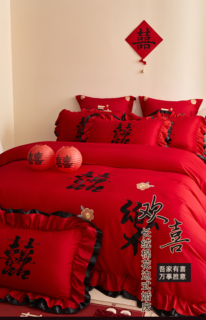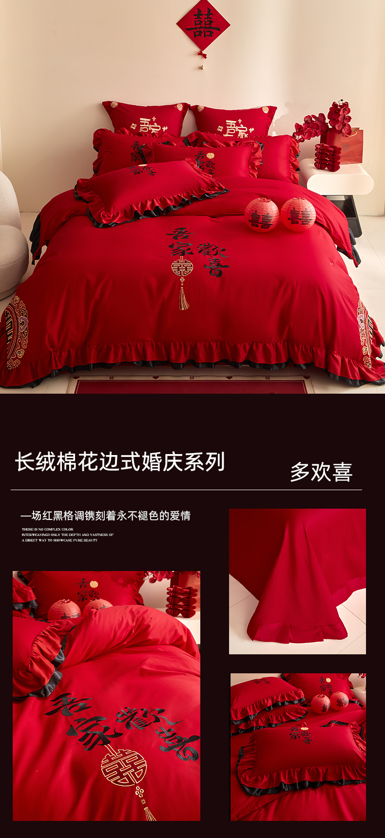 当前位置: 91家纺网 > 商品网购 > 床品套件 > 四件套 > 婚庆四件套 > 玉雅家纺 2025新款长绒棉花边式红黑格调婚庆四件套 花边款-多喜爱