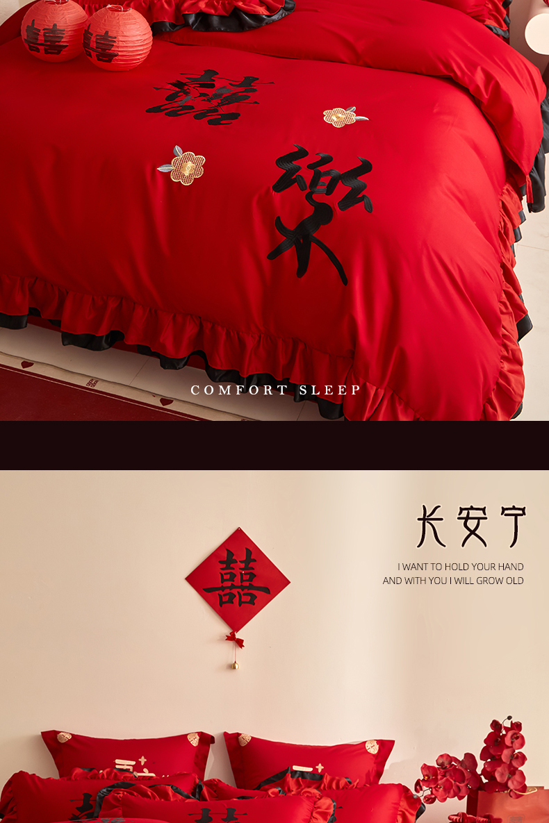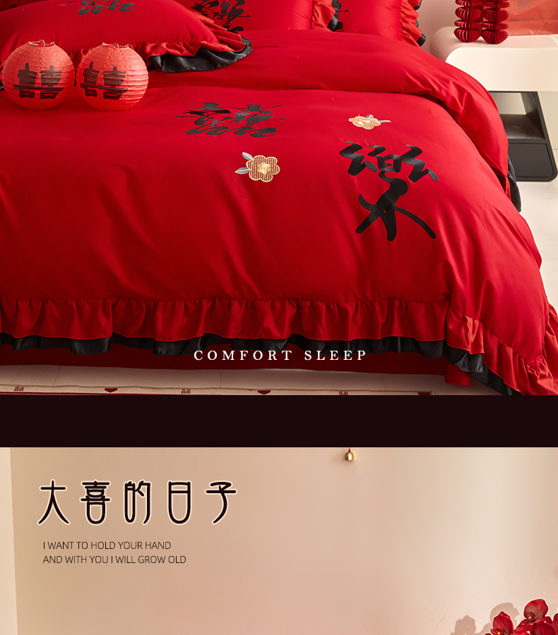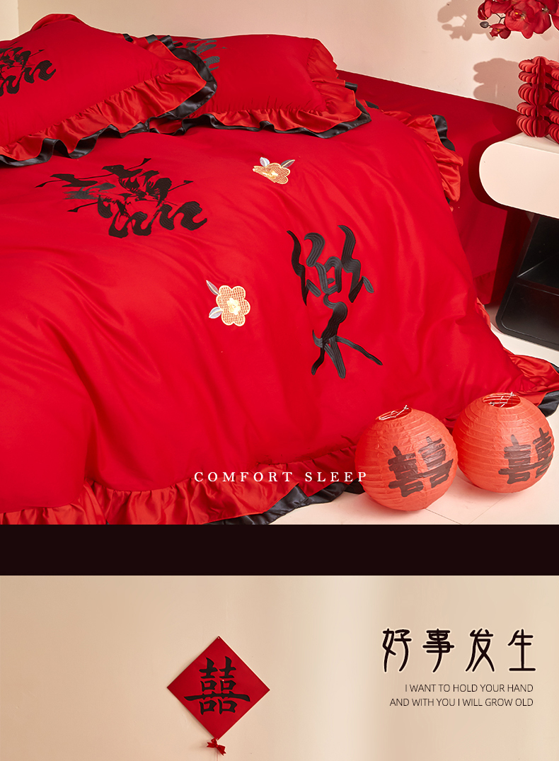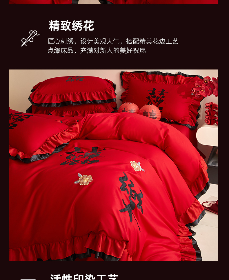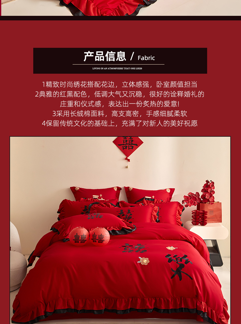 当前位置: 91家纺网 > 商品网购 > 床品套件 > 四件套 > 婚庆四件套 > 玉雅家纺 2025新款长绒棉花边式红黑格调婚庆四件套 花边款-多喜爱