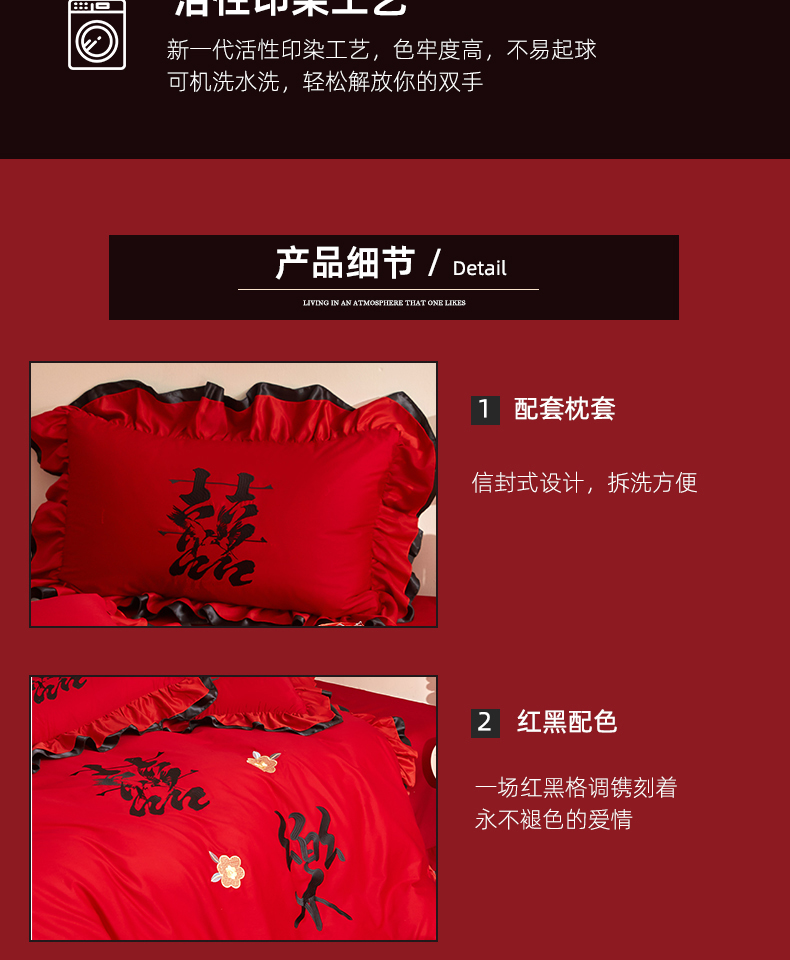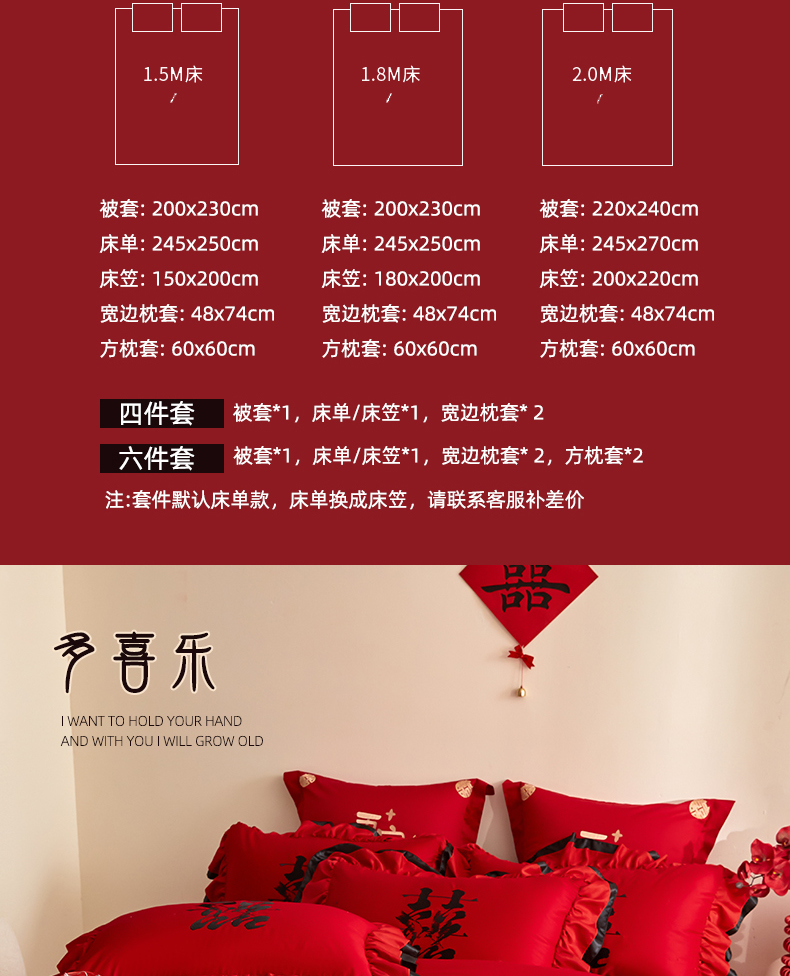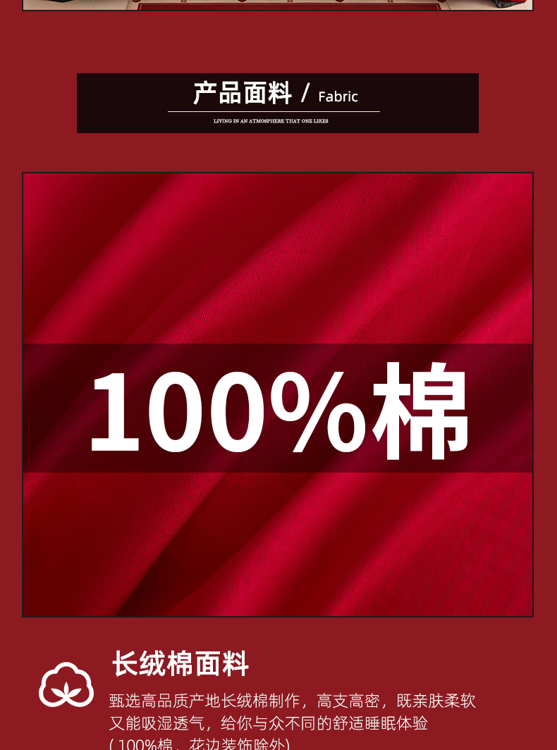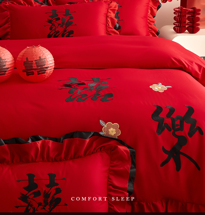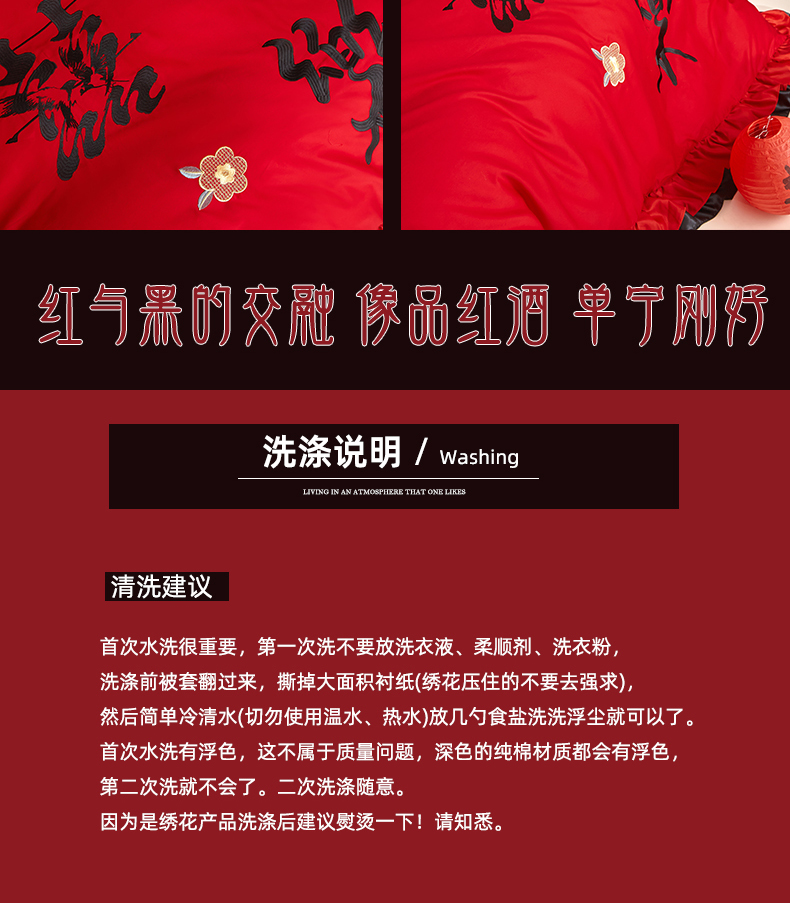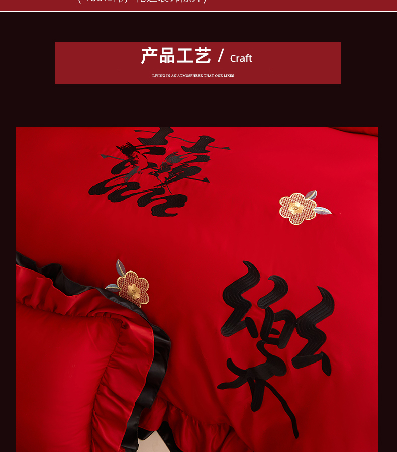当前位置: 91家纺网 > 商品网购 > 床品套件 > 四件套 > 婚庆四件套 > 玉雅家纺 2025新款长绒棉花边式红黑格调婚庆四件套 花边款-多喜爱