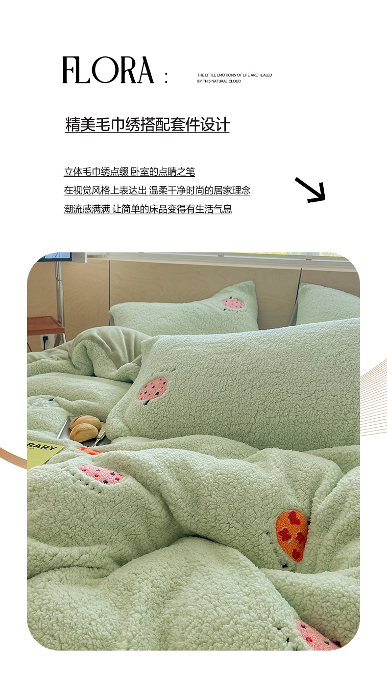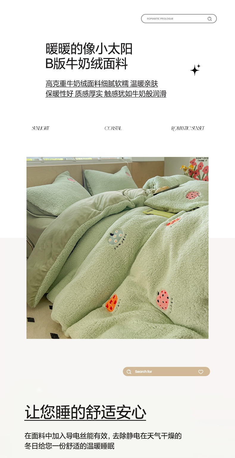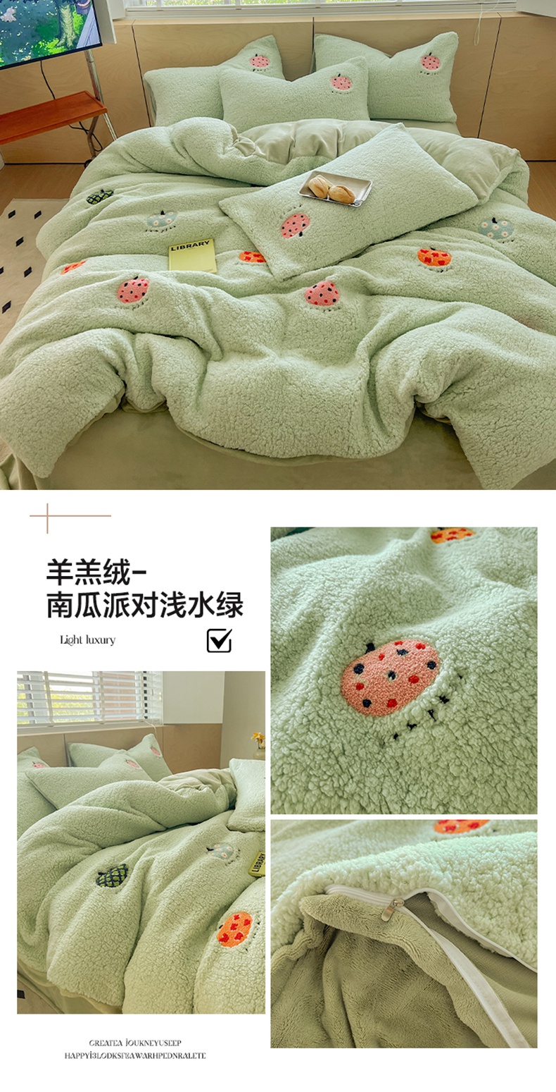 当前位置: 91家纺网 > 商品网购 > 床品套件 > 四件套 > 牛奶绒四件套 > 晨曦家纺 2024新款加厚羊羔绒牛奶绒毛巾绣四件套 羊羔绒-南瓜派对浅水绿