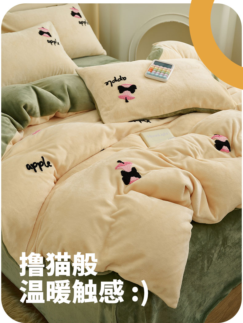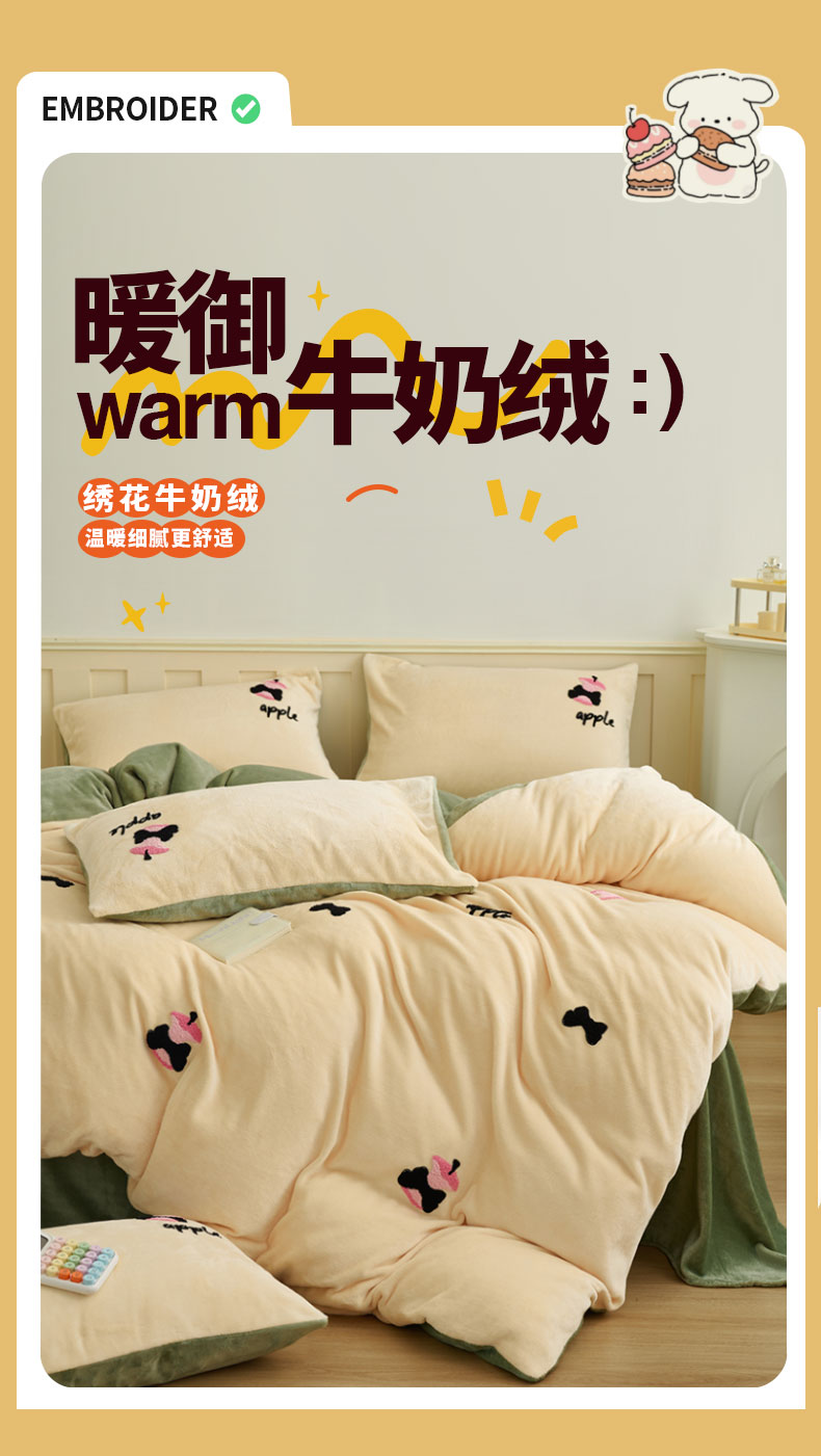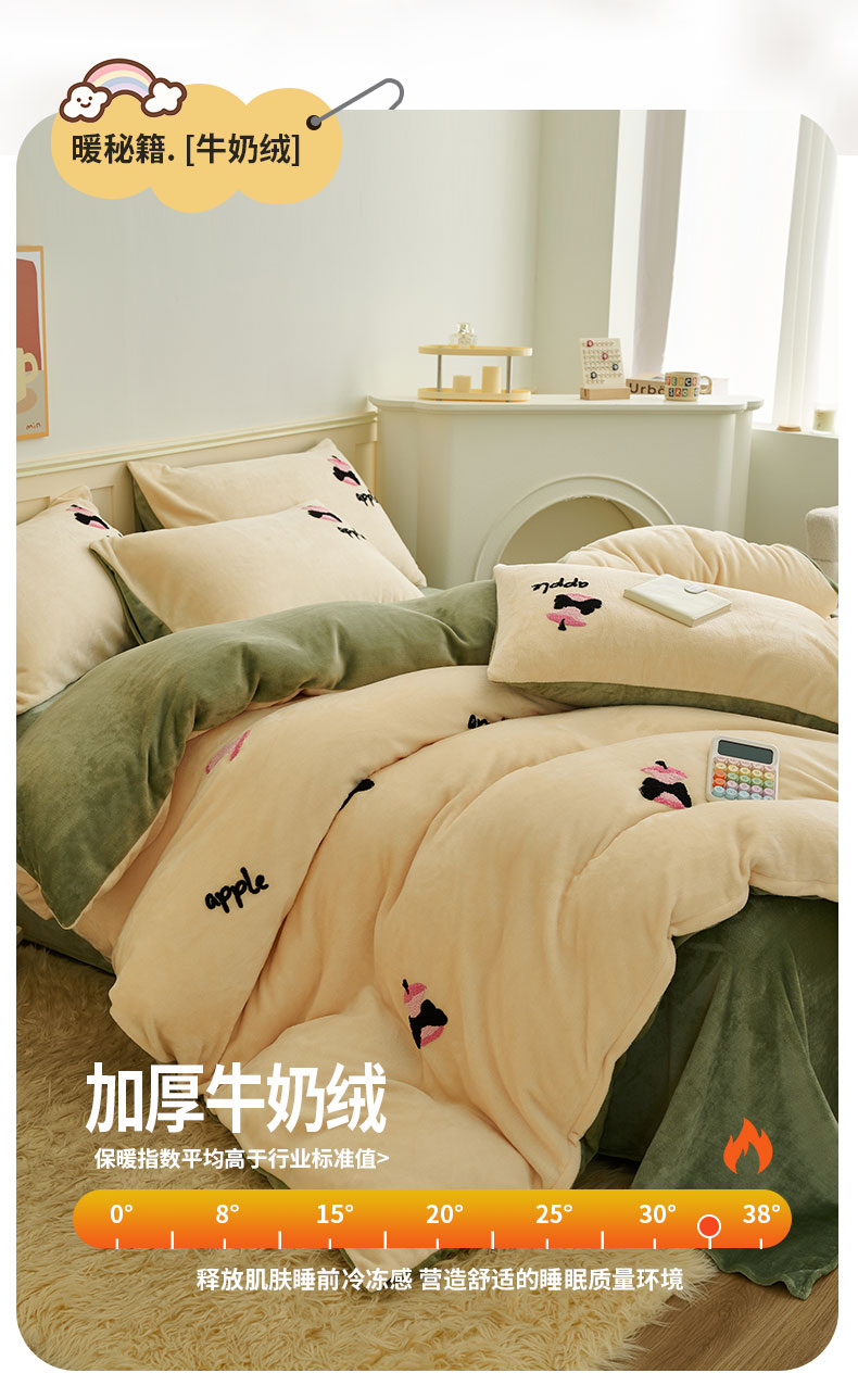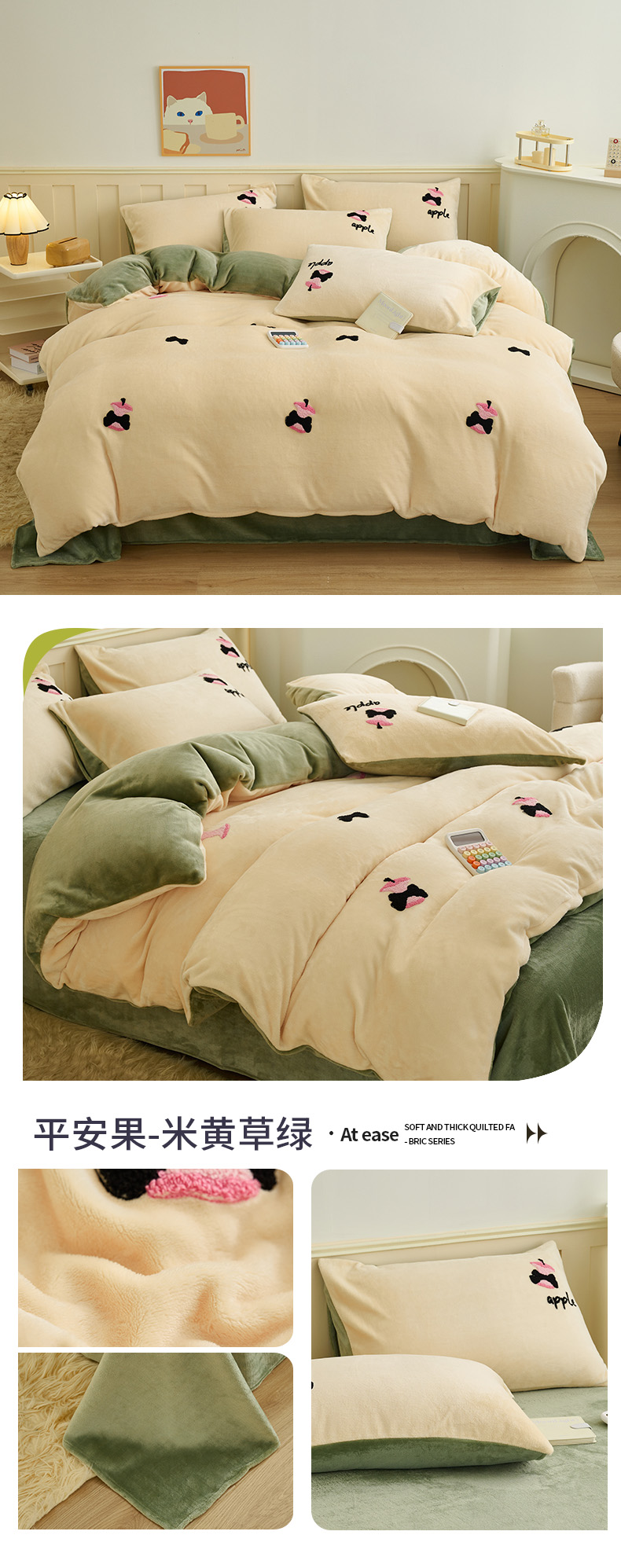 鑫琪莱家纺 2024新款卡通毛巾绣牛奶绒四件套 平安果-米黄草绿