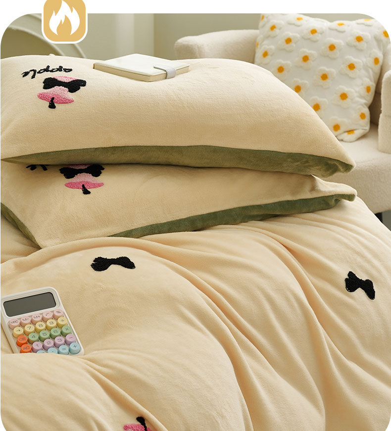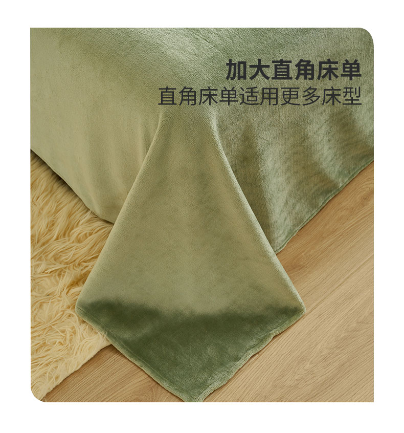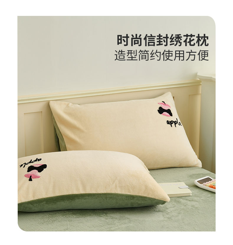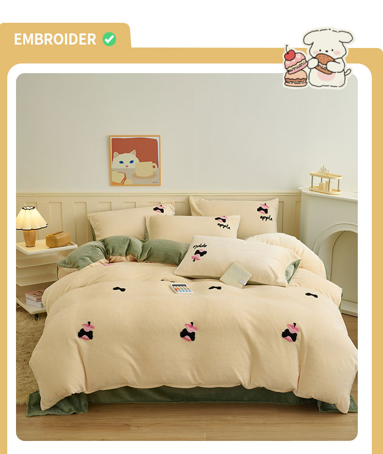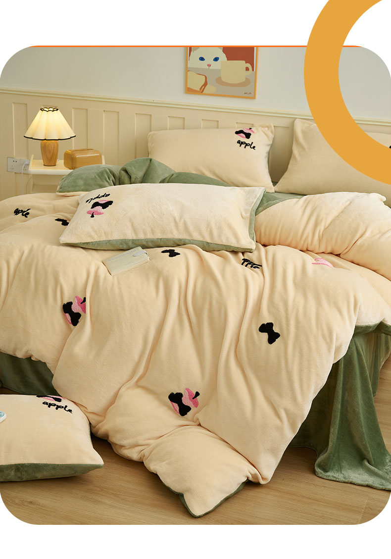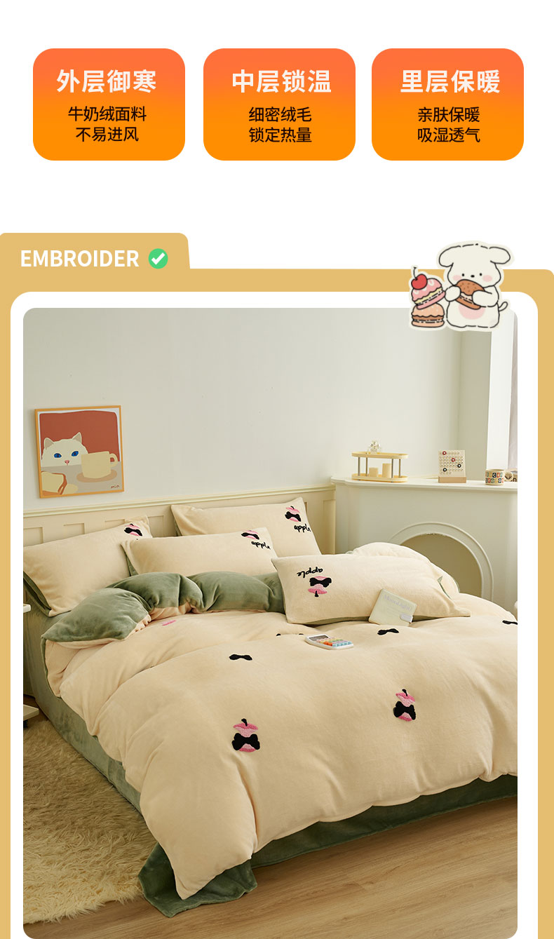 鑫琪莱家纺 2024新款卡通毛巾绣牛奶绒四件套 平安果-米黄草绿