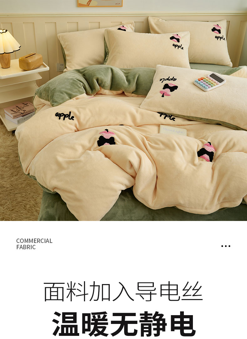 商品名称:鑫琪莱家纺 2024新款卡通毛巾绣牛奶绒四件套 平安果-米黄草绿