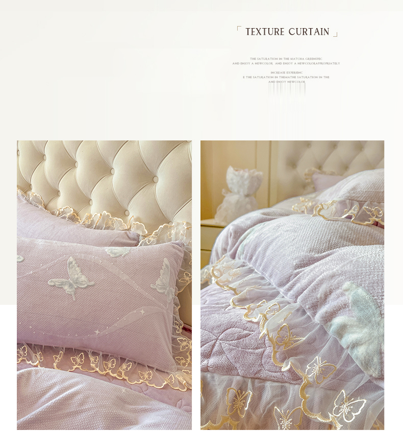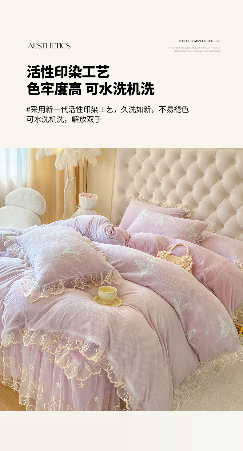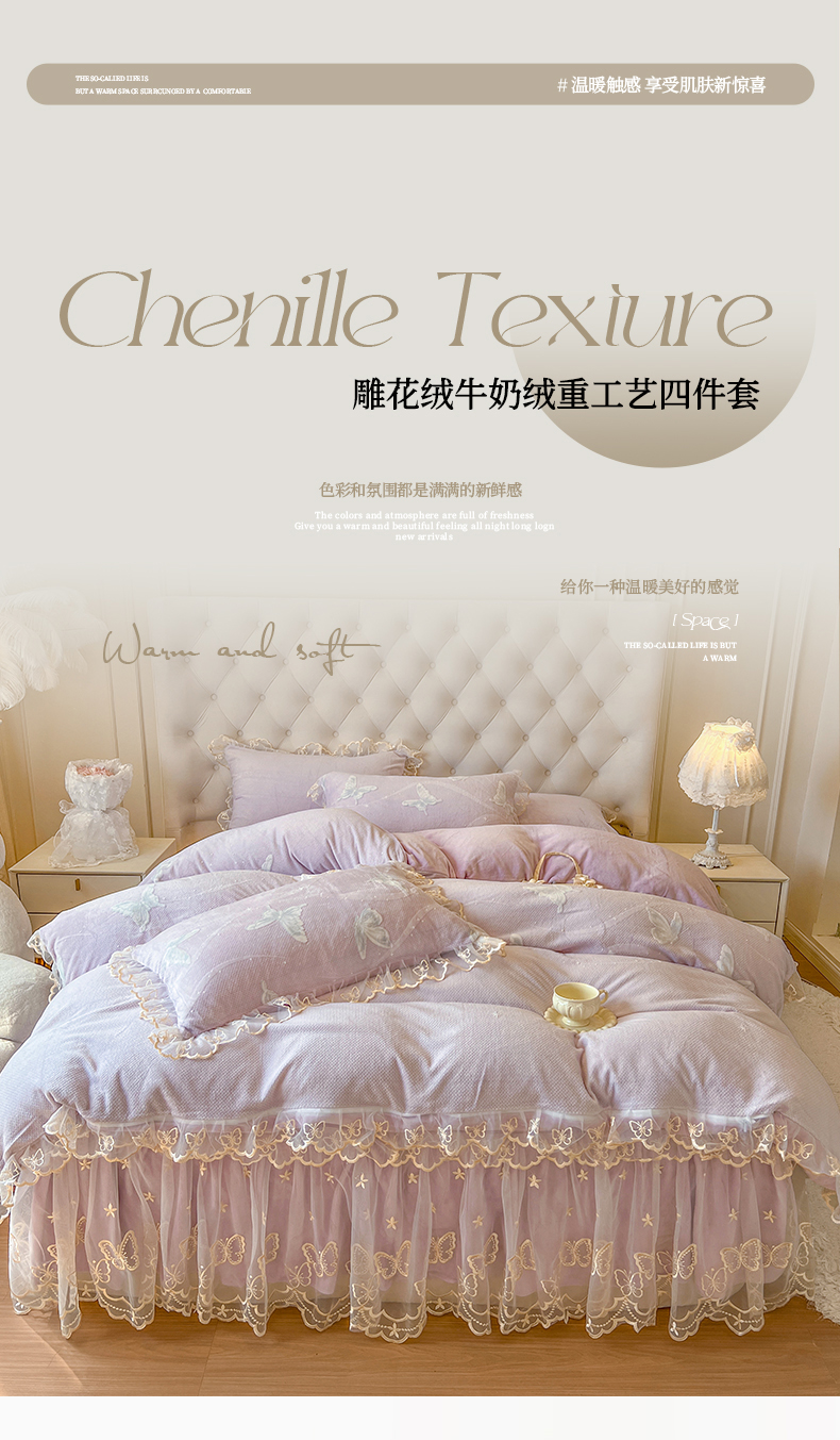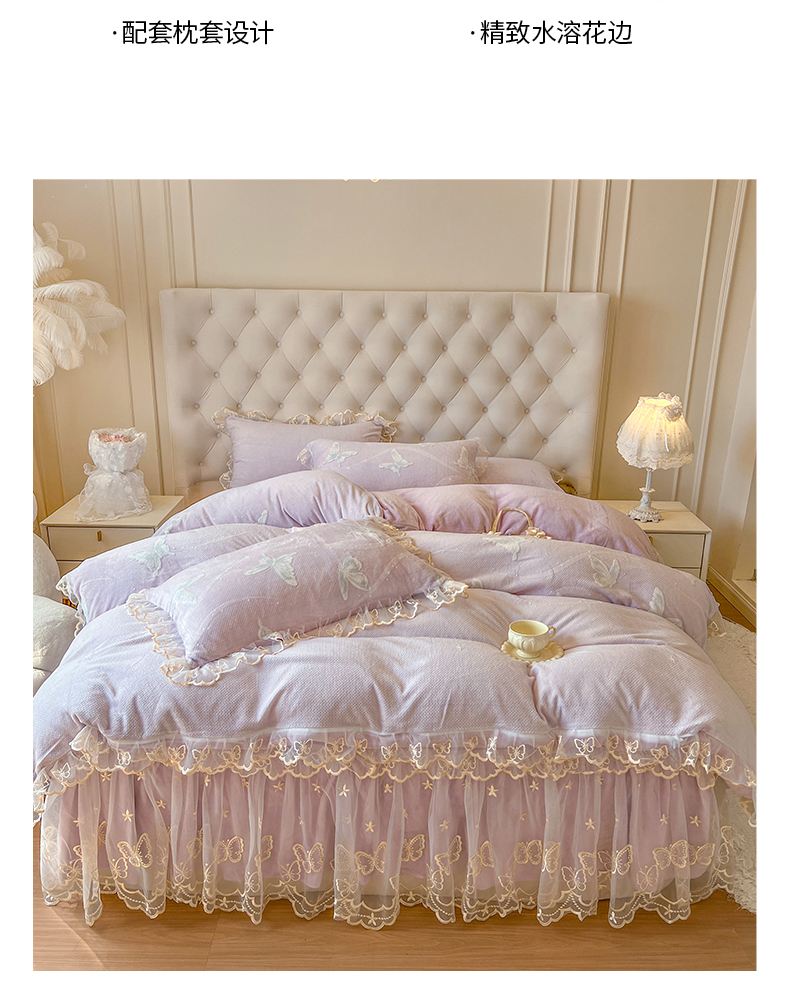 商品名称:网红馆(ck家纺) 2025新款雕花绒牛奶绒重工艺床裙四件套--蝴蝶梦境 轻紫