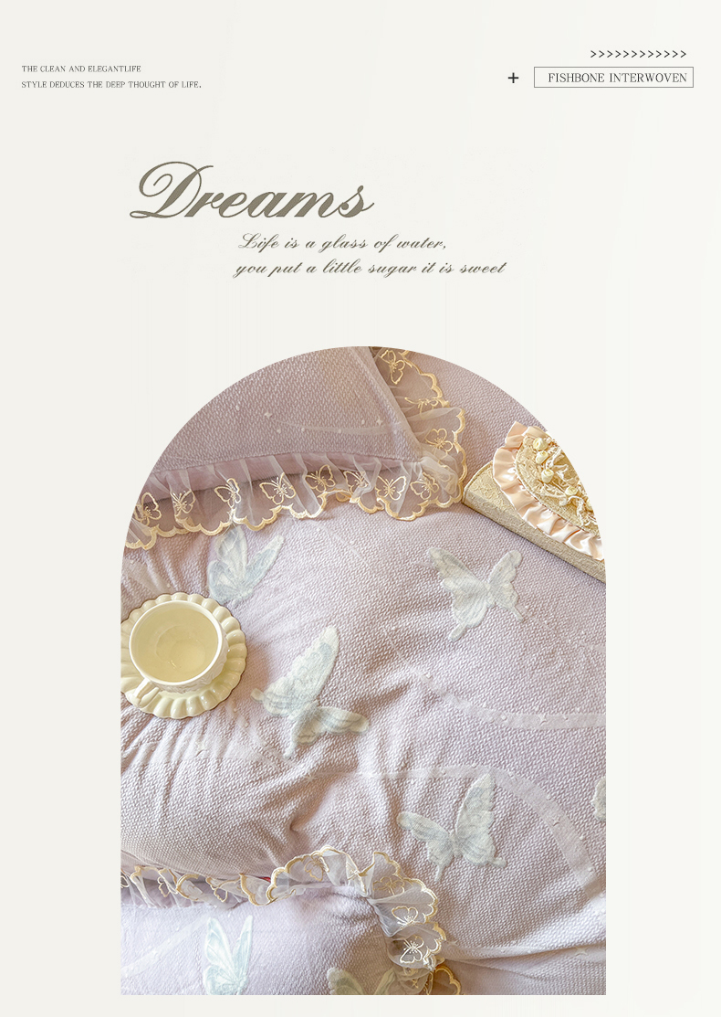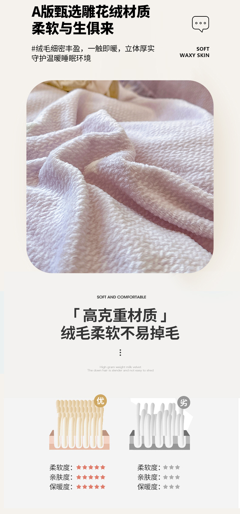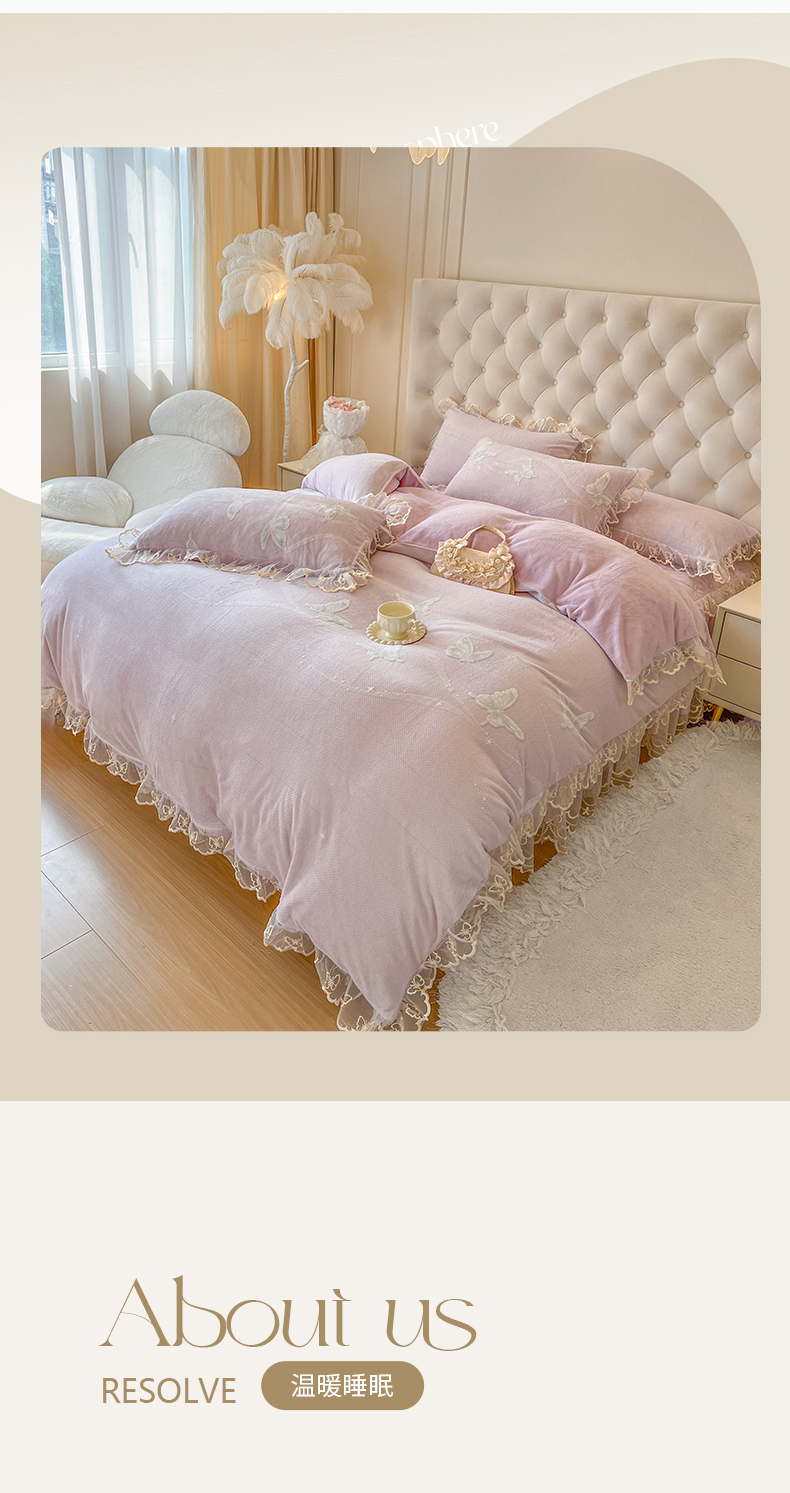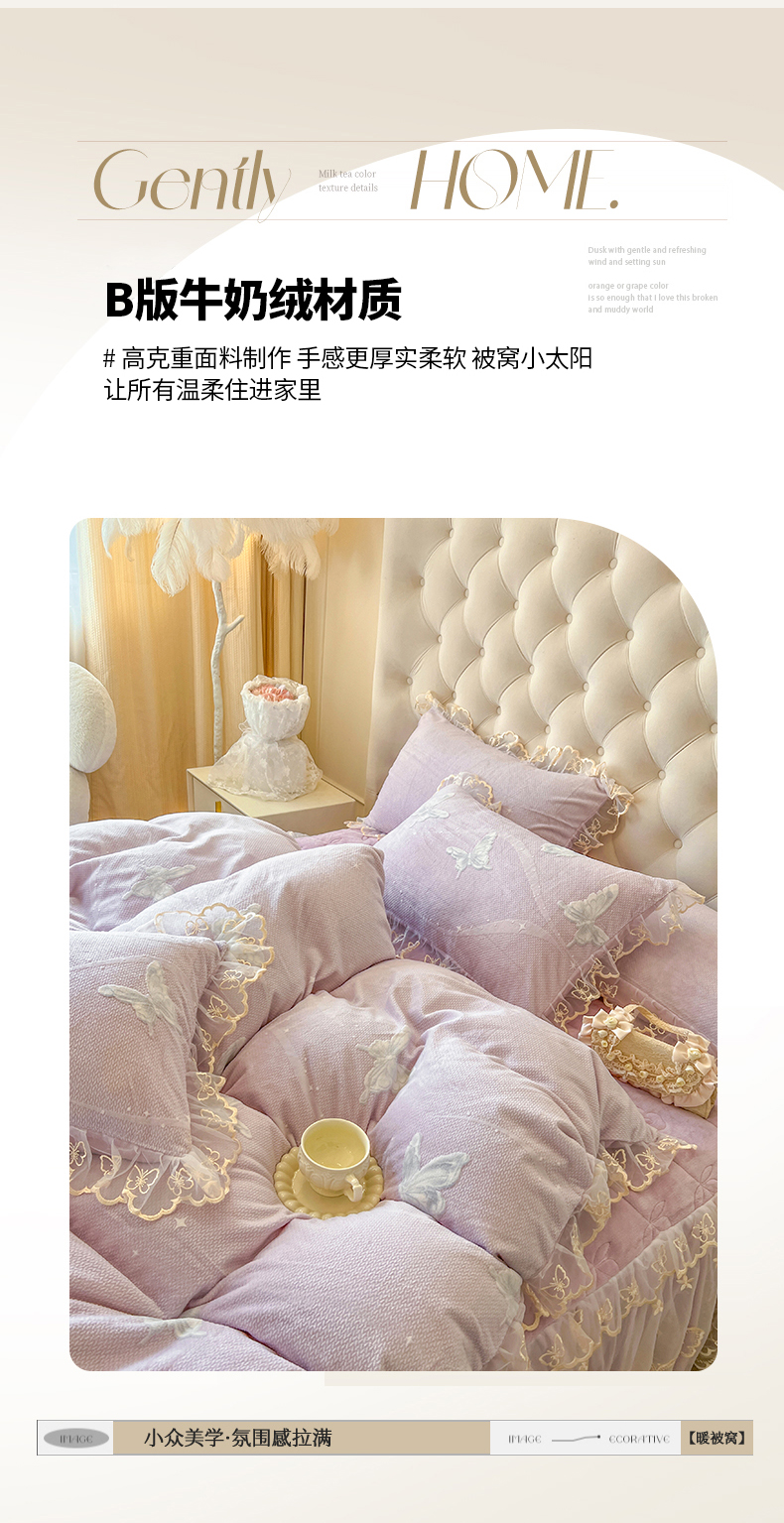 商品名称:网红馆(ck家纺) 2025新款雕花绒牛奶绒重工艺床裙四件套--蝴蝶梦境 轻紫