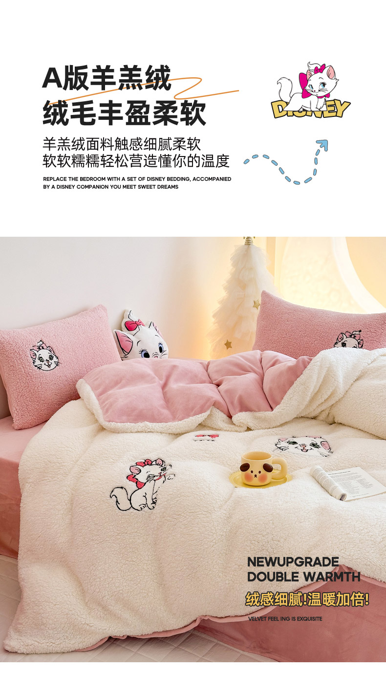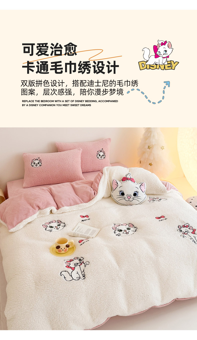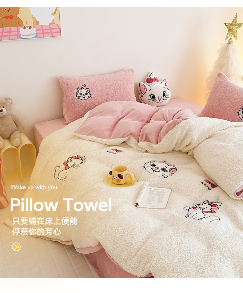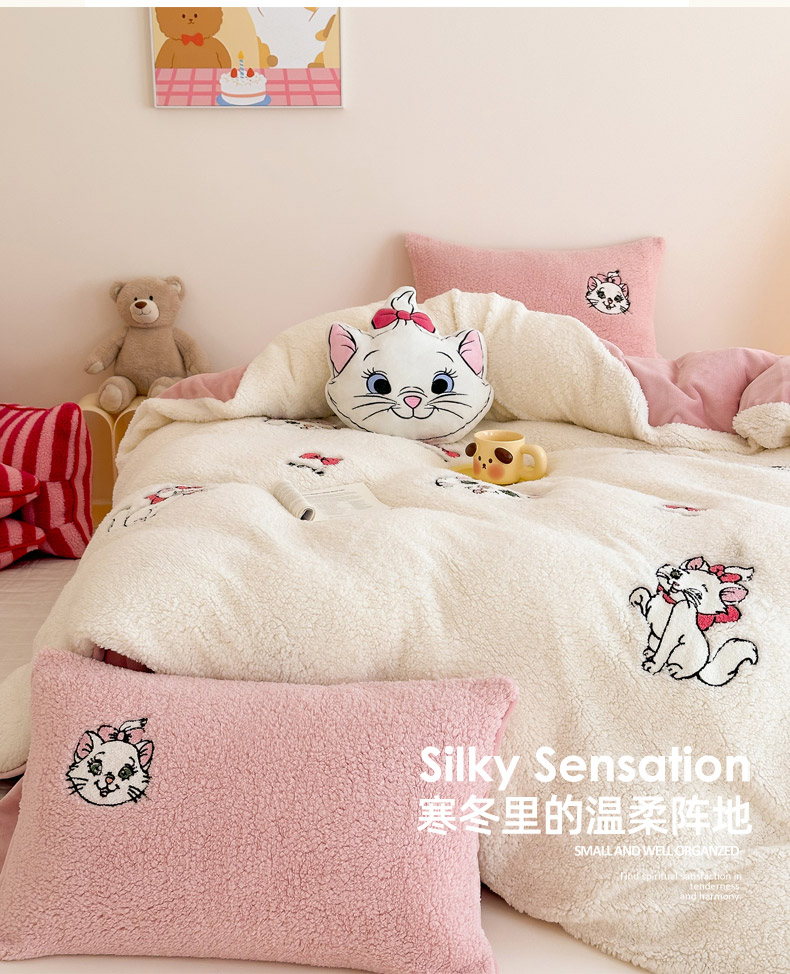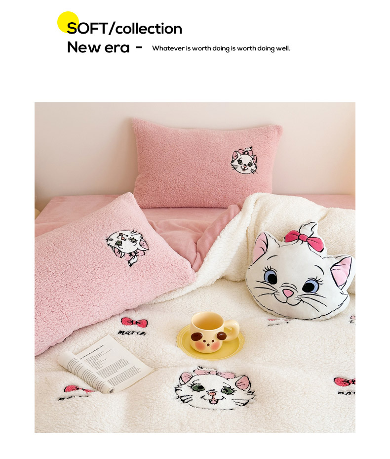 商品名称:乐坊 2024新款羊羔绒毛巾绣牛奶绒四件套冬季加厚保暖 白猫