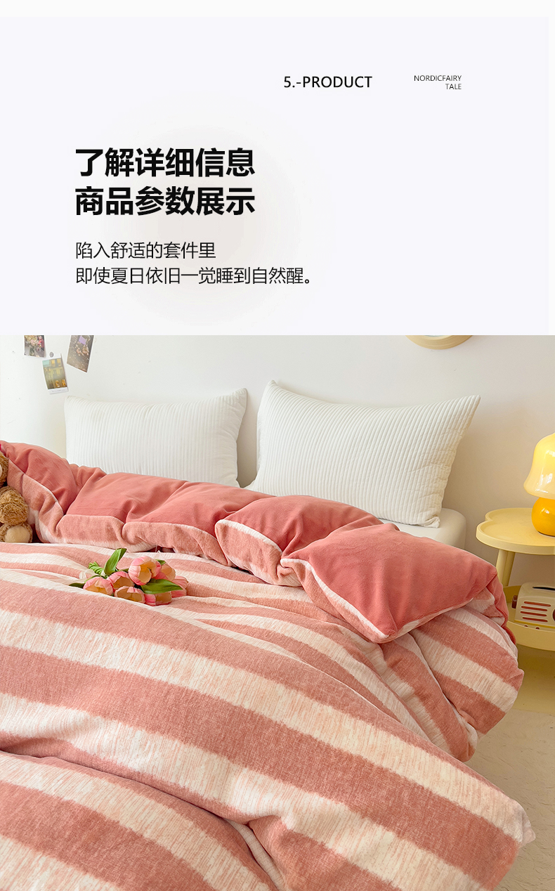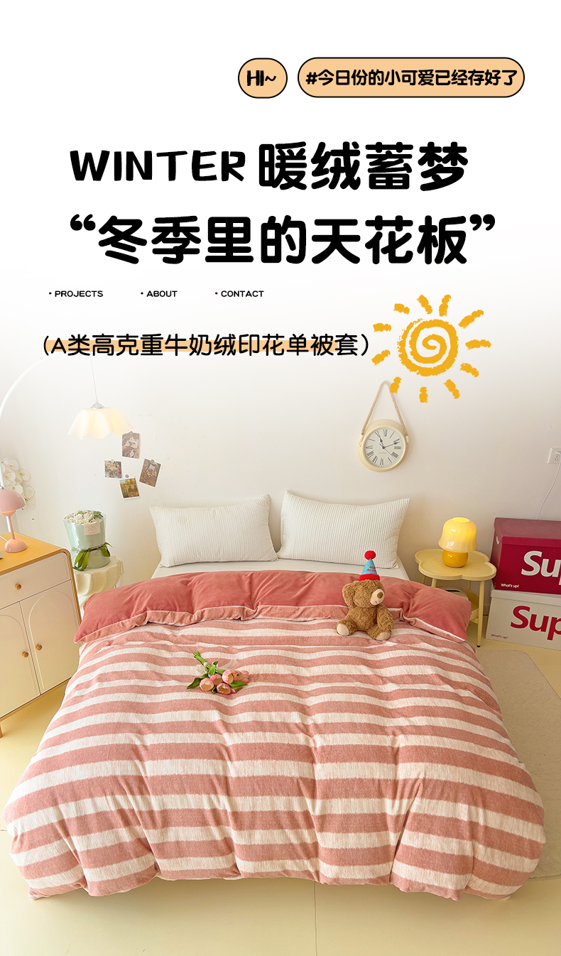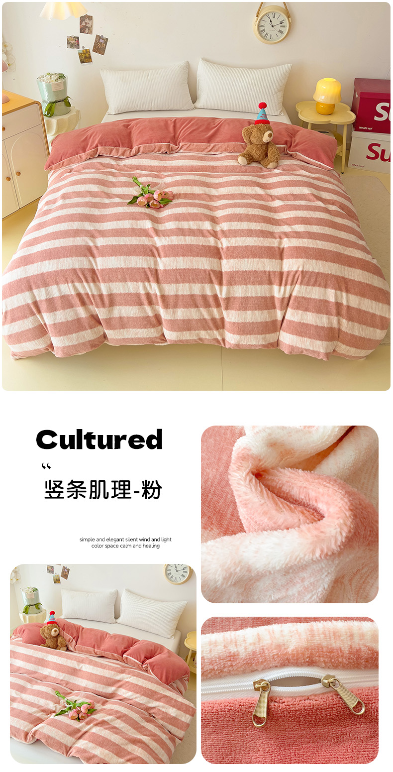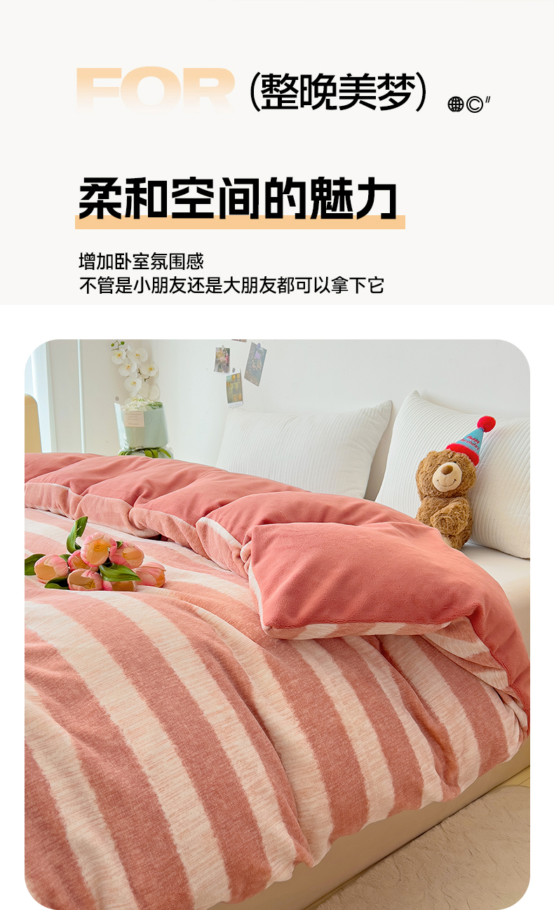 • 91家纺网 家纺一手货源 找家纺 大柏树 2025新款A类高克重亲肤舒适牛奶绒印花四件套-单被套可定制 竖条肌理-粉