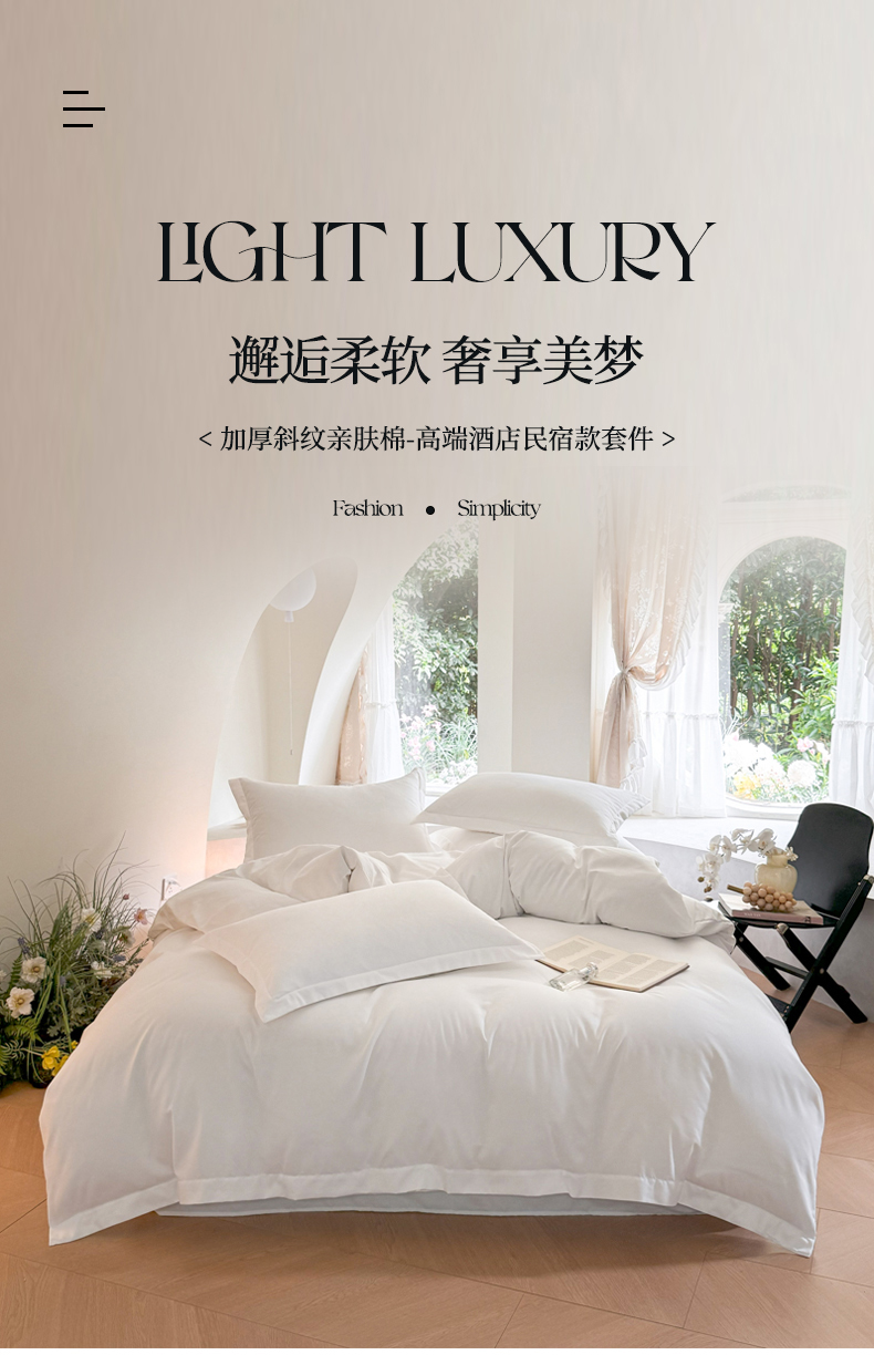 当前位置: 91家纺网 > 商品网购 > 床品套件 > 四件套 > 其它四件套 > 欣晴家纺 2024新款加厚斜纹亲肤棉高端酒店宾馆民宿四件套 极简纯白