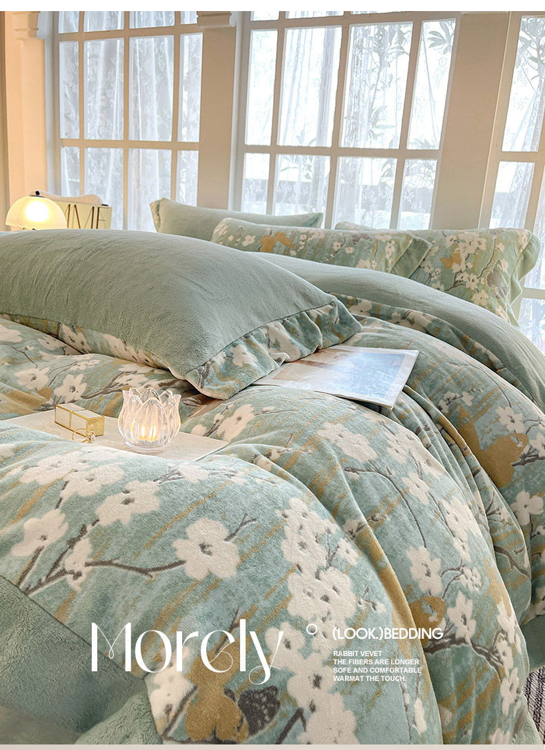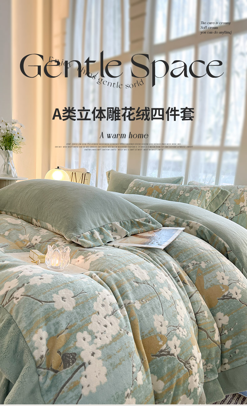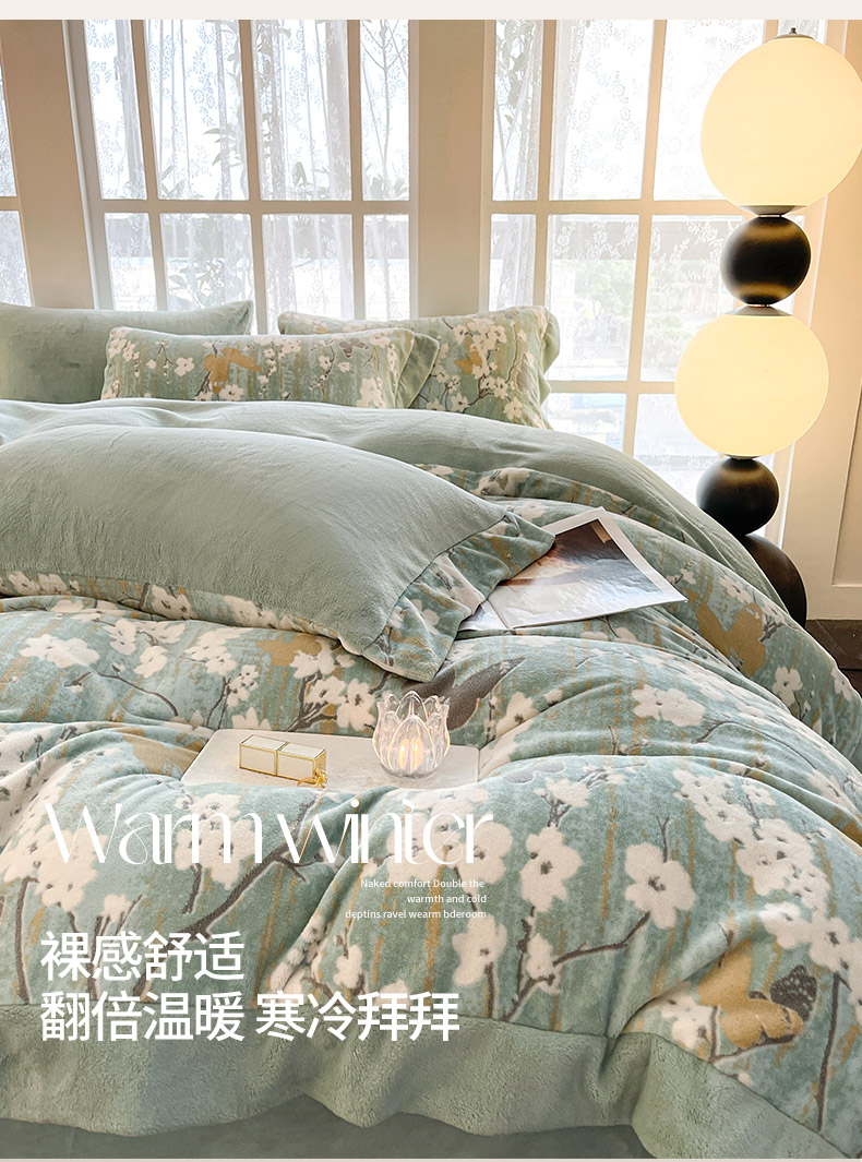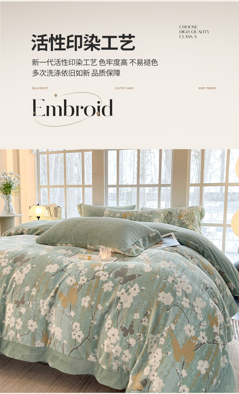 商品名称: 秋冬9斤重加厚保暖牛奶绒四件套刺绣数码宝宝绒被套床单床笠床上用品 塞尔纳-仙踪绿