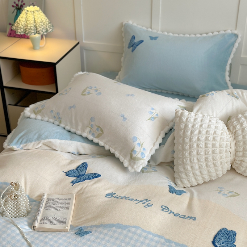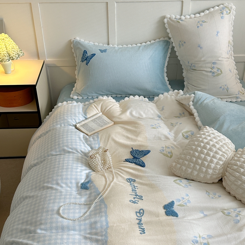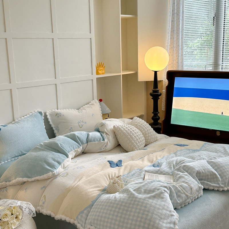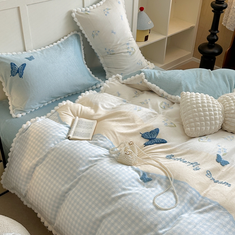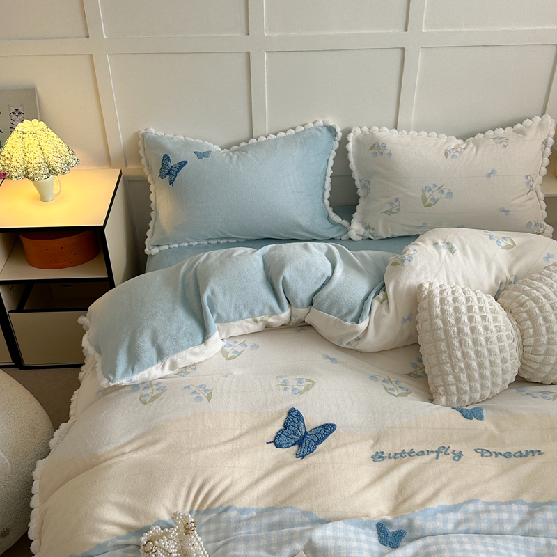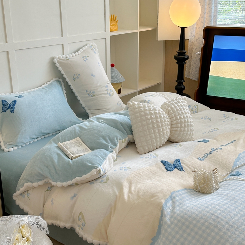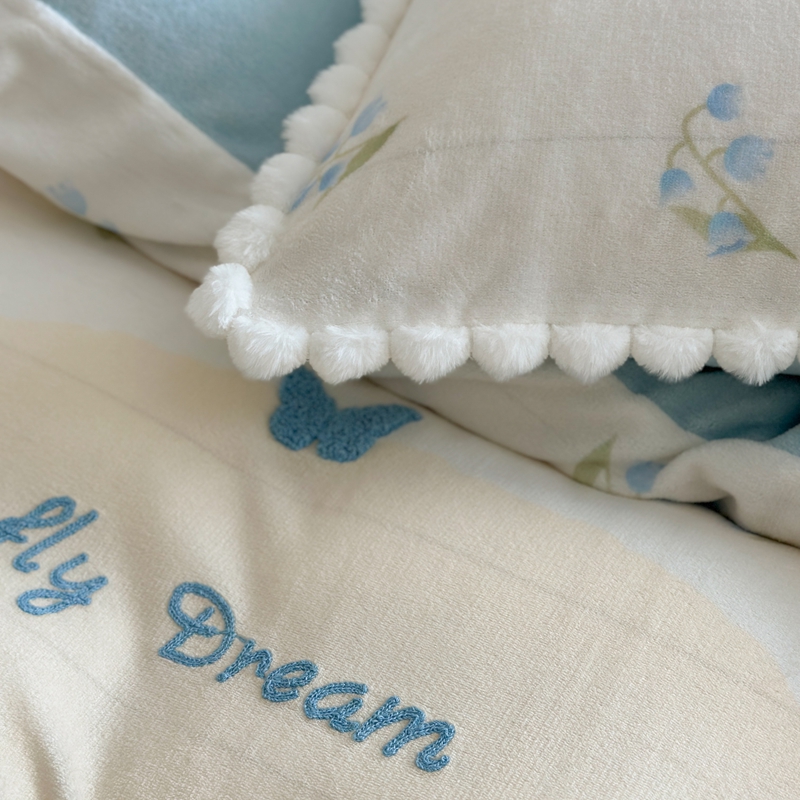 柚子YOUTH 2024新款毛球花边三拼牛奶绒四件套 铃兰蝴蝶