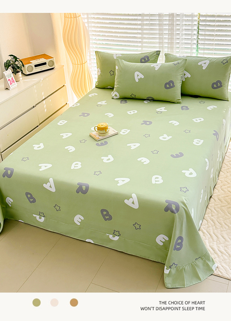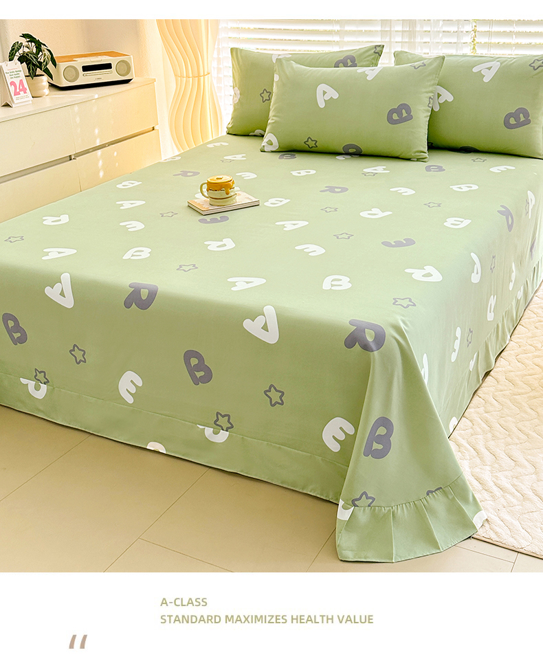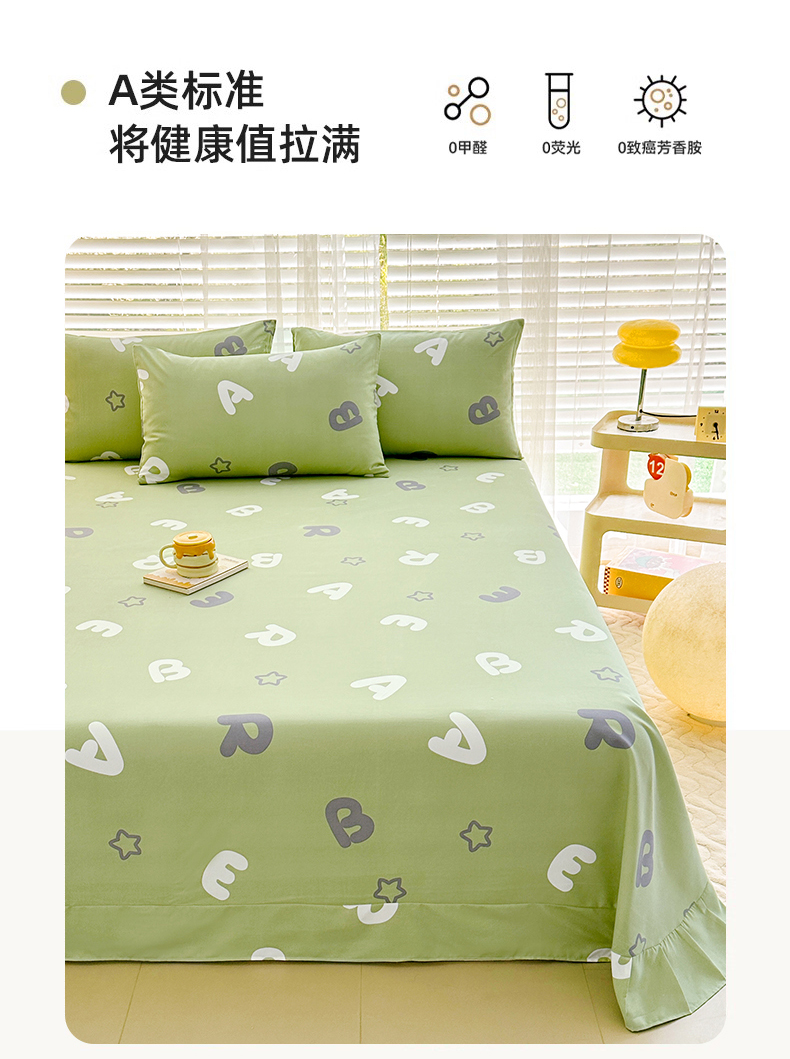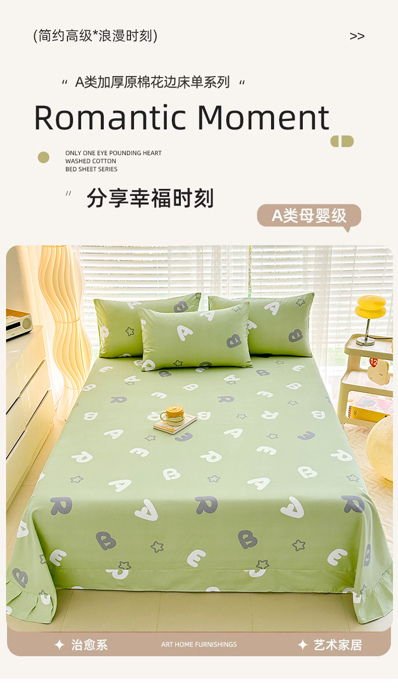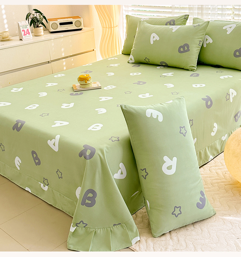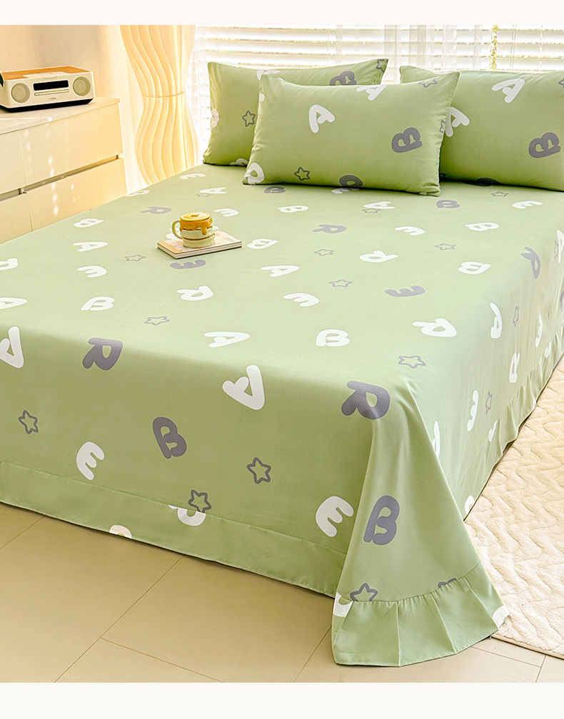 • 91家纺网 家纺一手货源 找家纺 家贝爱 2024新款加厚原棉磨毛花边床单 印象字母绿