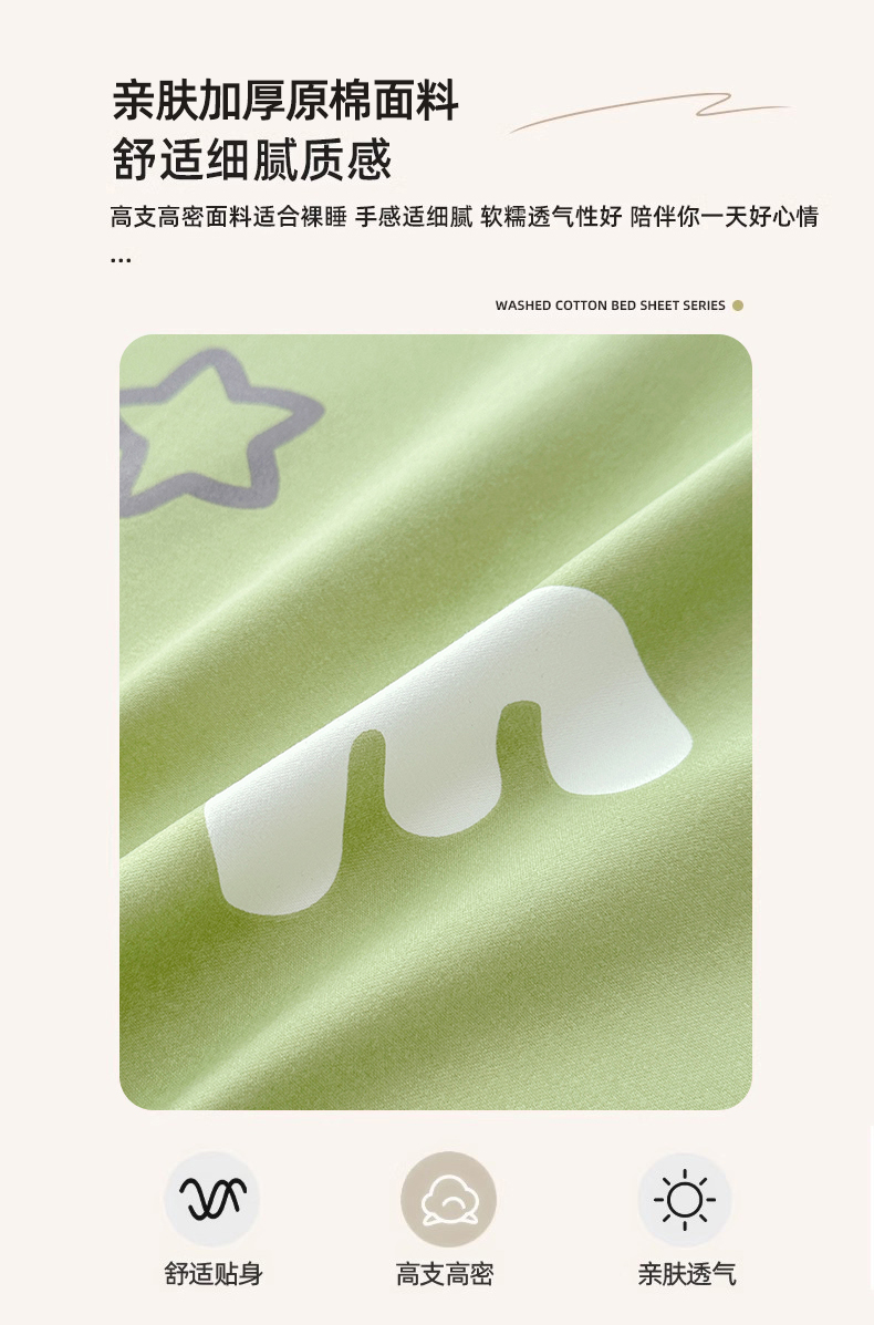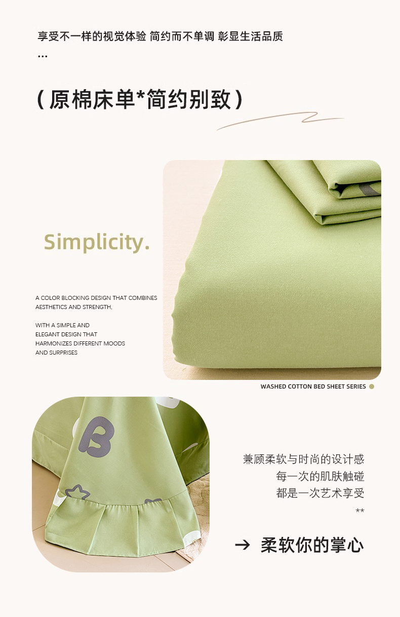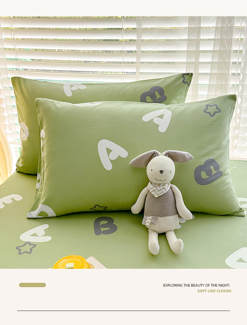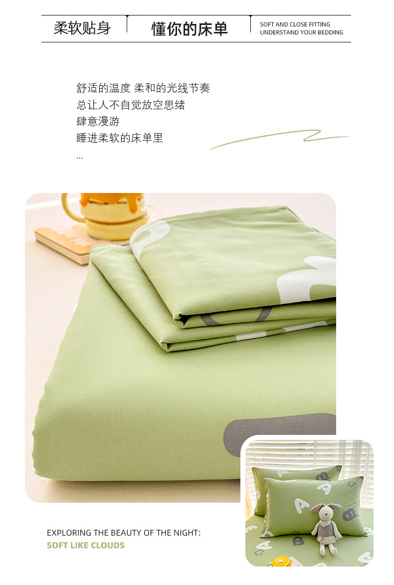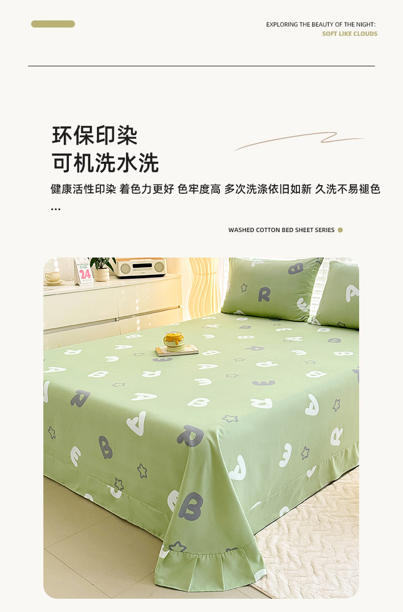 • 91家纺网 家纺一手货源 找家纺 家贝爱 2024新款加厚原棉磨毛花边床单 印象字母绿