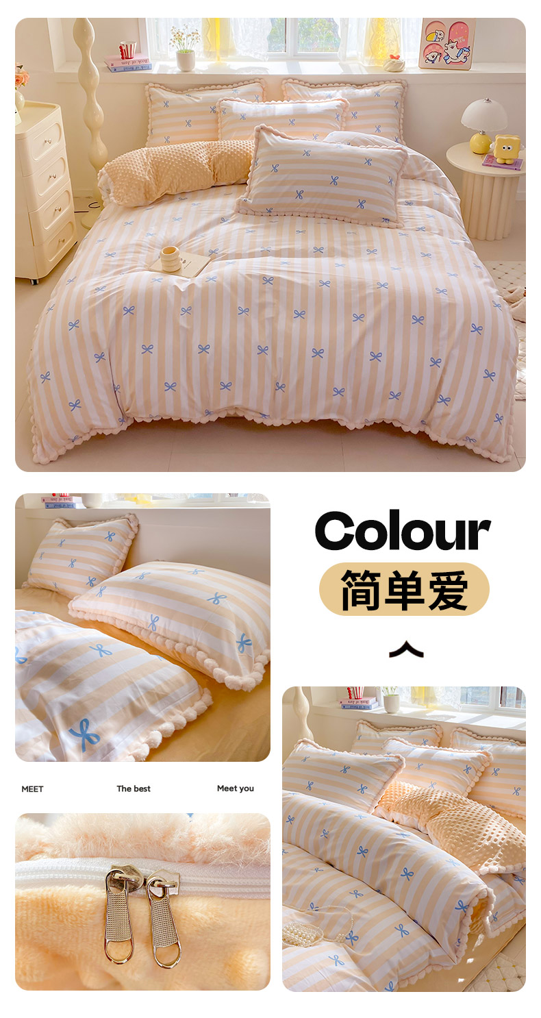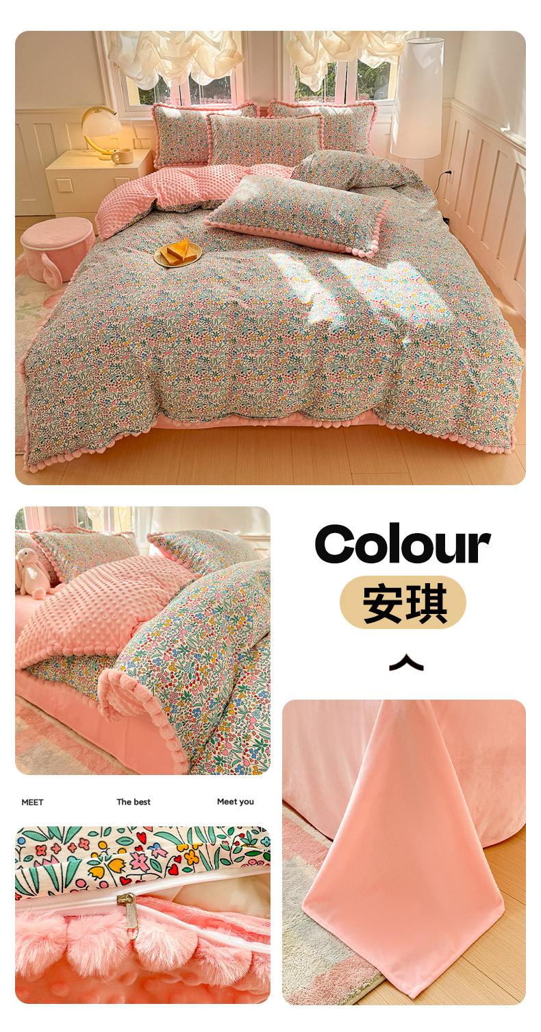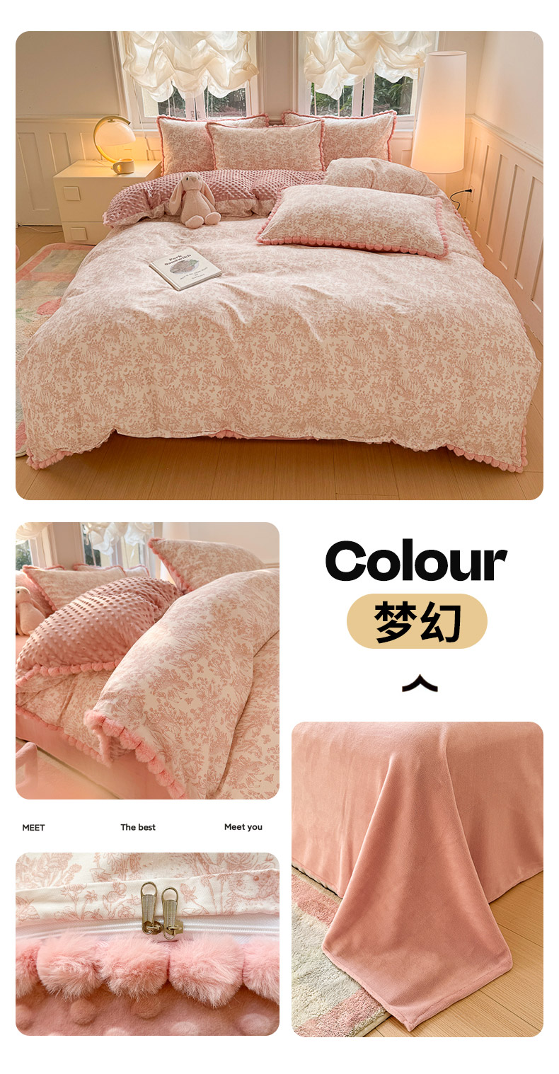 (总)千朵 2025新款棉加豆豆绒毛毛球边四件套