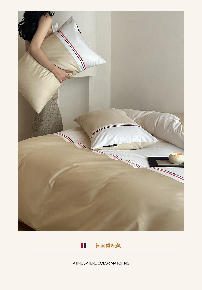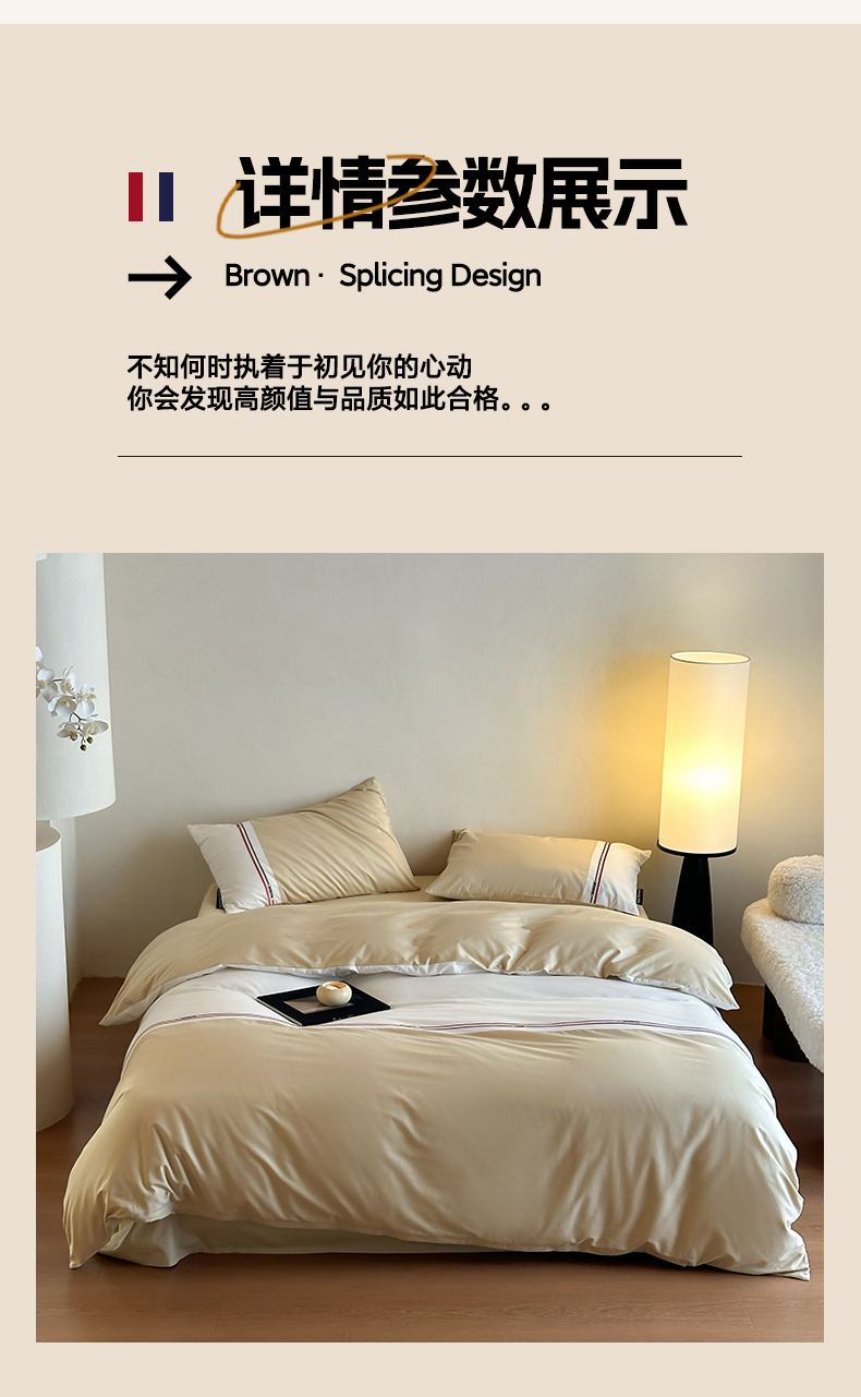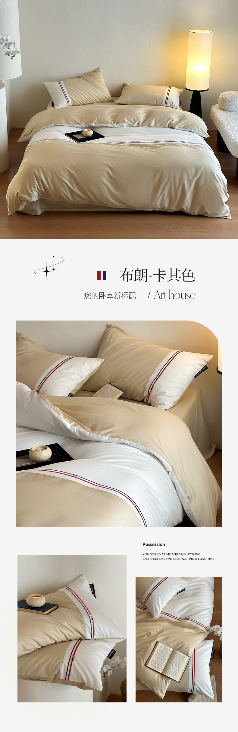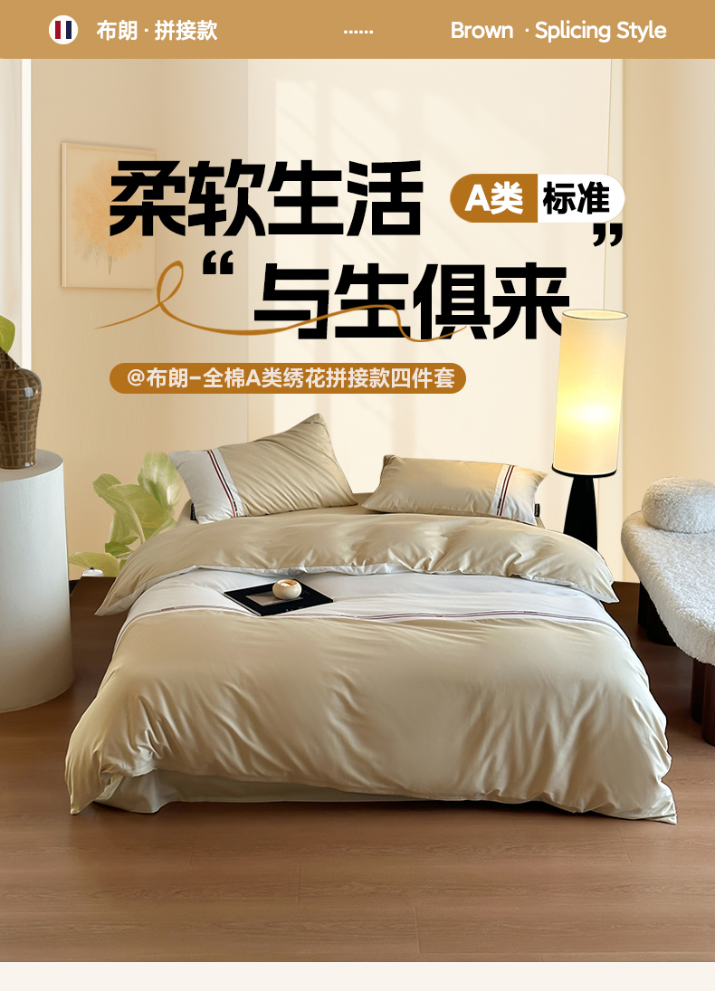 商品名称:卡巴伦家纺 2025新款全棉A类绣花拼接款四件套-布朗 布朗-卡其色