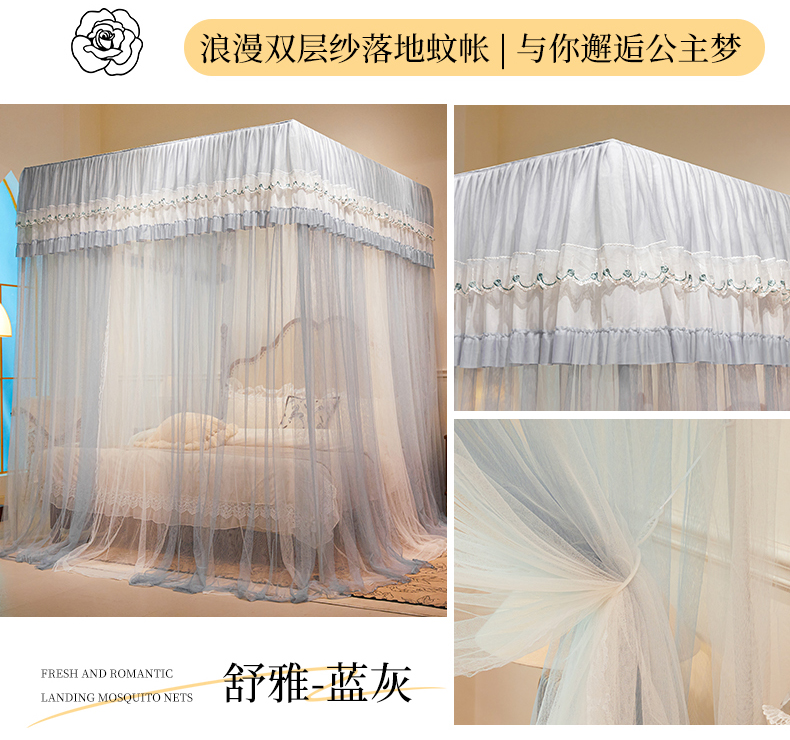 当前位置: 91家纺网 > 商品网购 > 床上用品 > 蚊帐 > 宫廷蚊帐 > 雪姿家纺 2025新款刺绣花边双层宫廷三开门落地蚊帐-舒雅 素雅-蓝灰