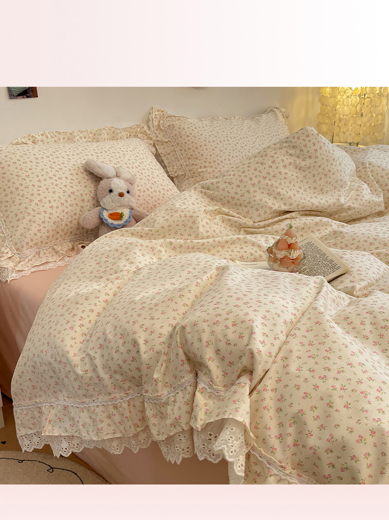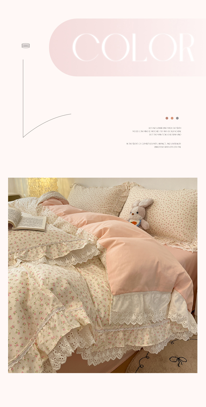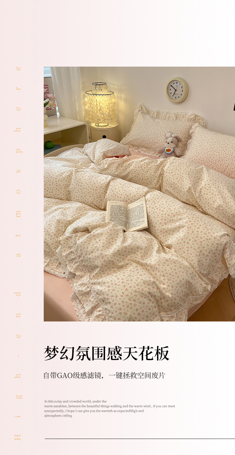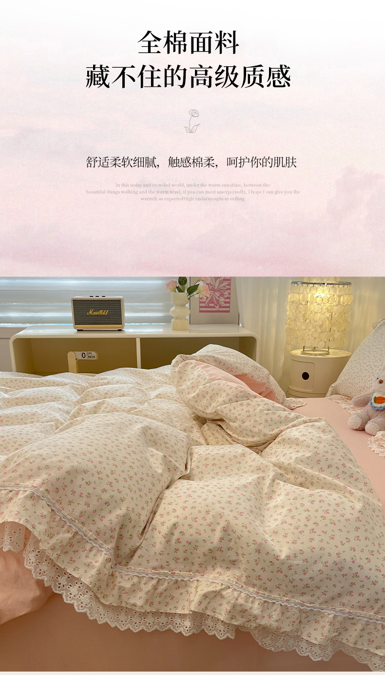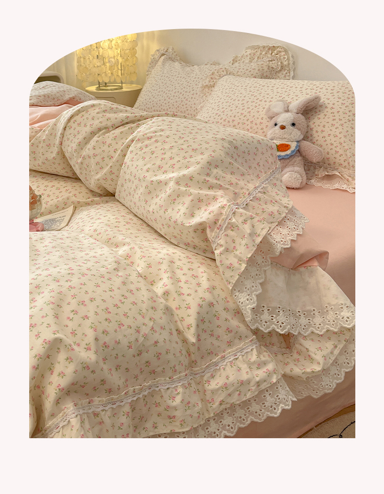 当前位置: 91家纺网 > 商品网购 > 床品套件 > 四件套 > 全棉普通四件套 > 蓝邻家纺 2025年新款全棉法式清新公主风双层花边四件套系列 嫣然-粉