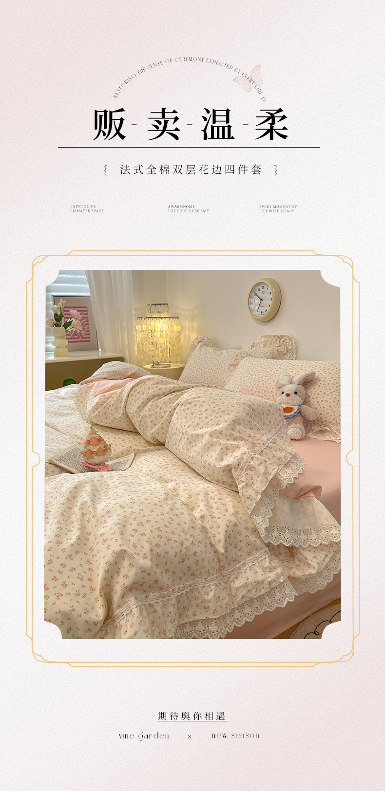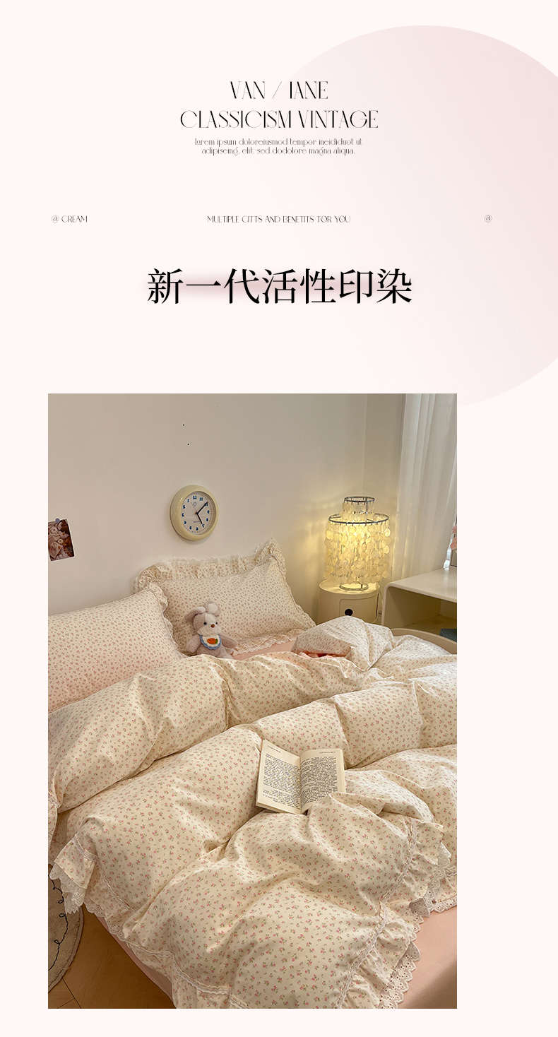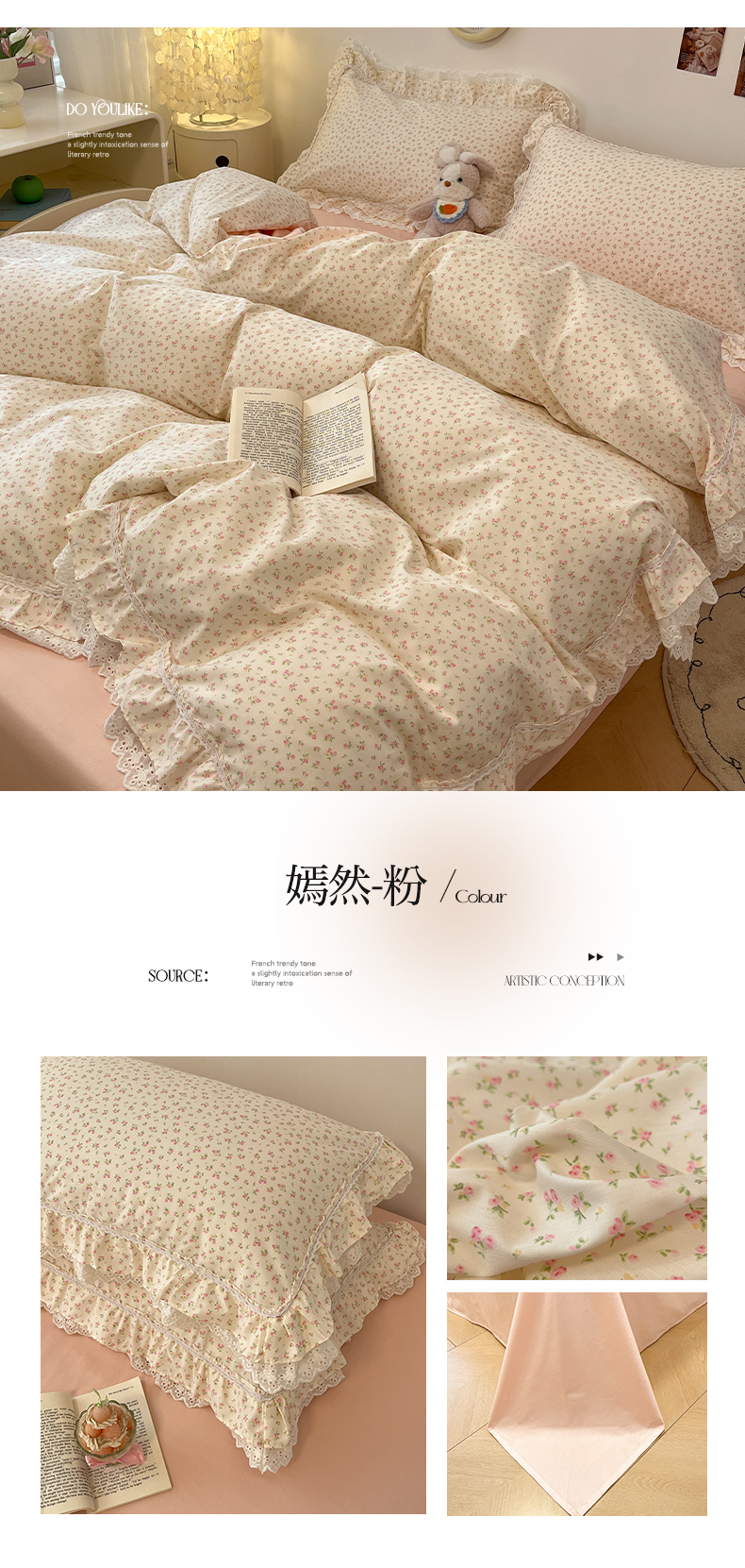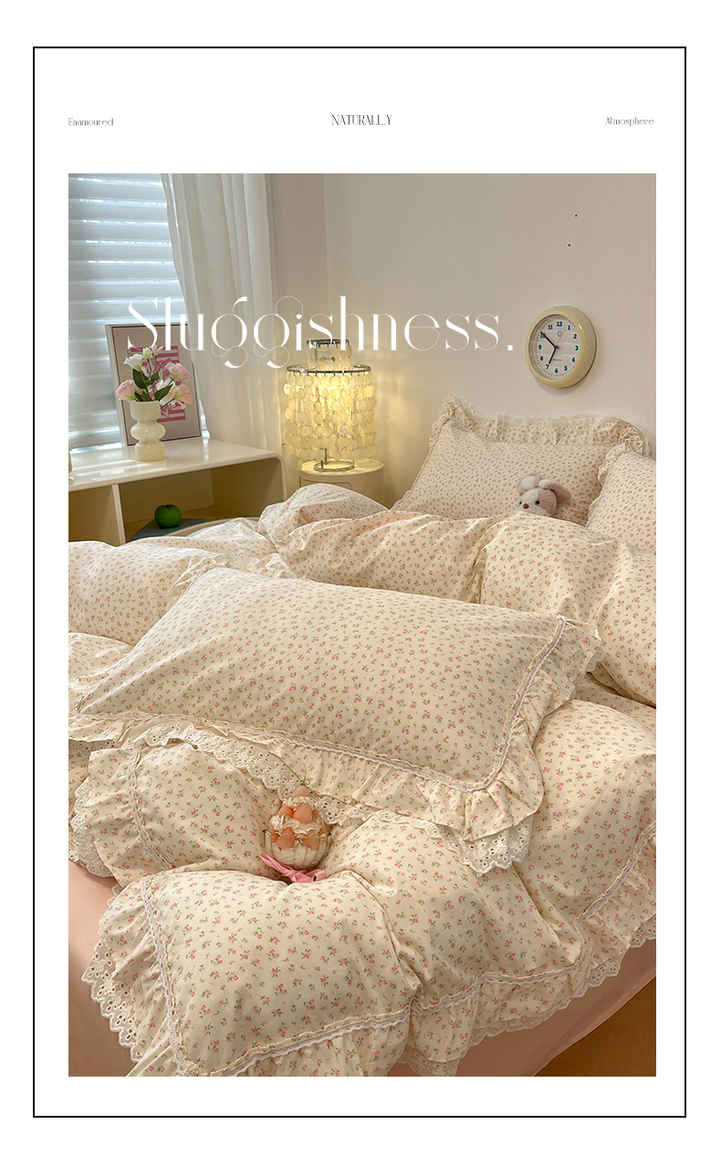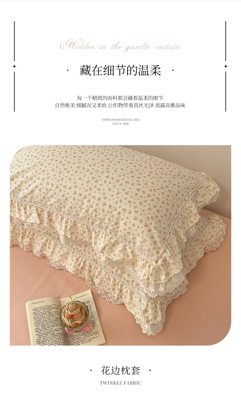 当前位置: 91家纺网 > 商品网购 > 床品套件 > 四件套 > 全棉普通四件套 > 蓝邻家纺 2025年新款全棉法式清新公主风双层花边四件套系列 嫣然-粉