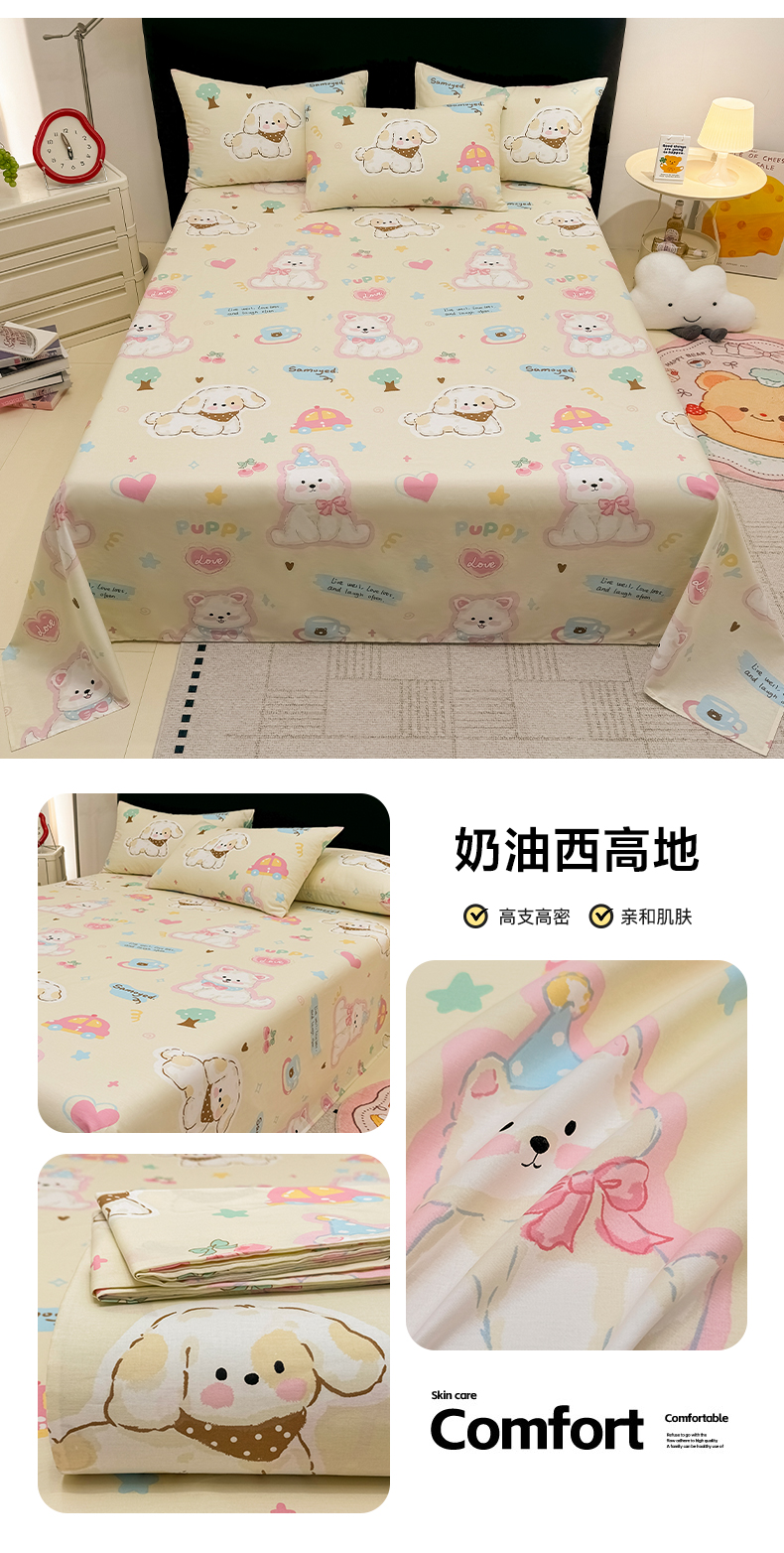 木堇家居 2025新款春夏全棉小清新卡通床单床笠枕套单品系列-床单系列 奶油西高地