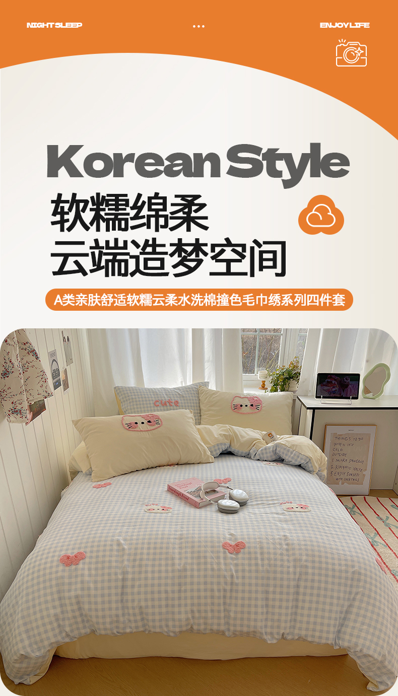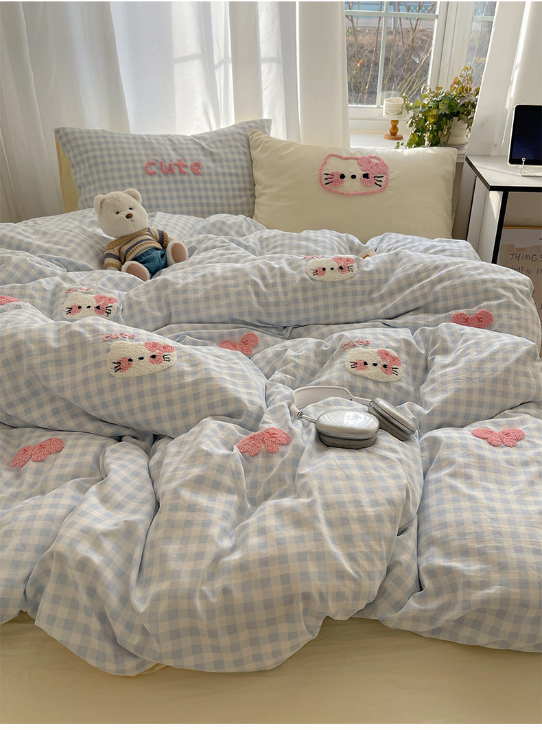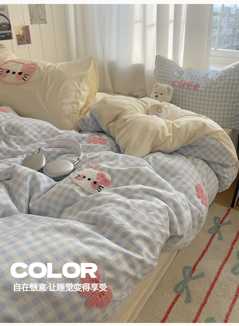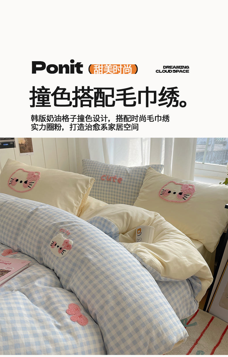 当前位置: 91家纺网 > 商品网购 > 床品套件 > 四件套 > 水洗棉四件套 > 桃心家居 2025新款A类亲肤舒适软糯云柔水洗棉奶油格子撞色毛巾绣猫咪蝴蝶结水洗棉系列四件套 云柔水洗棉-蝴蝶结猫咪蓝黄