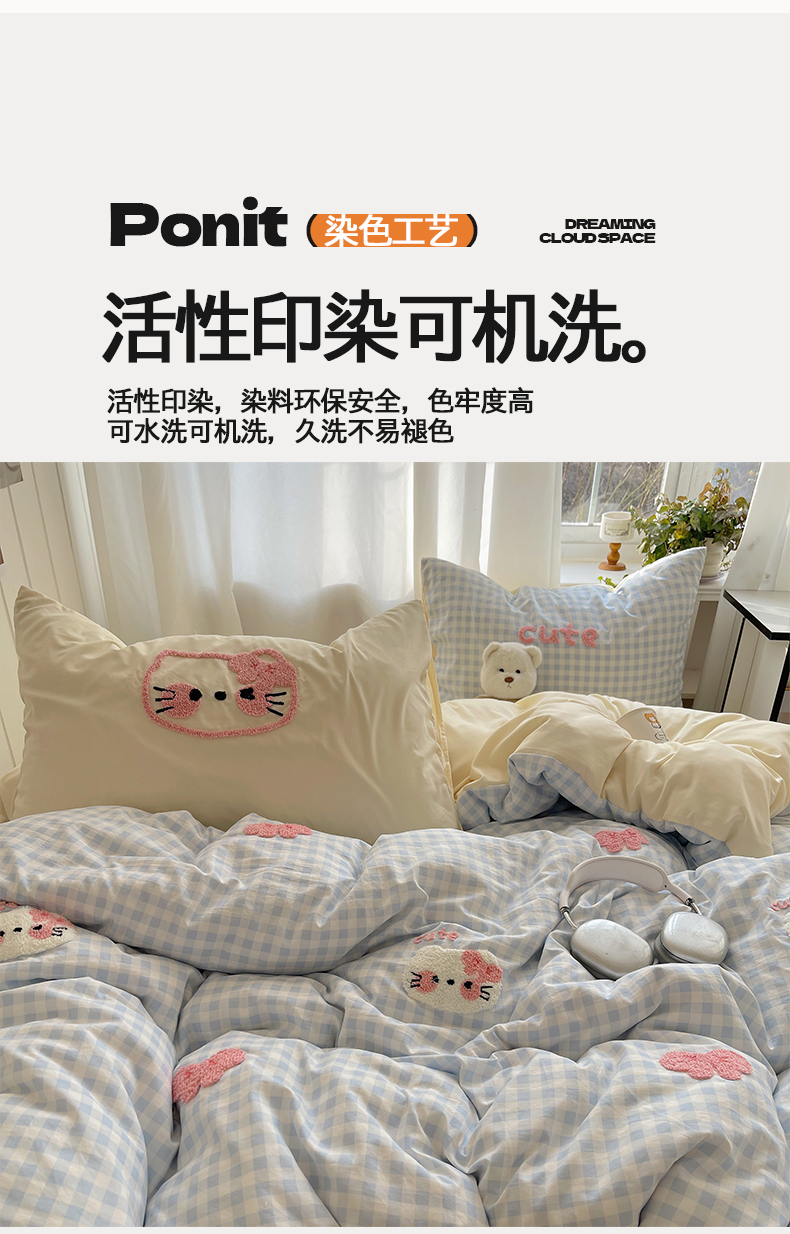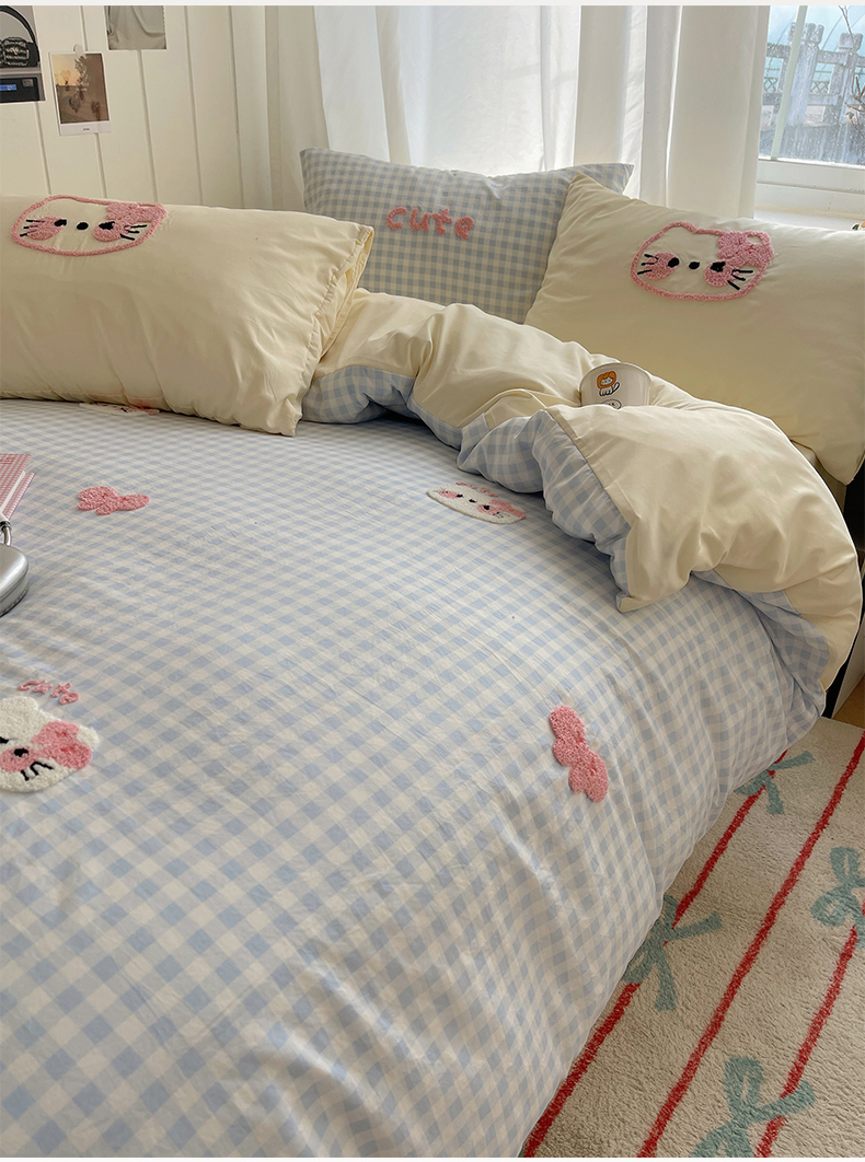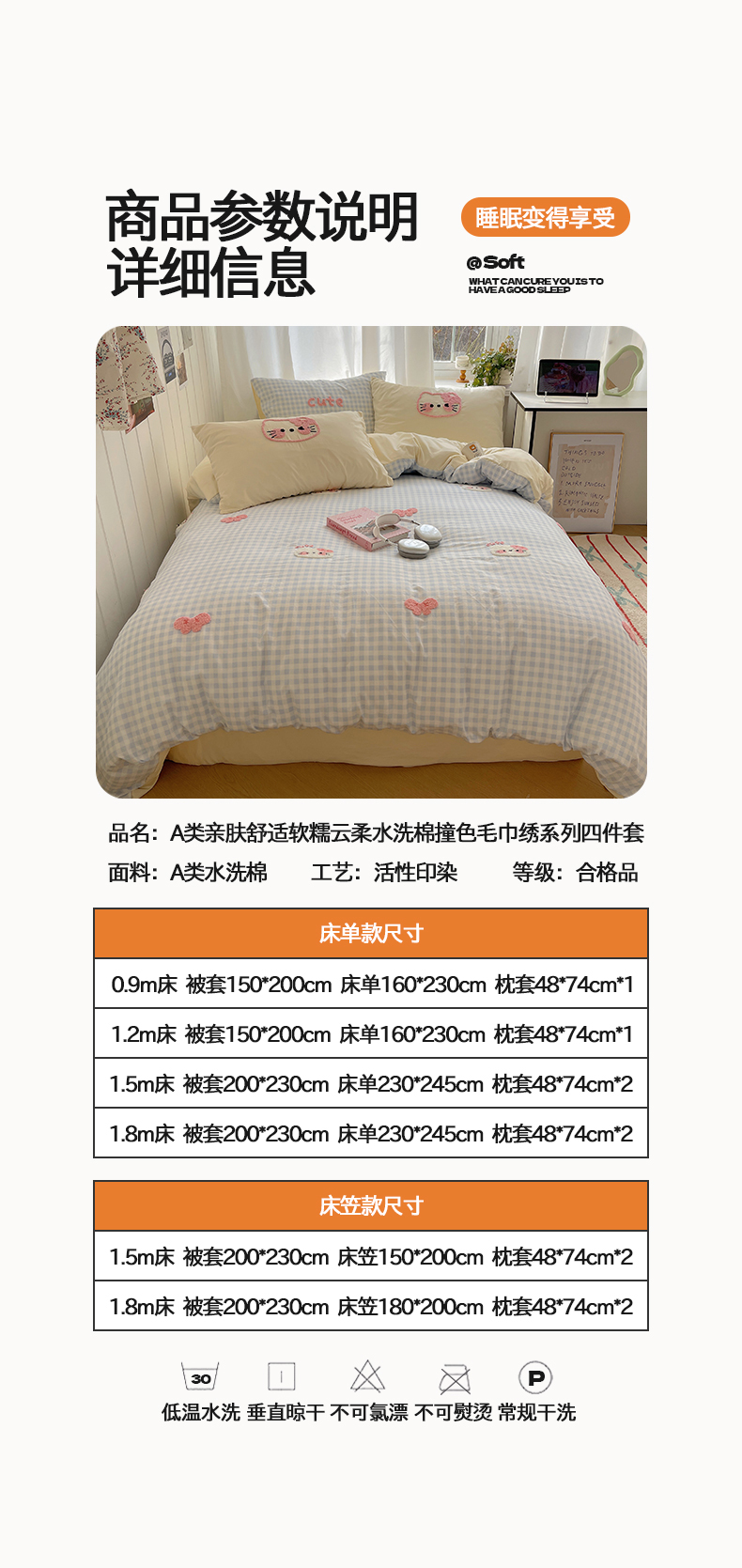 当前位置: 91家纺网 > 商品网购 > 床品套件 > 四件套 > 水洗棉四件套 > 桃心家居 2025新款A类亲肤舒适软糯云柔水洗棉奶油格子撞色毛巾绣猫咪蝴蝶结水洗棉系列四件套 云柔水洗棉-蝴蝶结猫咪蓝黄