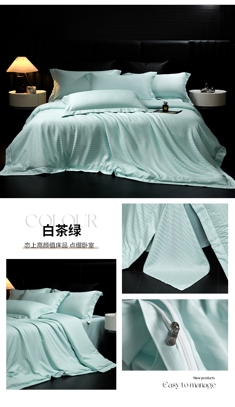 (总)丝印良品 2025新款四季款高端贡缎条纹水洗真丝四件套,白茶绿,景泰蓝,香槟金,香芋粉,象牙白
