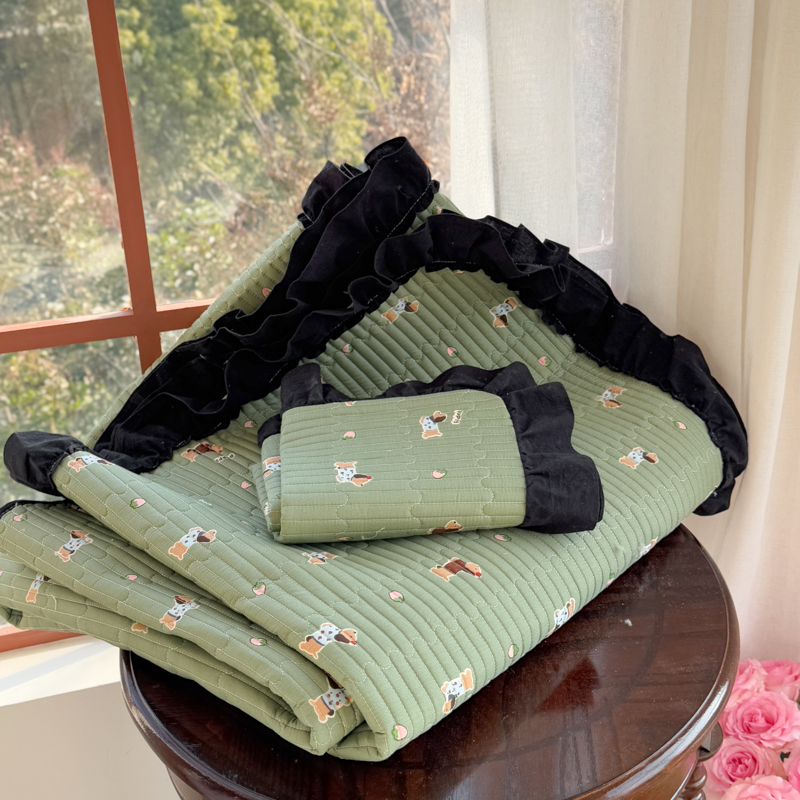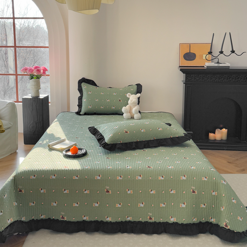 • 91家纺网 家纺一手货源 找家纺 金丝鸟 2025全棉黑色花边款韩式床盖 绿色斑点狗