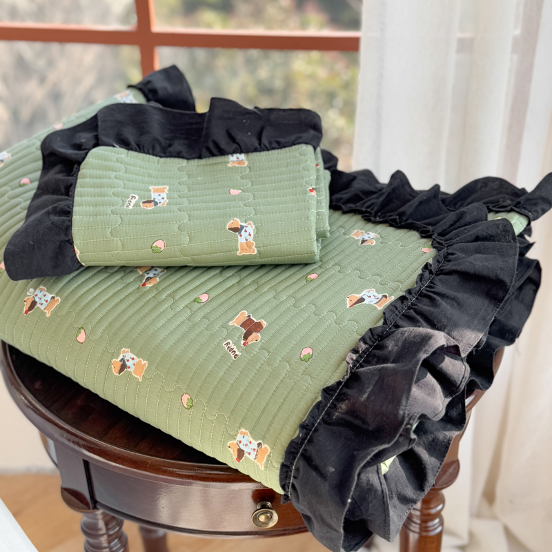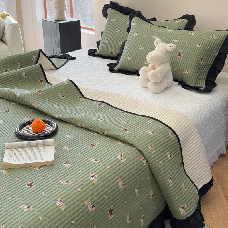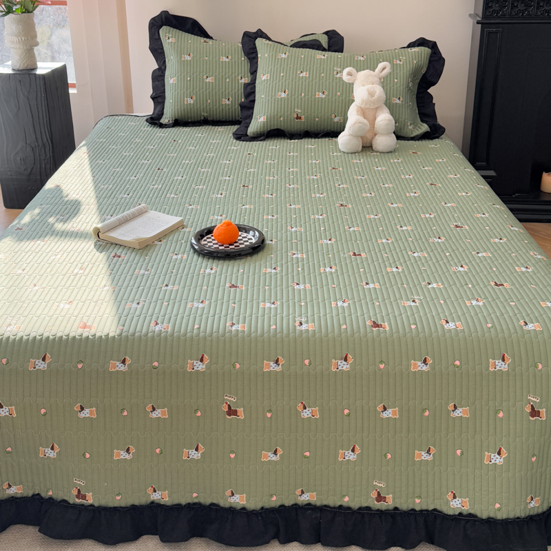 金丝鸟 2025全棉黑色花边款韩式床盖 绿色斑点狗