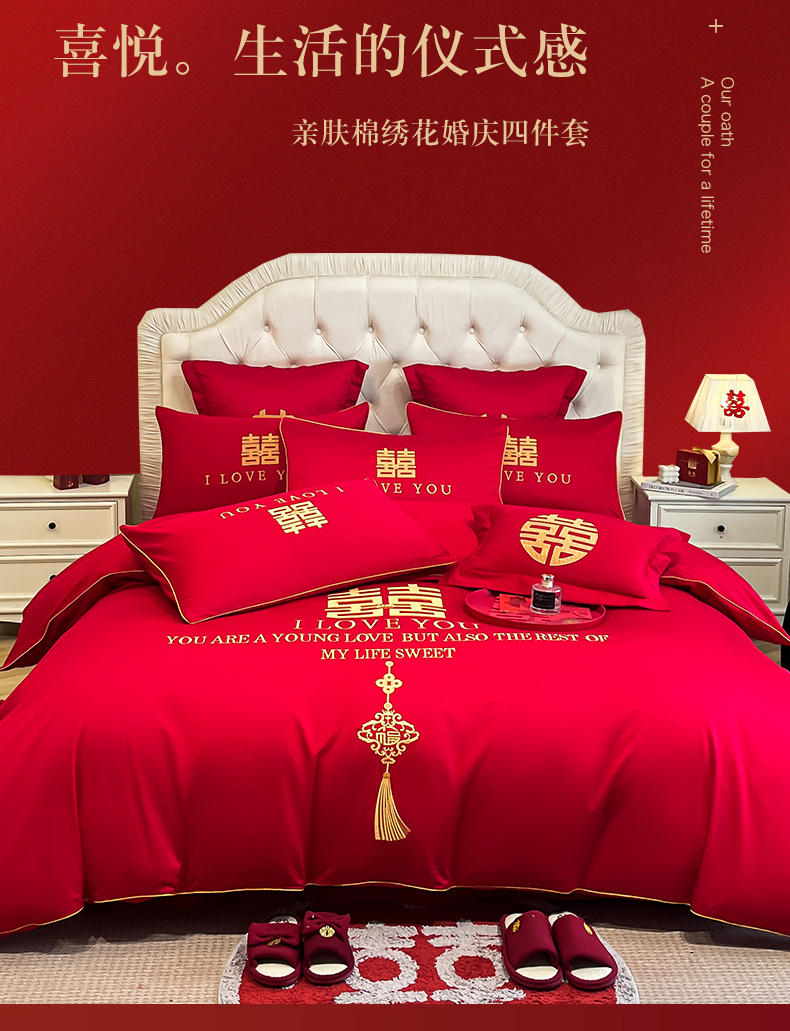 (总)欧乐蒂 2025新款婚庆款牛奶绒刺绣系列四件套-爱相随,爱相随-喜红,爱相随-金