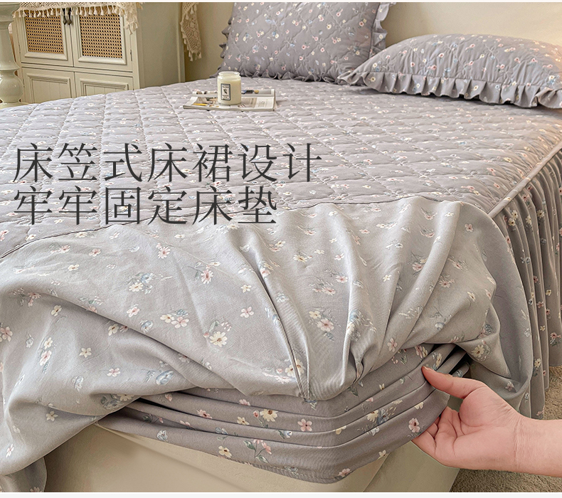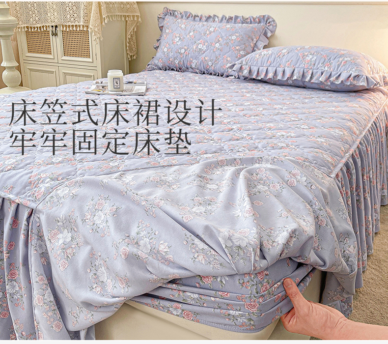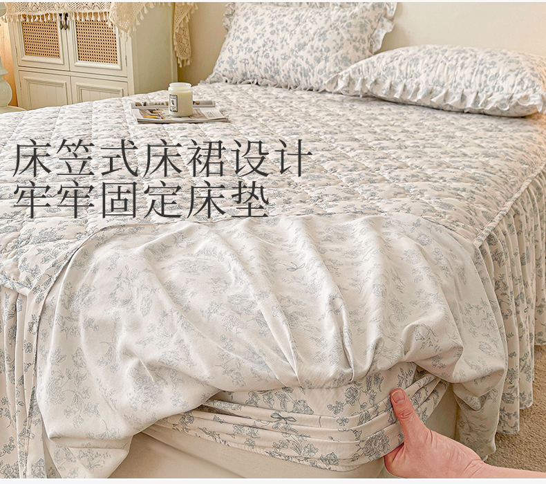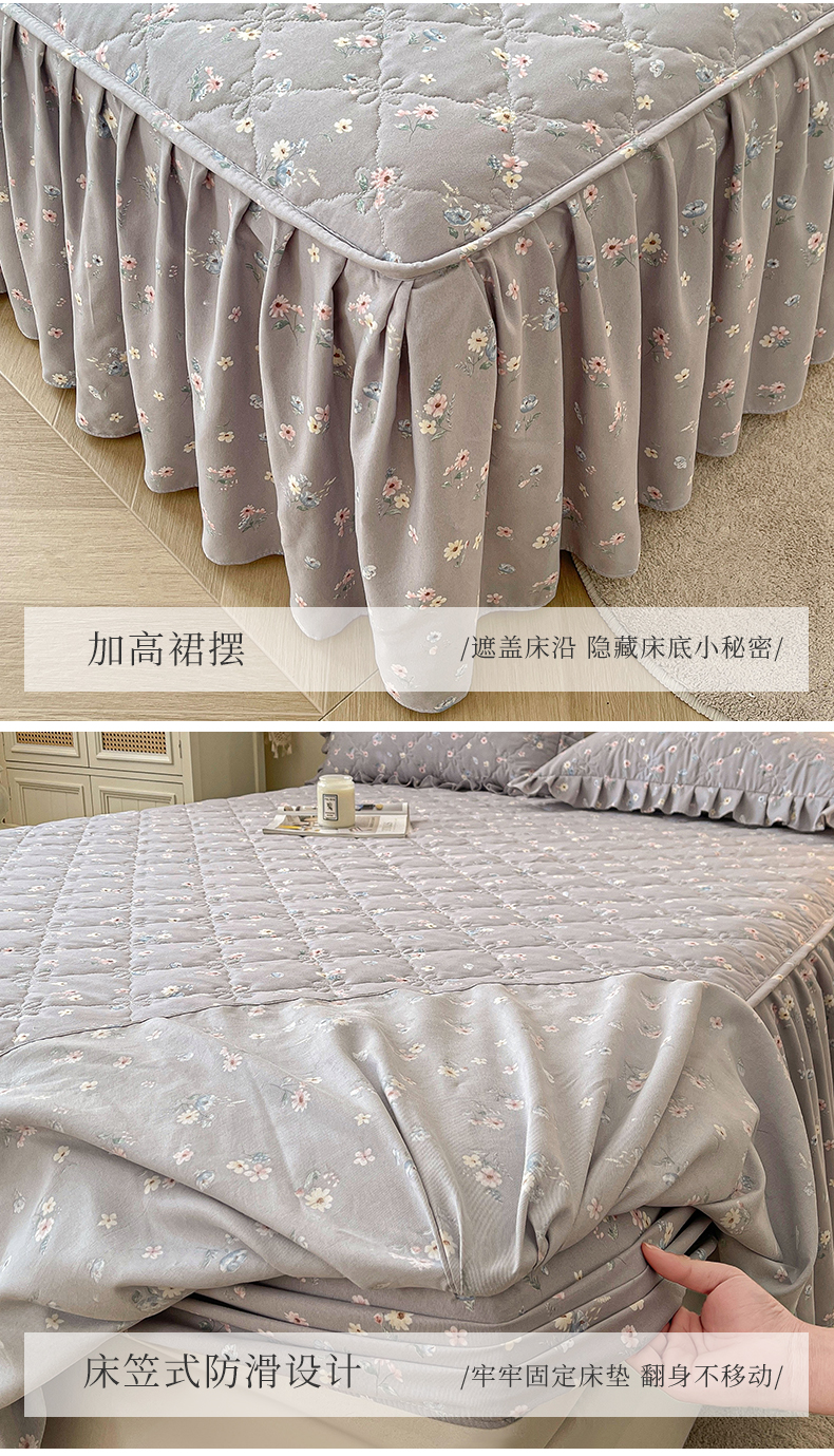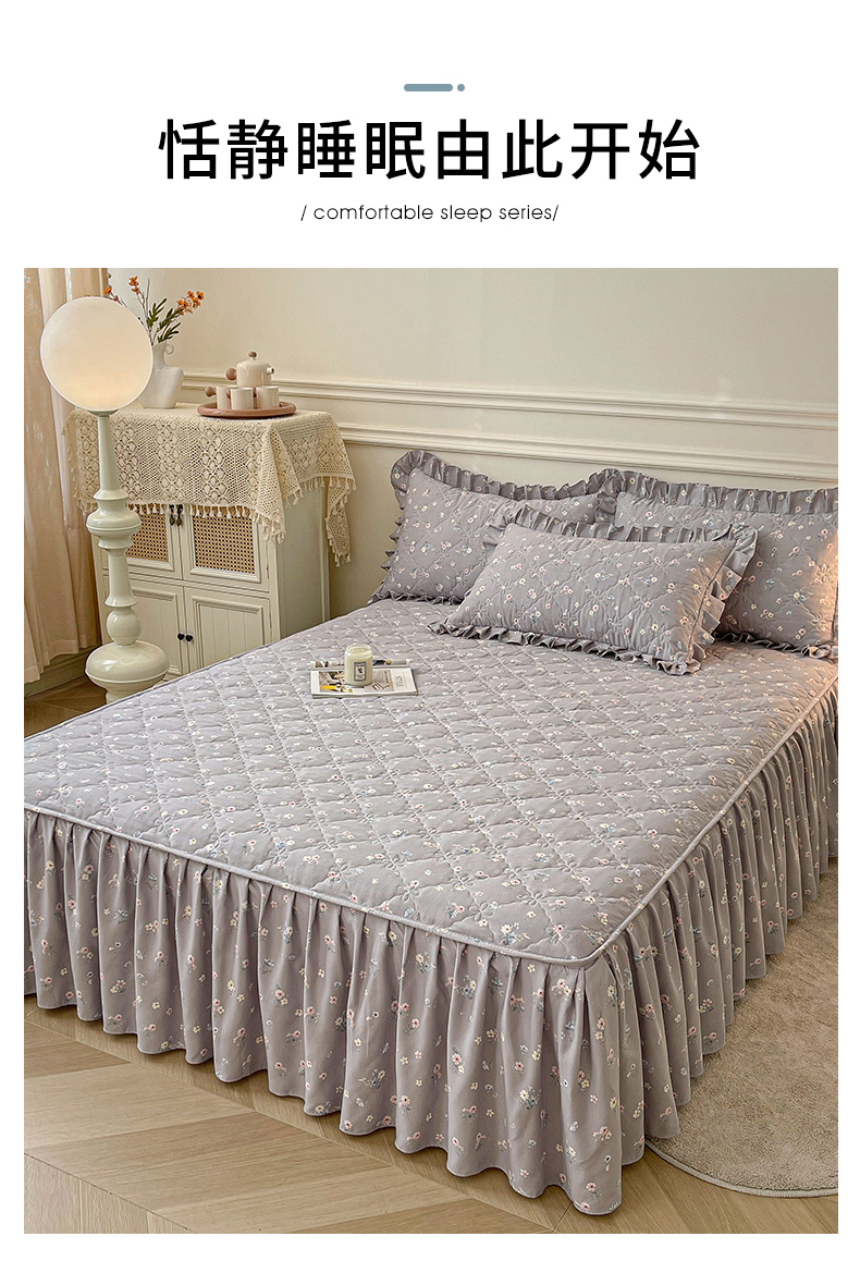 (总)十个点家纺 2025新款千鸟格磨毛绗缝夹棉纯色花边床裙三件套,经典白色,经典兰色,经典浅灰,经典浅驼,经典深灰,经典玉粉