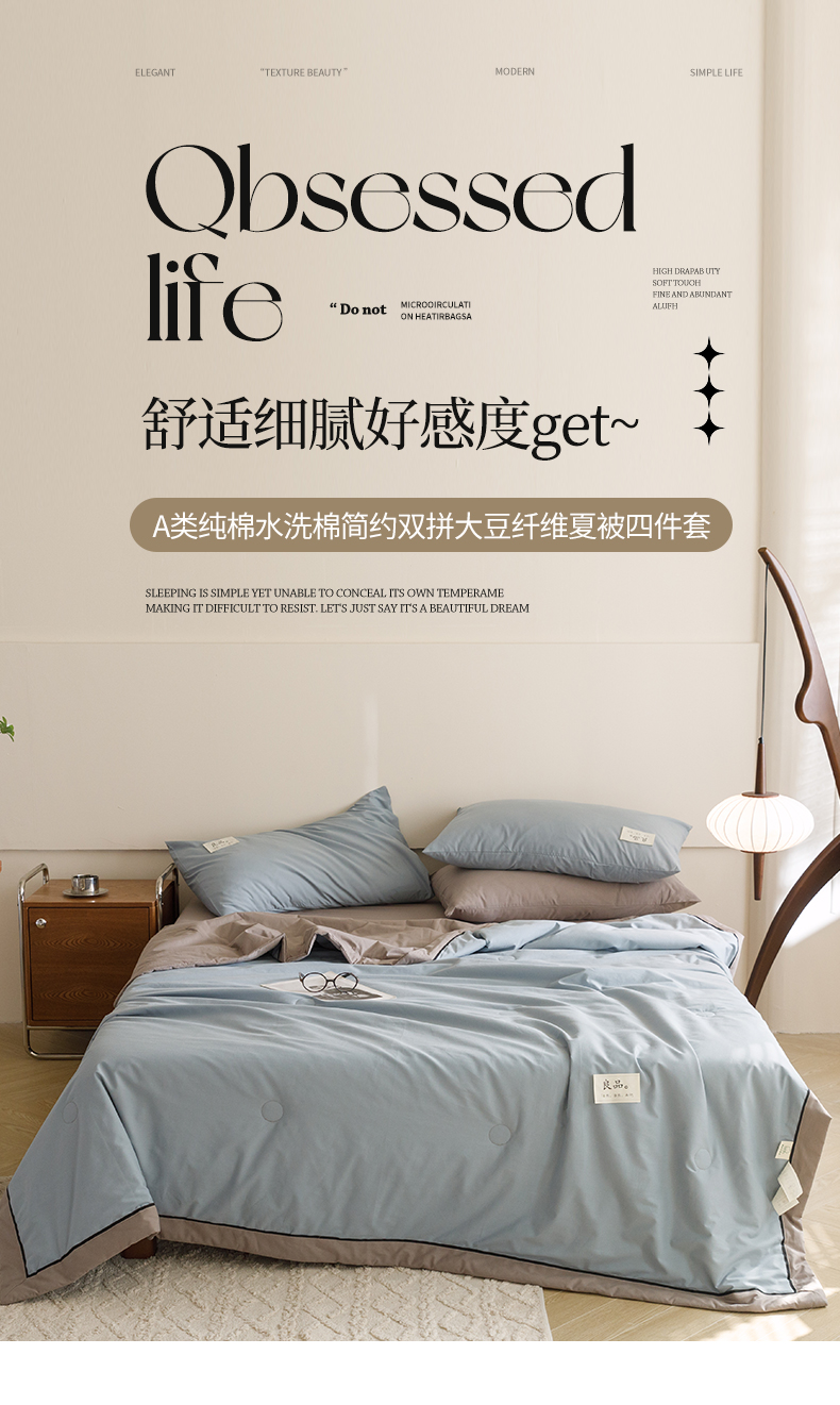 • 91家纺网 家纺一手货源 找家纺 寐绸家纺 2025新款纯棉水洗棉简约双拼大豆纤维夏被四件套 牛仔蓝+浅灰