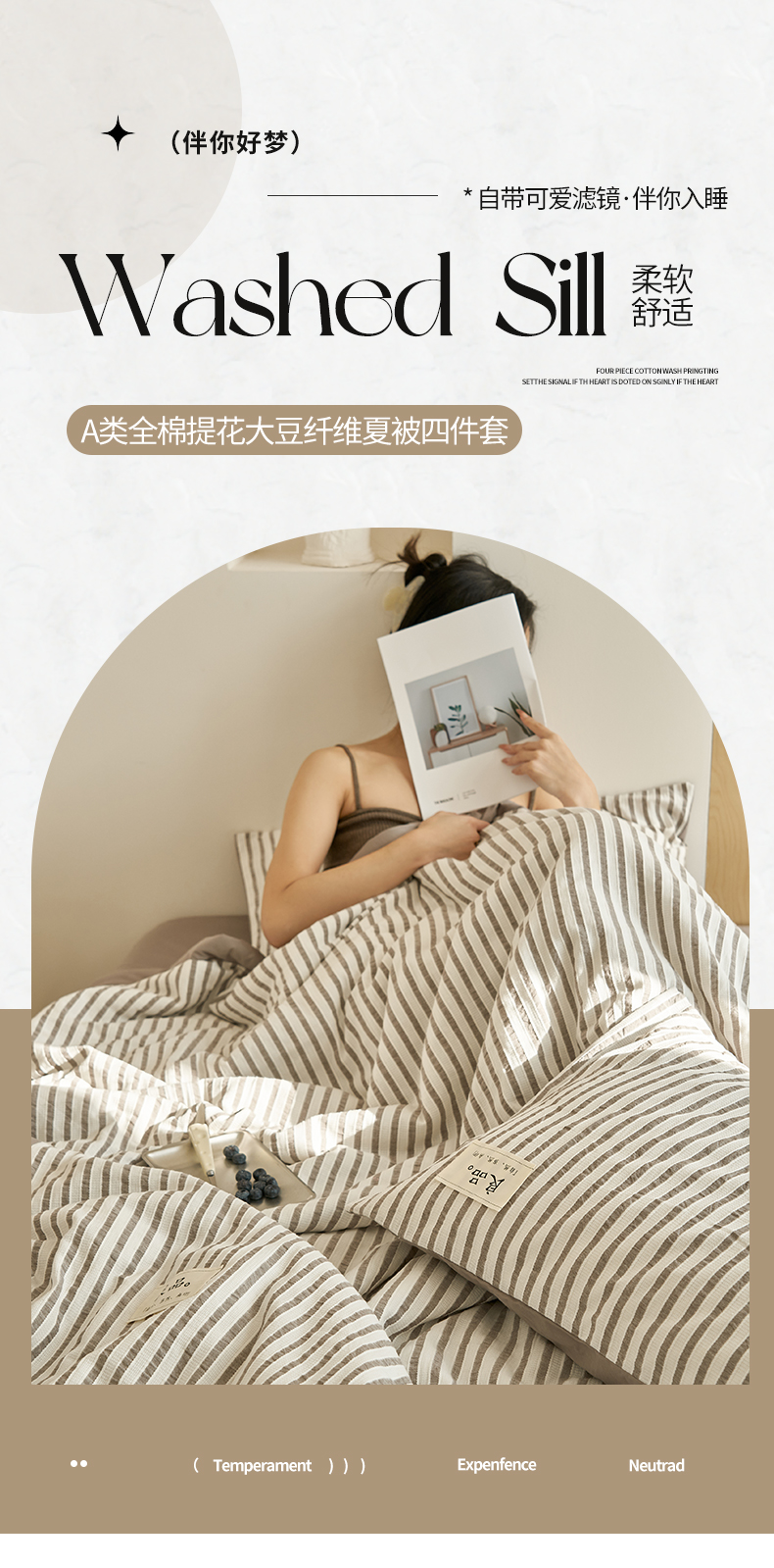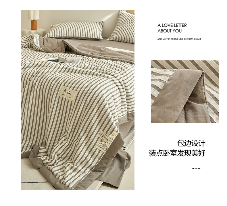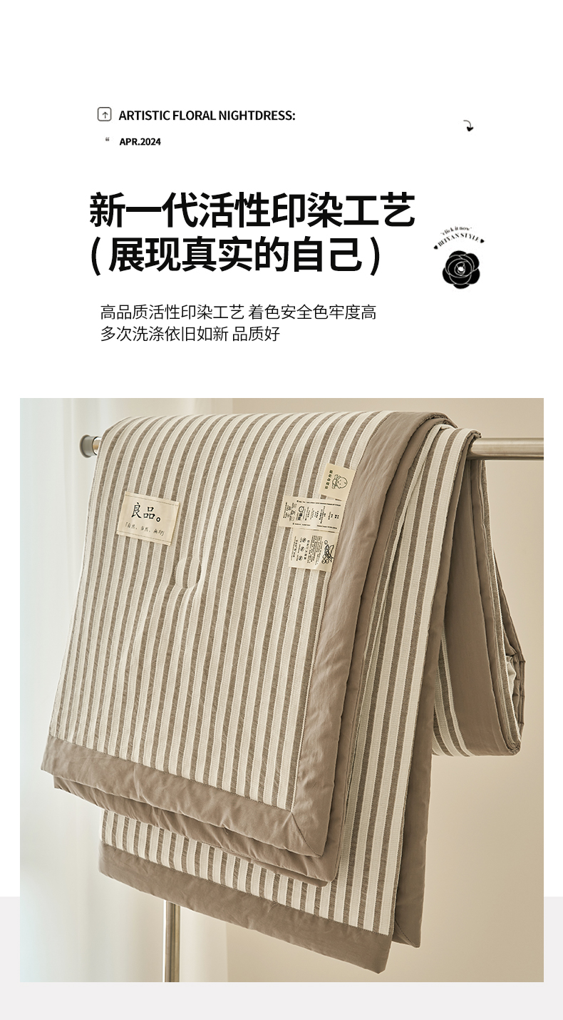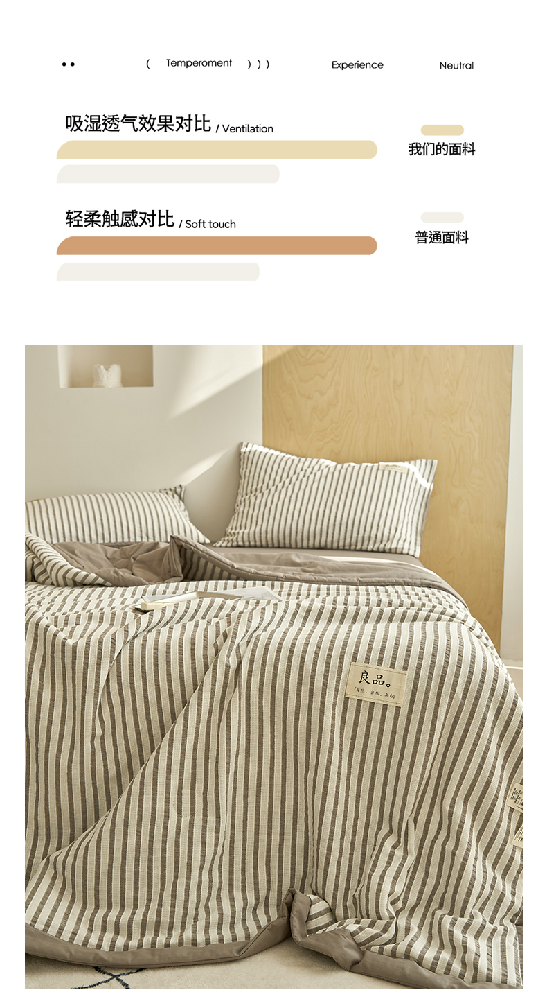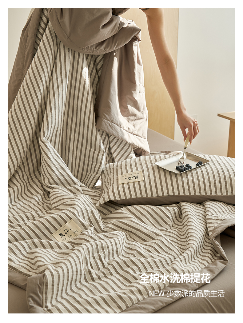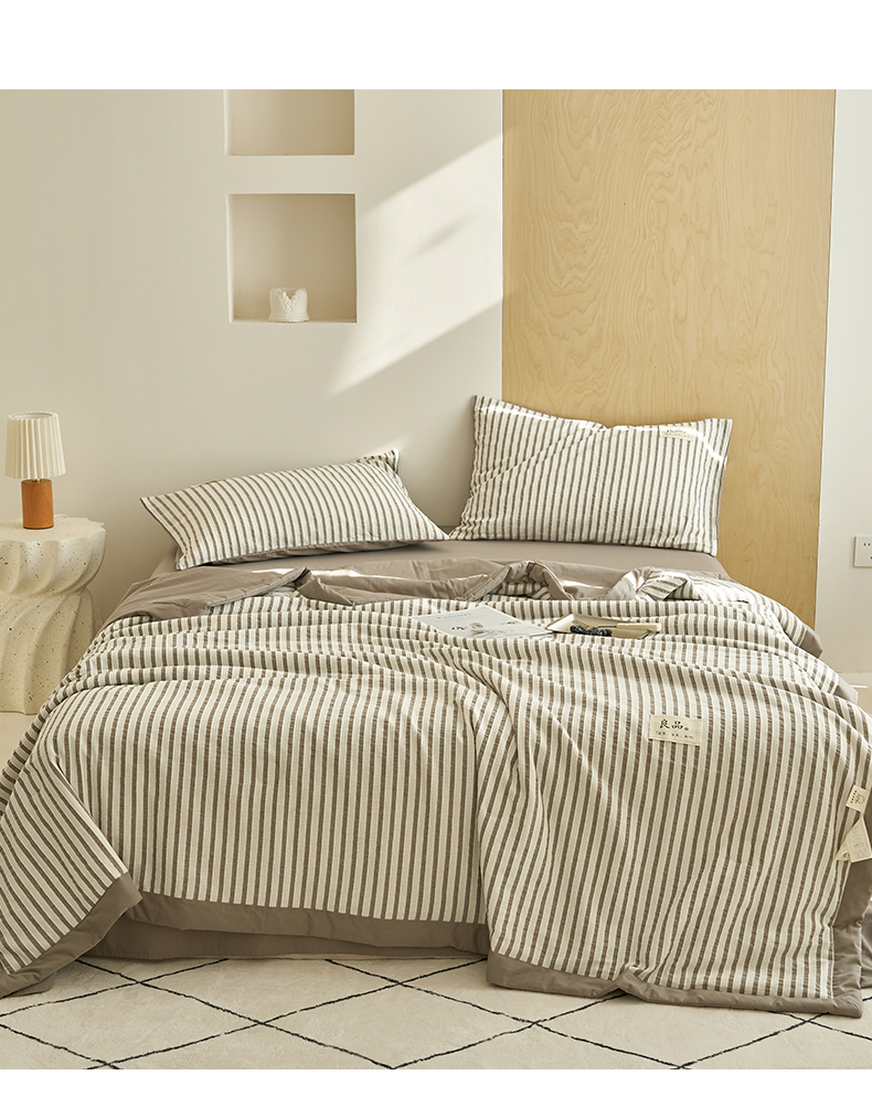 • 91家纺网 家纺一手货源 找家纺 寐绸家纺 2025新款纯棉水洗棉简约条纹提花大豆纤维夏被四件套 简约条纹-驼色