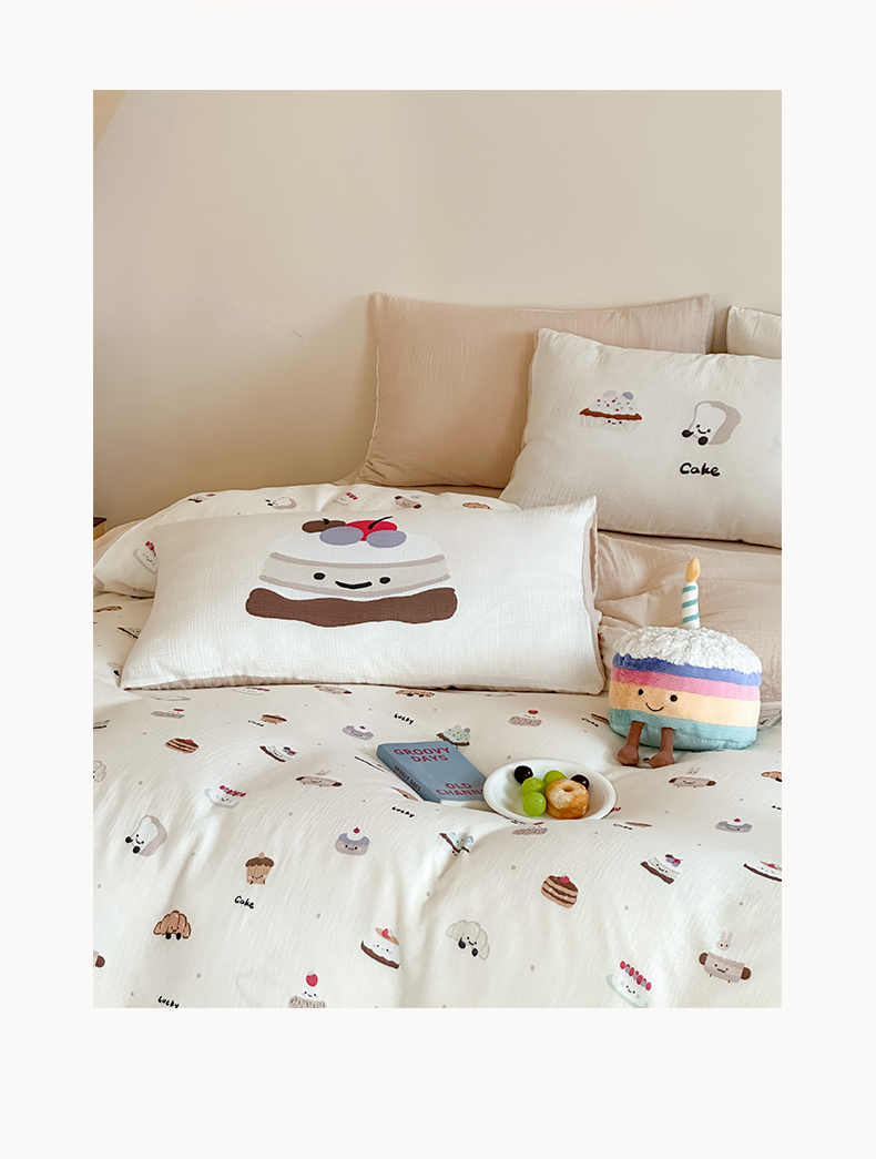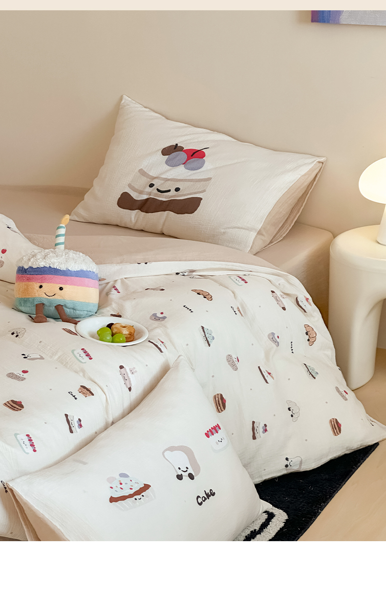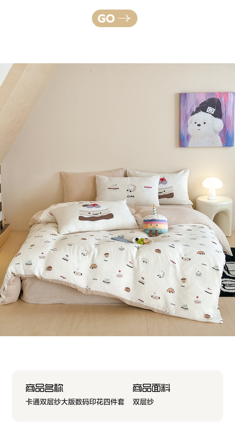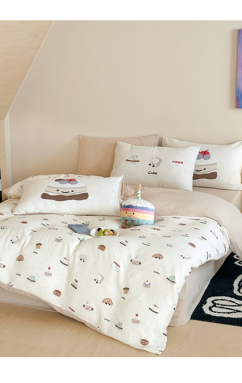 商品名称:卡巴伦家纺 2025新款全棉皱皱纱大版卡通数码印花款四件套二 生日万岁-米