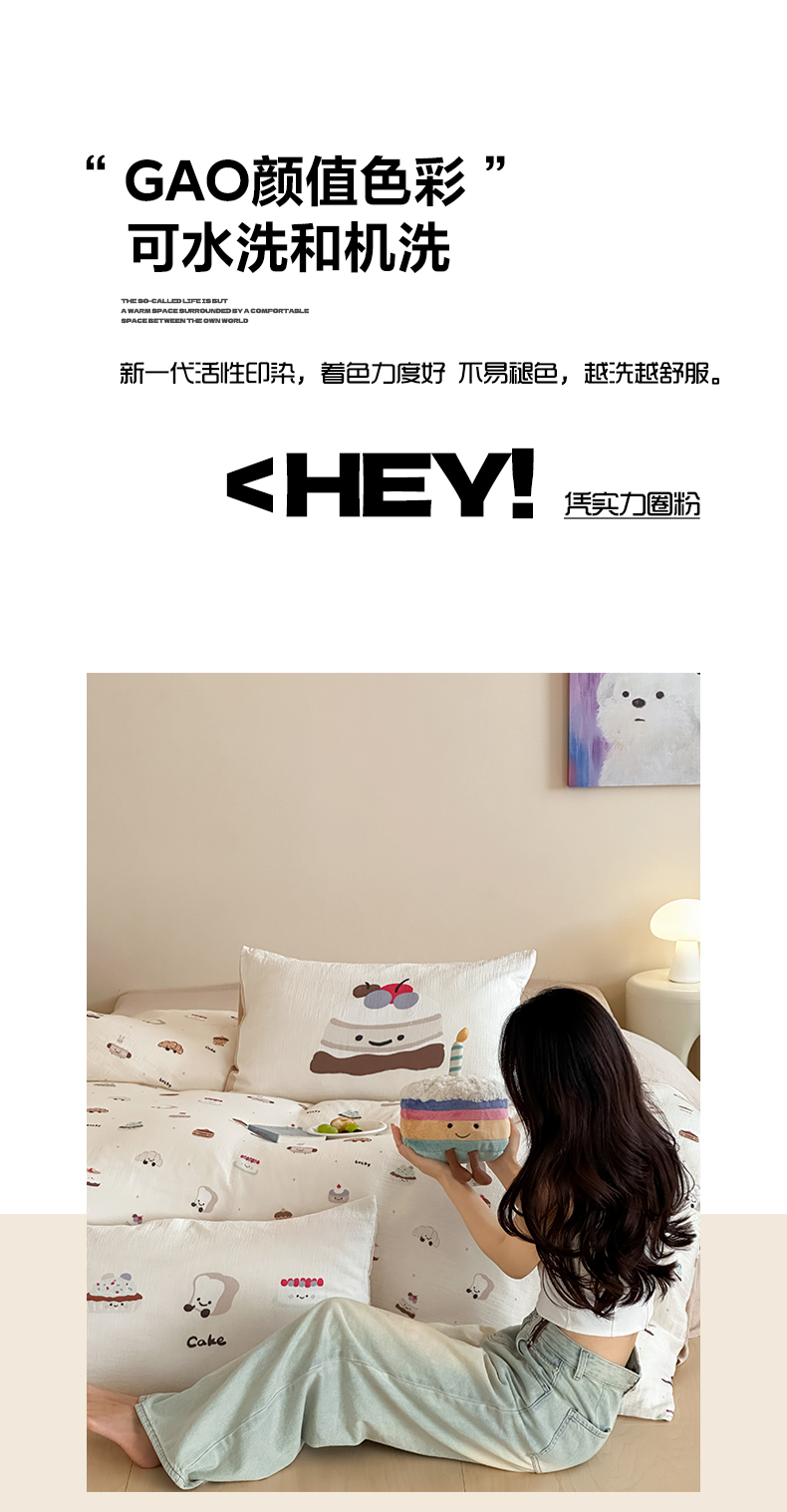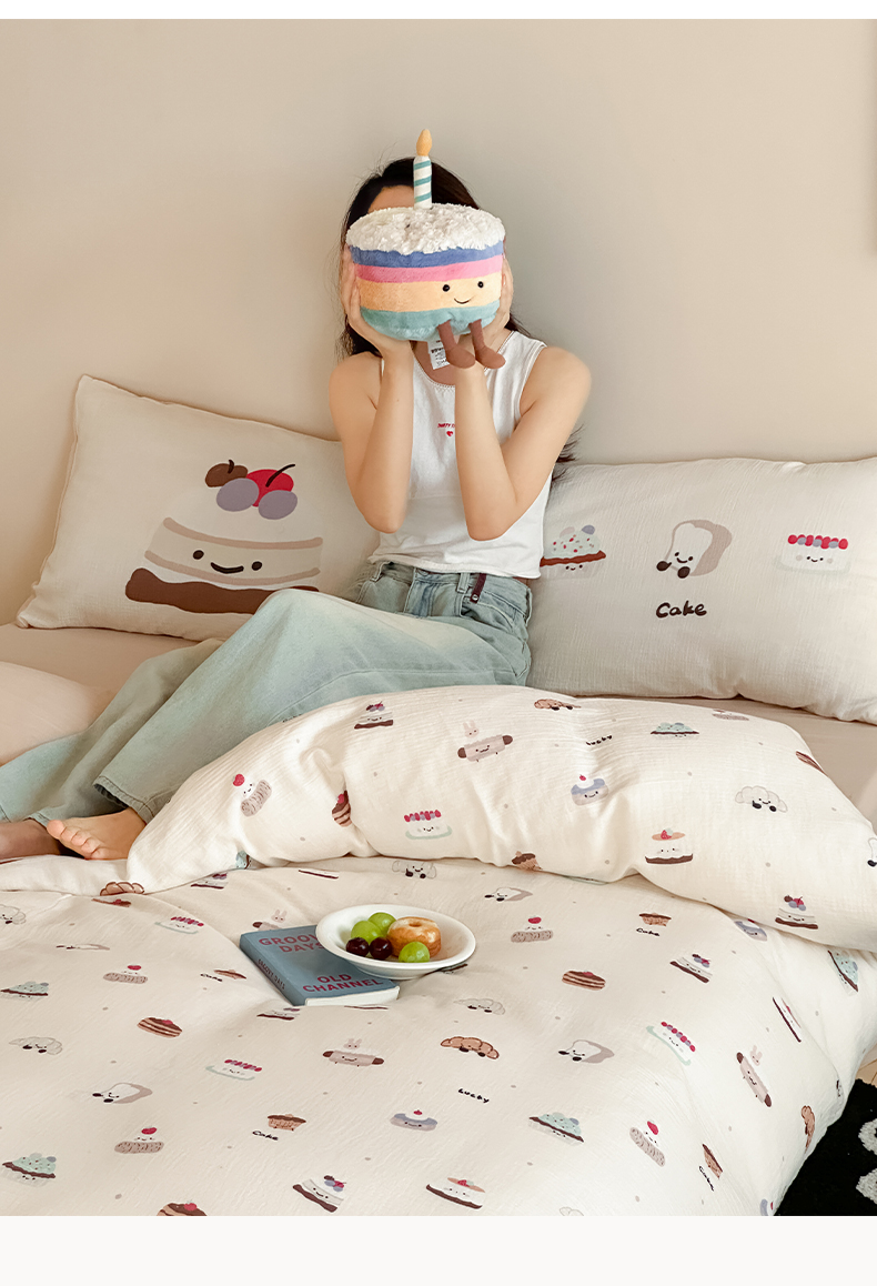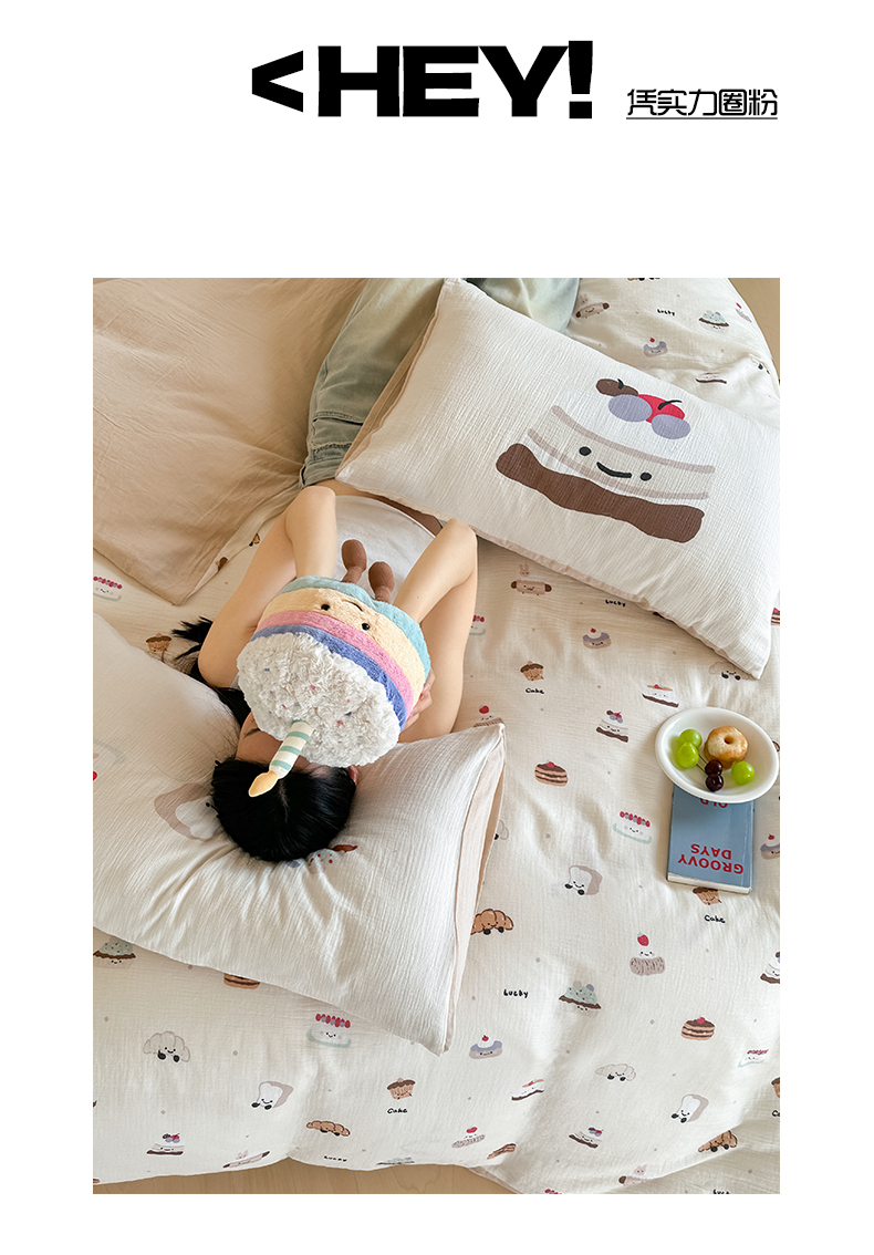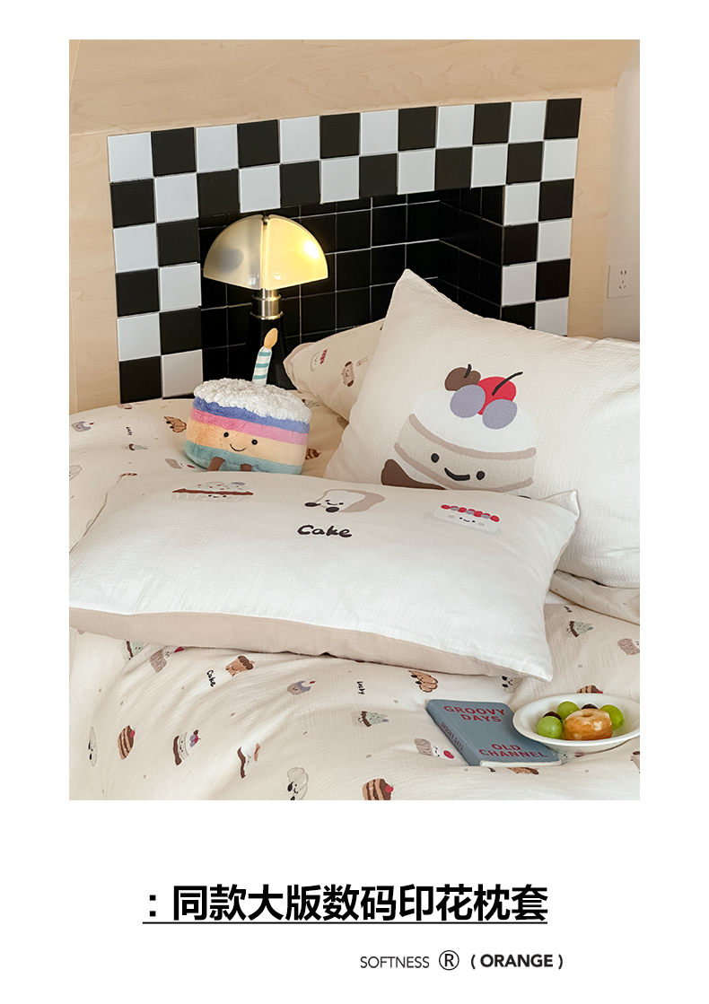 商品名称:卡巴伦家纺 2025新款全棉皱皱纱大版卡通数码印花款四件套二 生日万岁-米