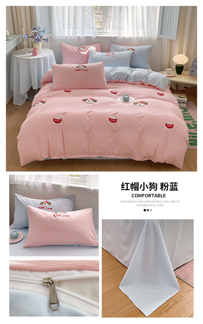 商品名称:星座家纺 2025新款水洗棉毛巾绣四件套 红帽小狗 粉蓝